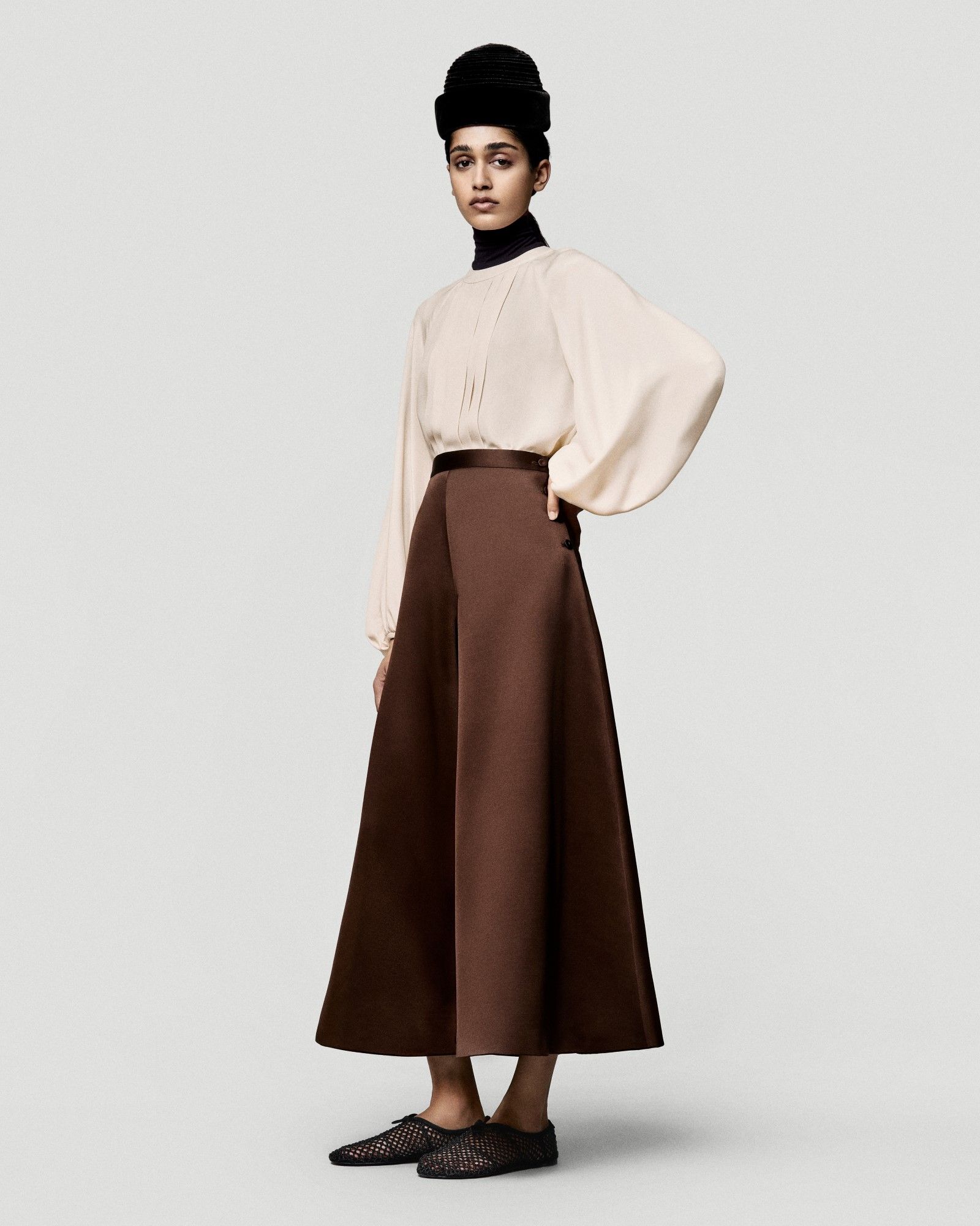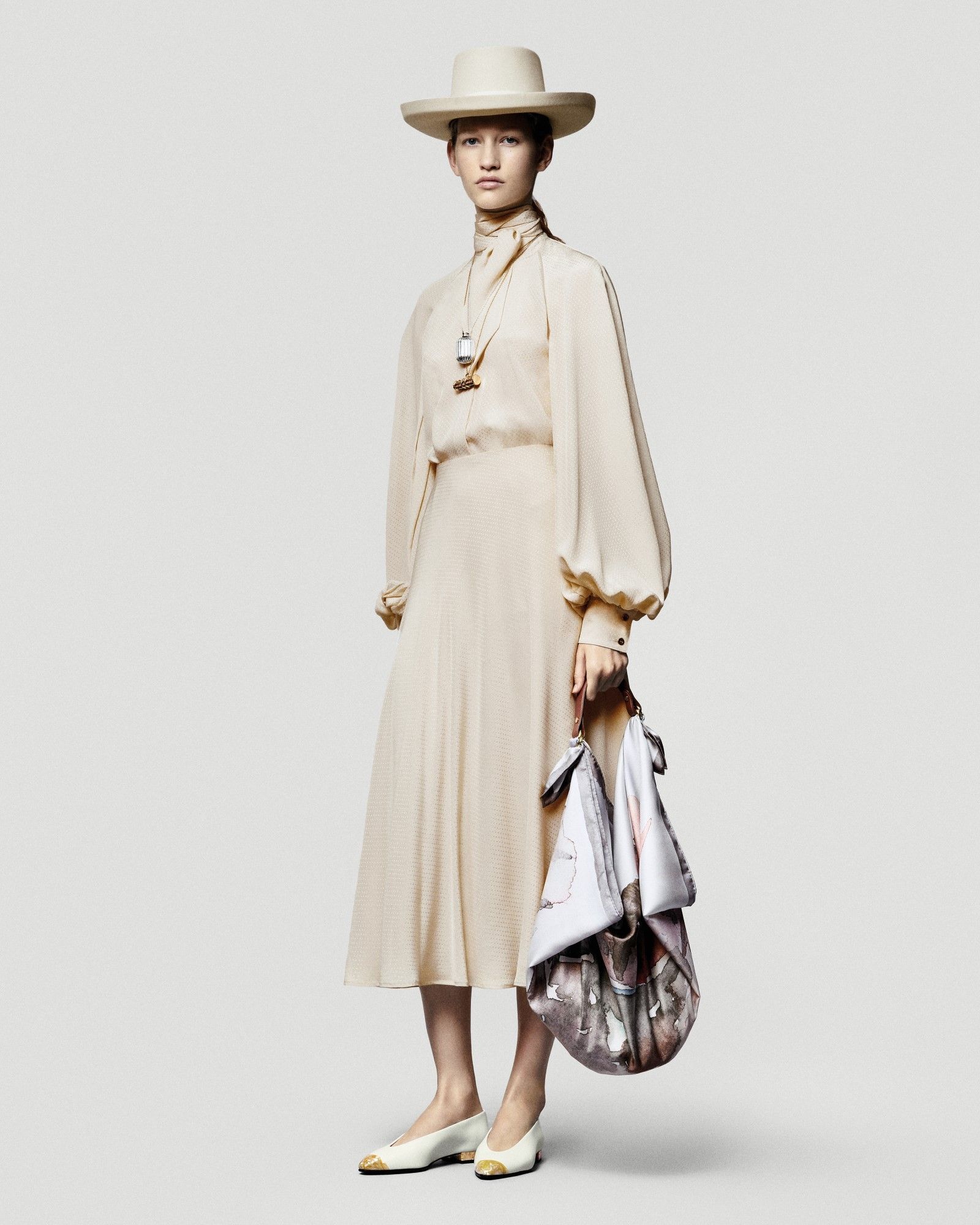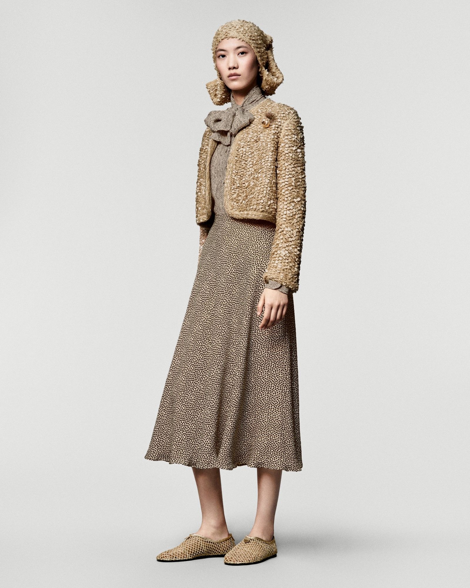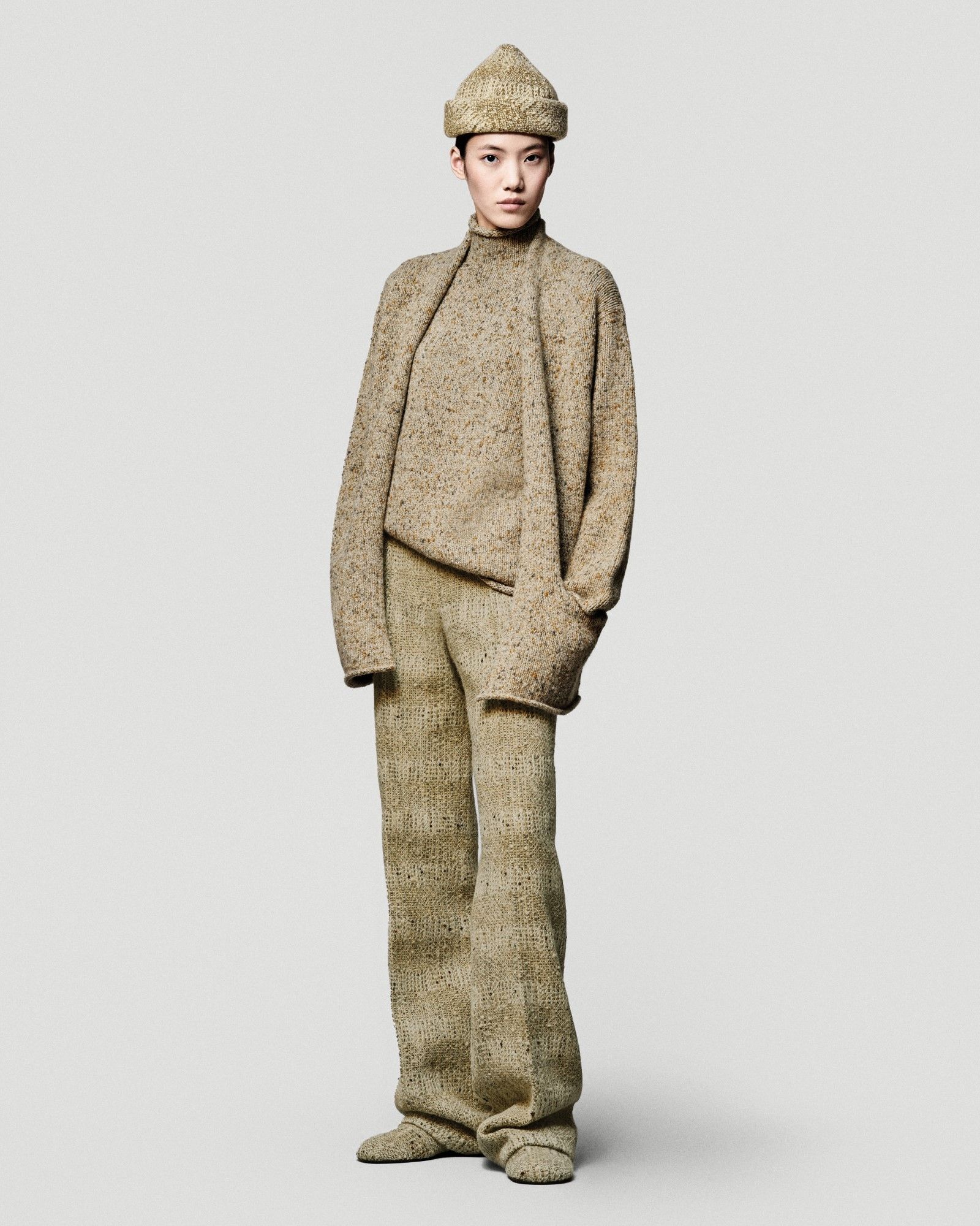 This season’s women’s collection is infused with a cosmopolitan spirit that spans Argentina, the Scottish Highlands, and the vast landscapes of Australia and New Zealand. Each piece tells a story of returning to the roots, with silhouettes that embrace the body’s movement and functional details inspired by equestrian traditions. Skirt-pants pay homage to Argentine heritage, while fabrics—ranging from bouclé to Merino wool, silk, and cashmere—are dyed in natural tones that highlight Loro Piana’s intricate dyeing techniques: dark brandy, vintage brown, creamy vanilla, vicuña, and navy blue. The iconic Spagna jacket is reimagined in a cropped version and as a pencil coat. Layered outfits play with ombré effects, while eveningwear channels the elegance of the opera with satin silk and jacquard in classic black and white. Accessories complete the look with soft bags like the new Extra Bag L23 and the Needle Bag, inspired by knitting needle cases, alongside equestrian boots crafted in collaboration with Le Chameau.
