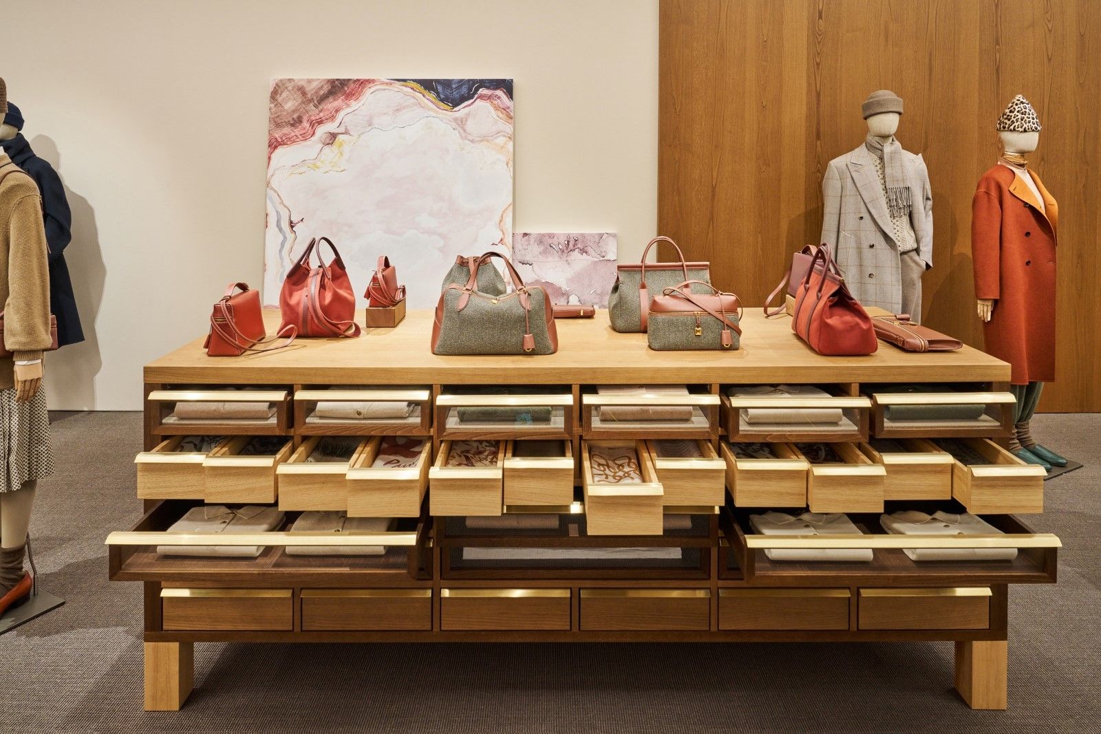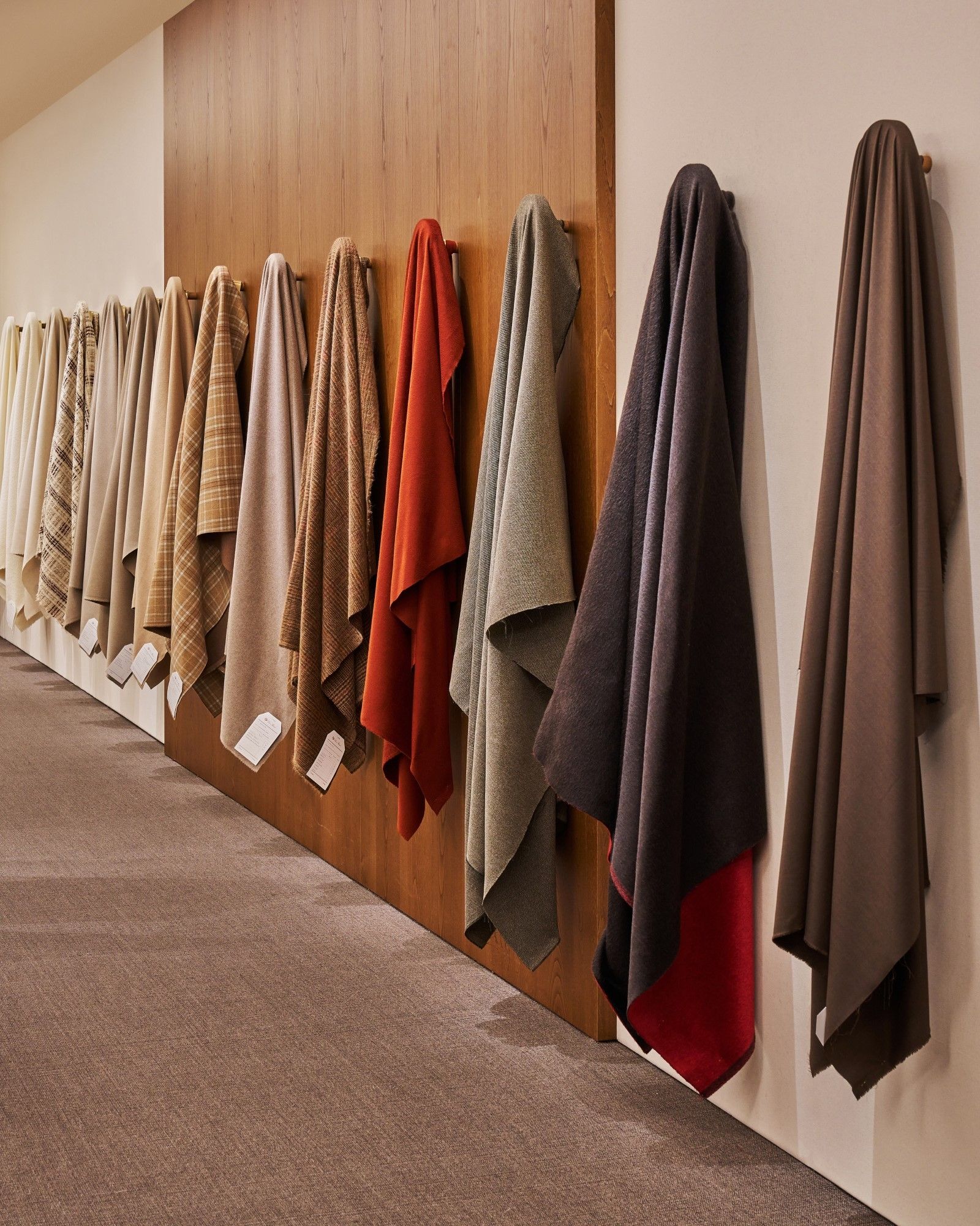 For the presentation at Cortile della Seta, there are two main areas: a central space dedicated to the FW25-26 collection and a room celebrating the new Royal Lightness excellence. The setup, crafted with natural materials such as walnut wood, sisal carpeting, brass, travertine, and smoked glass, creates an organic continuity between the spaces, immersing visitors in a fully sensory experience. The scenography evokes an artist’s studio: wooden easels display watercolors inspired by the landscapes of Argentina, the Scottish Highlands, Australia, and New Zealand—lands from which the Maison sources both raw materials and inspiration. Wooden drawers reveal bags and accessories, while soft blankets, casually draped, enhance the artistic aesthetic of the environment. The second room is dedicated to textile innovation with the introduction of Royal Lightness, an ethereal fiber that blends the finest mulberry silk with Merino wool for yarn, and silk with cashmere for fabric. Working with materials of such delicacy requires unparalleled craftsmanship. The result is garments as light as a feather, structurally intricate yet always delicate. At the center of the room, a machine reveals the enchanting process of fiber blending, offering visitors a glimpse into Loro Piana’s exceptional artisanal expertise and the skill of its craftsmen.