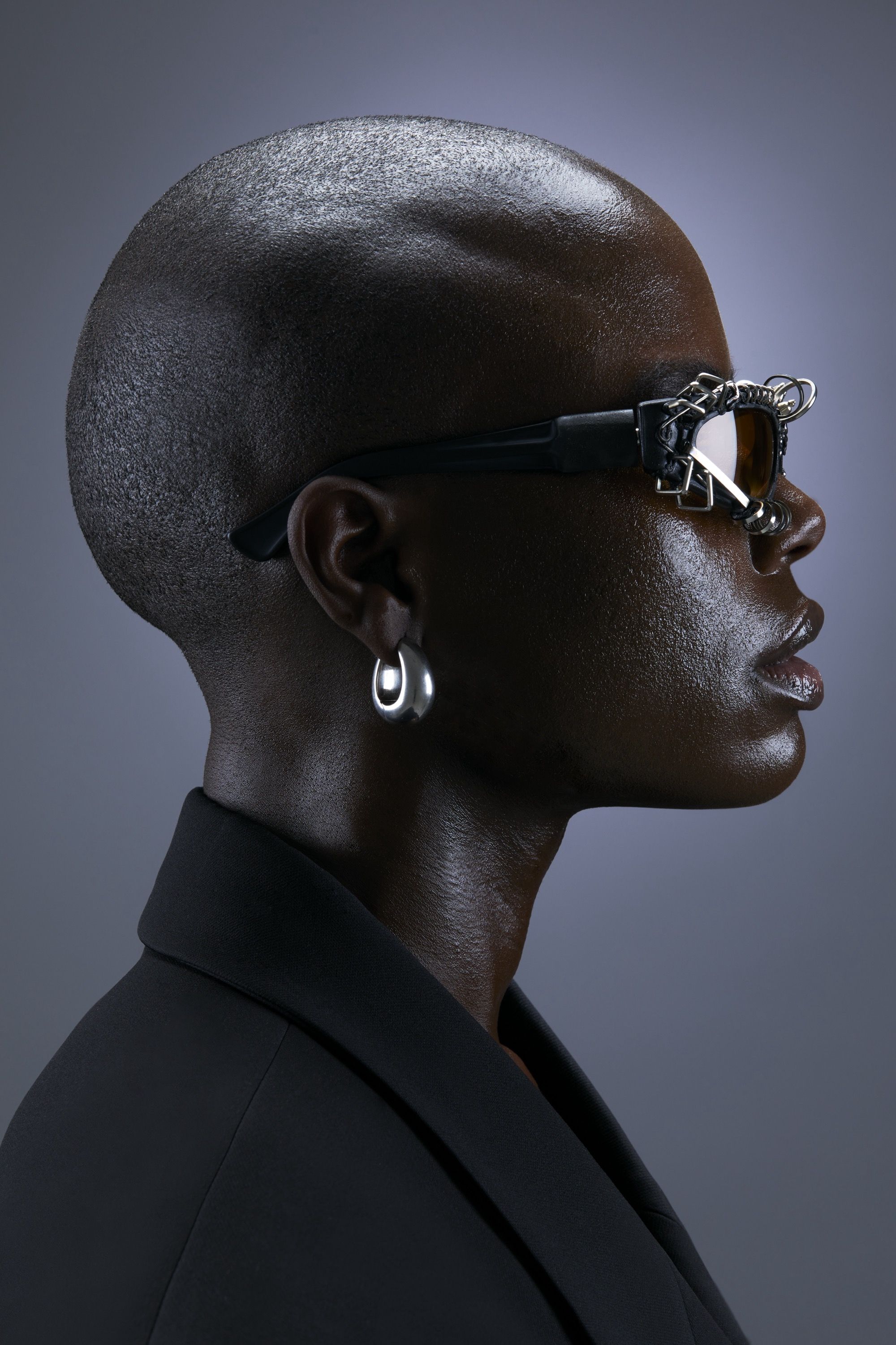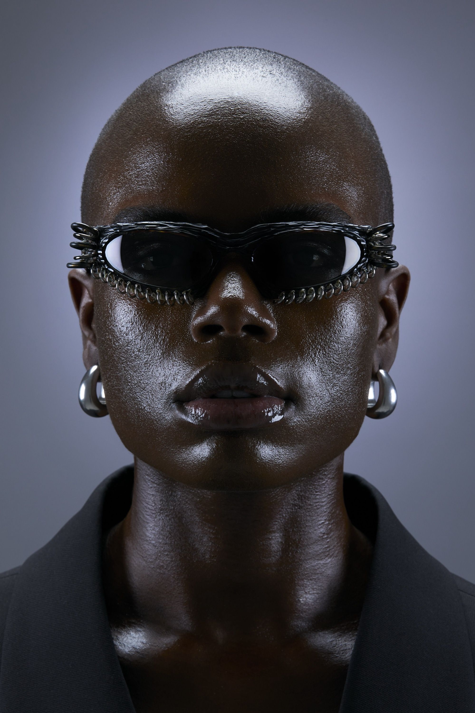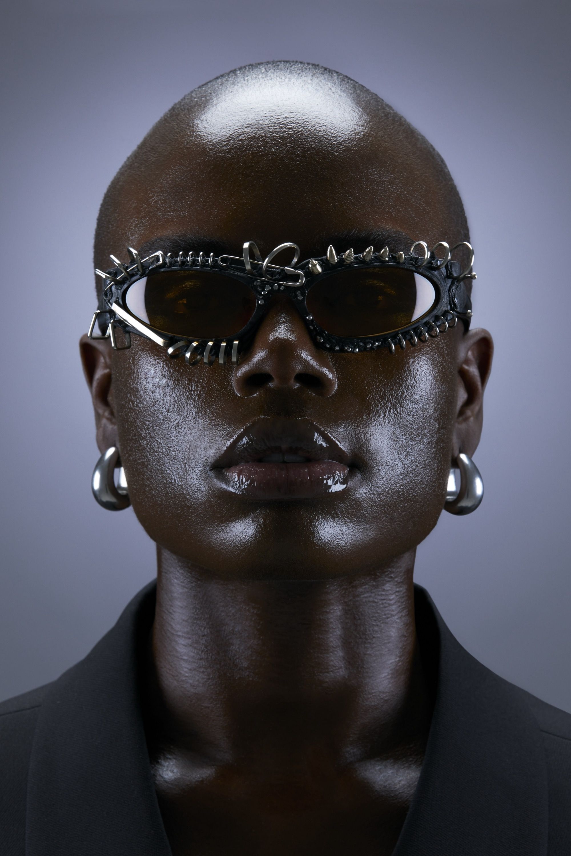 Founded in Berlin in 2011 by Livio Graziottin and Sergio Eusebi, KUBORAUM is an eyewear brand created to challenge the very concept of glasses and mass trends. The brand’s Masks adapt to the wearer’s face, enhancing their personality and character. For the brand, glasses are more than just accessories; they are a symbol of protection, refuge, but also a tool for fun. Each Mask is handcrafted in Italy, perfectly merging with Venetian tradition, while carrying a Berlin influence, symbolizing the brand’s creativity and unconventional aesthetic research. Graziottin and Eusebi's project takes care of every aspect of creation, preserving artisanal excellence and respecting the environment from design to production with an ethical and humanistic purpose. In the KUBORAUM universe, each Mask becomes a “cubic room” in which one can take refuge and explore their identity, a concept that perfectly aligns with the central theme of Sandra Mujinga's artistic practice.