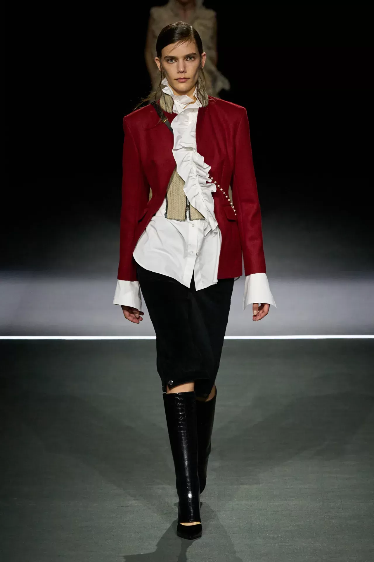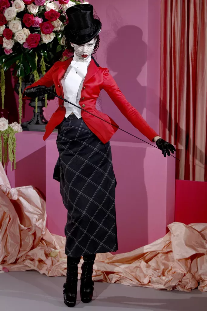 More than a decade after Galliano's version, Dior also reinterprets Lady Worsley's look: the red jacket remains in place, as does the white jabot shirt and black boots. Yet the eroticism is gone: the whip disappears, along with the rest of the aristocratic attire – gloves, hat, and whip. Lady Worsley in FW25 is more androgyne, perhaps even more military, but with a militarism that is less formal than realistic. Times have changed since the Galliano era, and the fetishistic femininity gives way to a front-line femininity, one that is determined to defend its interests without falling into erotic-violent imagery. The familiarity with Maria Grazia Chiuri's feminist legacy at Dior is clear, refocusing the look on its most combative aspect: Lady Worsley in men's clothes, Lady Worsley scandalous, ahead of her time, bold, and resolute.