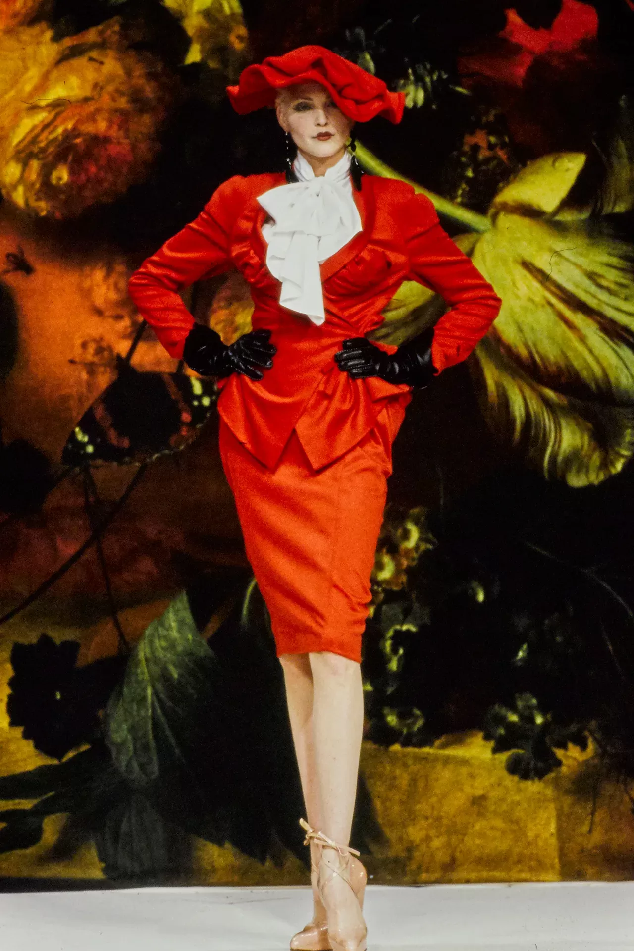 When Vivienne Westwood reinterpreted Lady Worsley's outfit in 1995, she drew inspiration from a national masterpiece. An obvious choice for someone who named one of her shows two years earlier "Anglomania". Here reimagined for the show "Vive la Cocotte", the silhouette is corseted and padded. The lady becomes a cocotte (not insignificant for an aristocrat caught in a sexual scandal), with an exaggerated eroticism. A touch of humor perhaps, which would not surprise us from Dame Vivienne Westwood. Lastly, it is important to note that the patriotic inspiration also recalls that the red riding coat worn by Lady Worsley was itself a gesture of support for her nation and its military politics. The famous "eternal return".