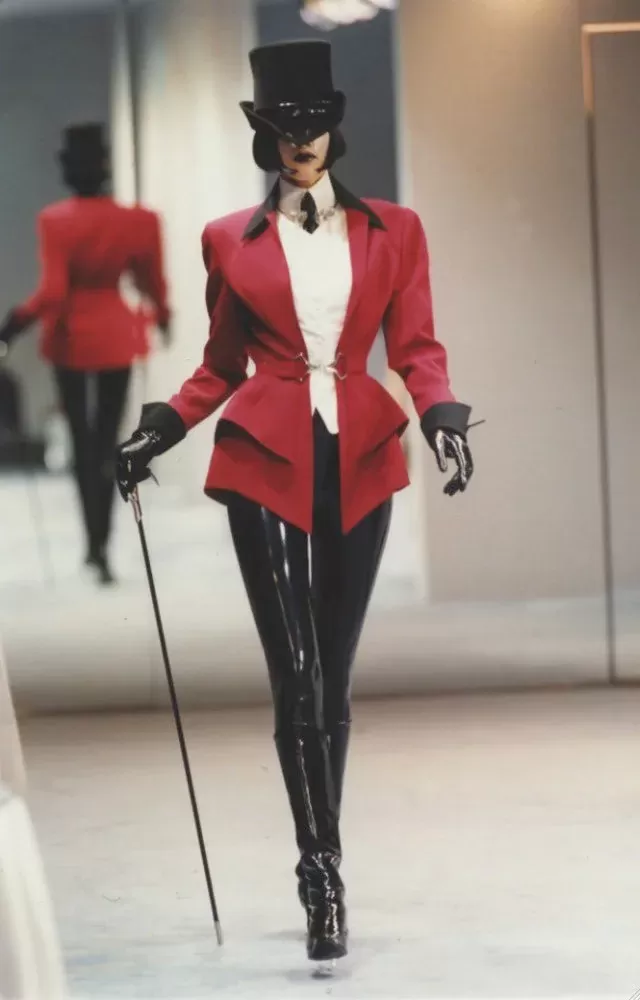 Shortly after Vivienne Westwood, Thierry Mugler also revisited Lady Worsley's wardrobe to reinterpret this riding coat in his own way. But Mugler goes further in eroticizing the outfit: the model transforms into a dominatrix, with a whip in hand that no longer has much to do with horseback riding. However, we still see the same shoulder pads – so 90s – and the same passion for the corset. But by choosing latex pants, a tie, and a bob haircut, Thierry Mugler blends this eroticism with a subtle mix of genres, a tribute to the very history of Lady Worsley, dressed in a masculine outfit.