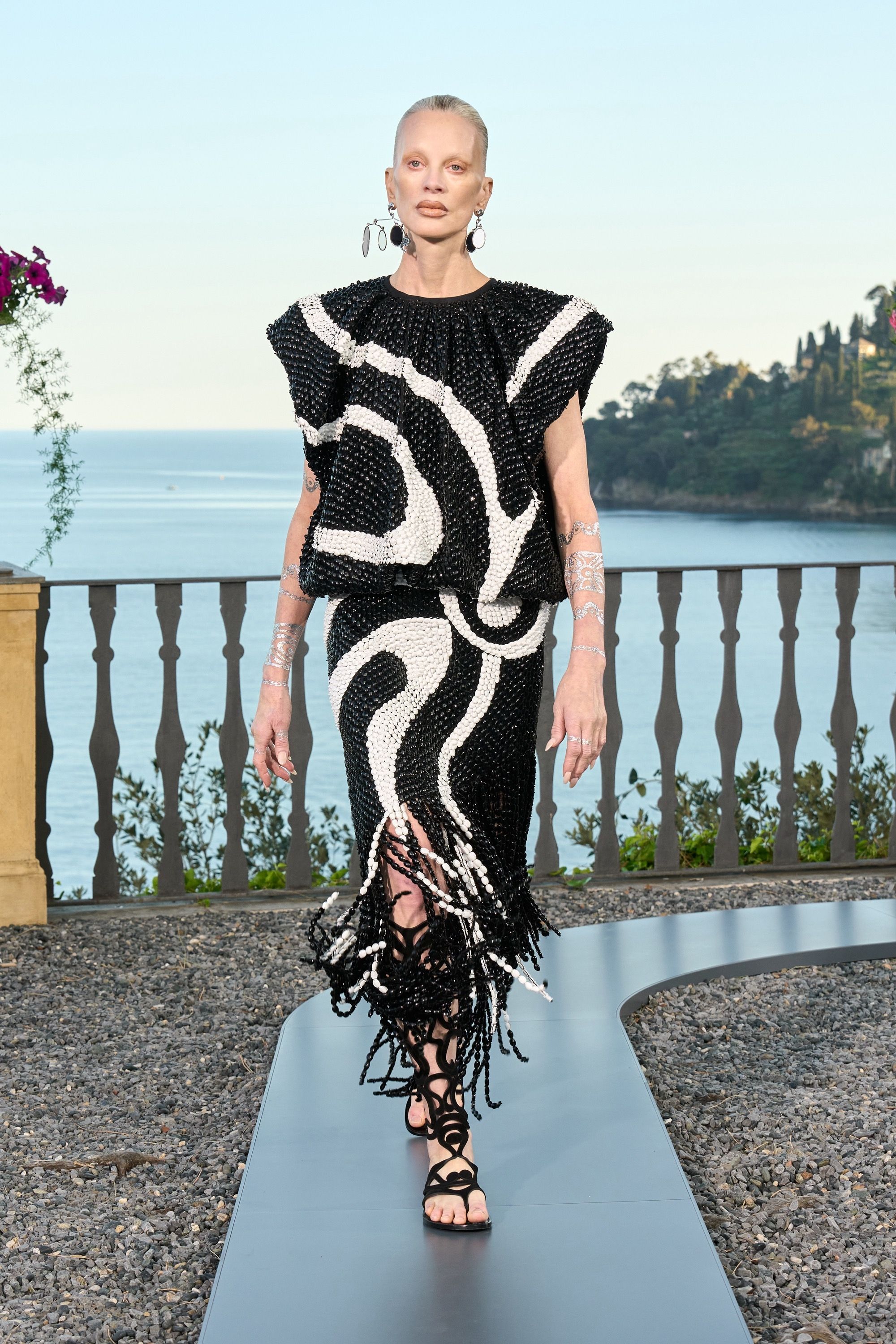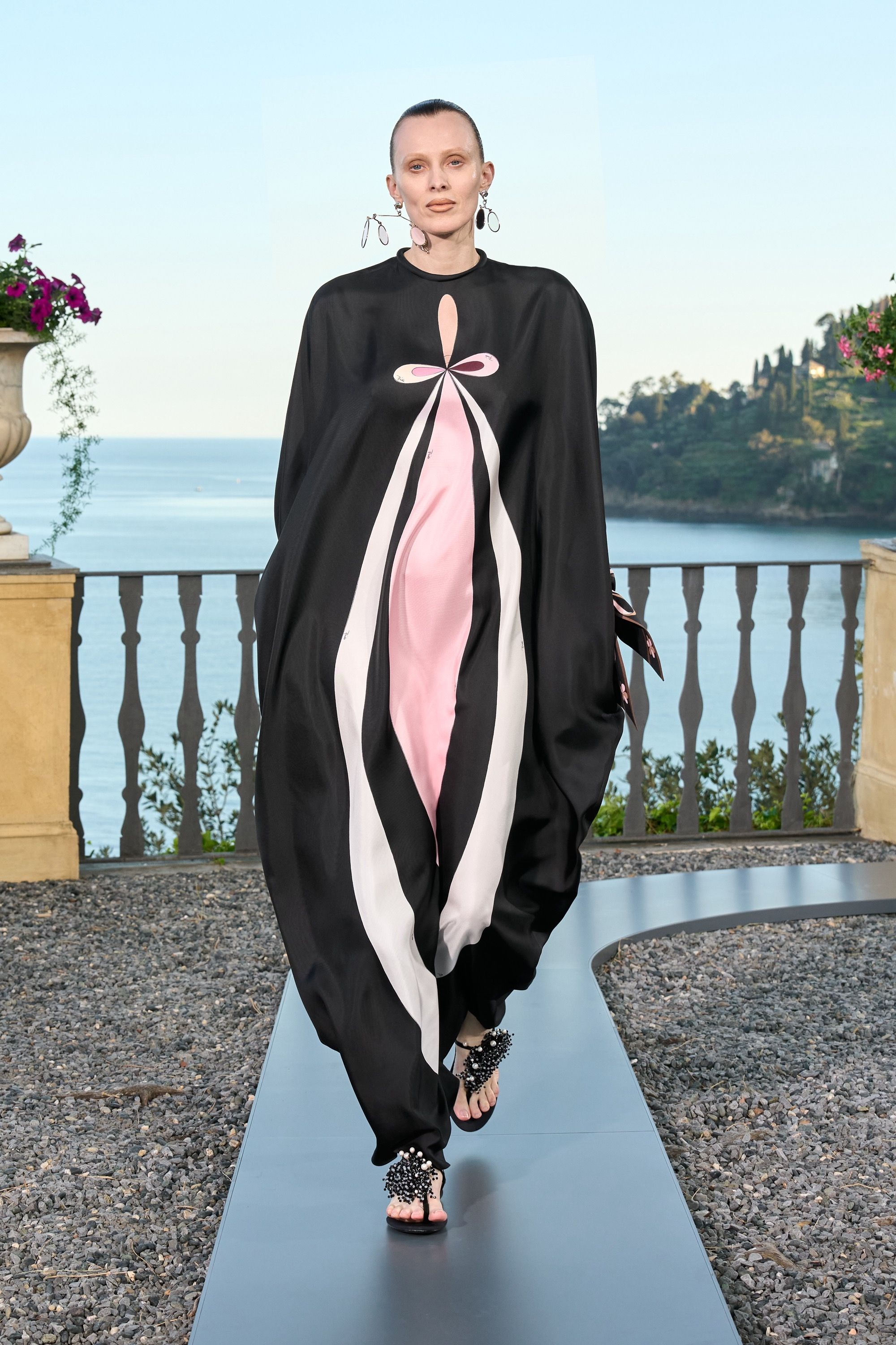 After Capri, Florence, a stop in St. Moritz and then Rome, the journey of Pucci under the creative direction of Camille Miceli continues in Portofino, in a heady dive into the brand’s vibrant colors. The village overlooking the Ligurian Sea hosted the brand's SS25 show, named Marmo, inspired by the reflection of sunlight on sea waves. Inside a villa, the house's fluid shapes, bright tones, and captivating graphics told the many faces of water. It was a joyful moment in which summer felt closer thanks to fringes, voluminous and light tops, fitted skirts, and unique textures. The draping, always a hallmark of the maison's style, drew inspiration from both Roman statues and the 1920s, in the beloved sorbet shades of the season. The silhouettes of each look, light and sensual, allow the body to move and dance freely—a must for summer evenings. Two new prints made their debut at Pucci’s SS25. Stella, as the name suggests, looks to the moon and stars, while Maddalena covers the fabric in refined waves. The palette welcomes various nude shades, black—transformed into an animal print—and different greens that nod to the world of precious gems.