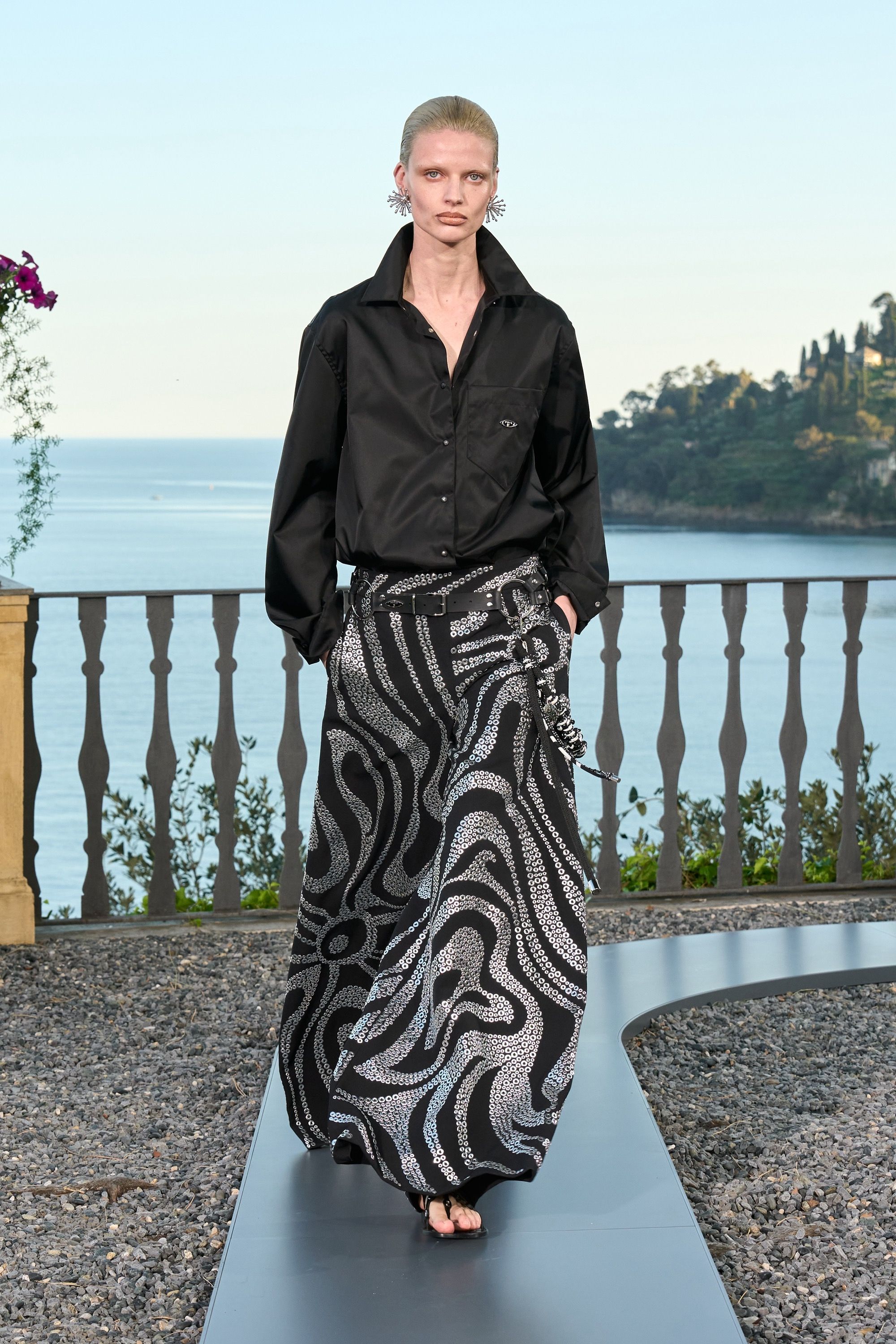 The reflections of the sun on the summer sea waves were not the only inspirations for this collection. To add further artistic details, printed sequins enriched the colorful dresses, while a black and white seashell adorned other looks. Even sea urchins made an appearance at the show, hidden in the buttons of jackets. Sandals, skirts, and evening dresses featured metallic eyelets sewn with the Marmo motif: a collection infused with the colors and forms of the marine world from head to toe. Positivity was embraced in the creation of every piece in the collection, including shoes: rain boots and embroidered sandals were inspired by the warm summer light, temporary tattoos tapped into the carefree spirit of the season, while the belt chains echoed yacht rope details. Staying with accessories, bags were reimagined to meet the practical needs of those who, in summer, want to feel free, with the creation of foldable and expandable clutches. A new bag debuted—crescent-shaped in beige denim—alongside the returning Yummy and Riccio bags, back on the runway in nylon. In short, once again, Pucci chose to abandon all inhibitions and let imagination lead the way in reinterpreting the brand's story.