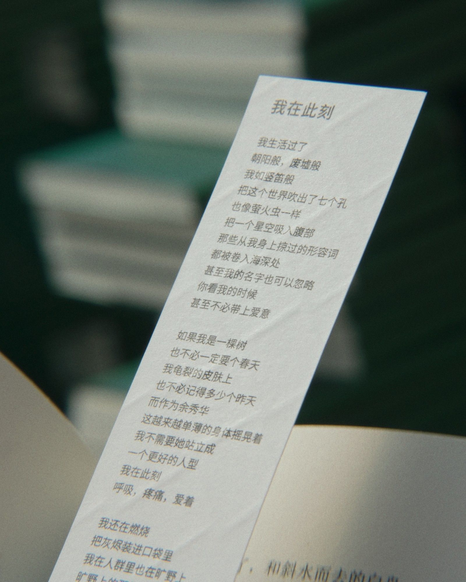 For Bottega Veneta, Yu’s work represents a powerful example of that form of self-expression that is integral to the founding values of the brand. The famous slogan When your own initials are enough has always celebrated authentic individuality. This philosophy comes to life perfectly in “A Poetic Conversation”. As visitors pick up their copy of Yu's anthology, the Bottega Veneta brandmark slowly fades away. What remains is the poetry and each reader's personal response to it. In Such a Staggering World thus becomes a companion in the individual journey, just as Bottega Veneta bags adapt to the wearer throughout the day, becoming their own in every movement and every context. For this installation, a special edition of In Such a Staggering World has been created, which includes a fold-out poster featuring the famous motto When your own initials are enough and a bookmark with a new poem by Yu Xiuhua inspired by this very slogan.