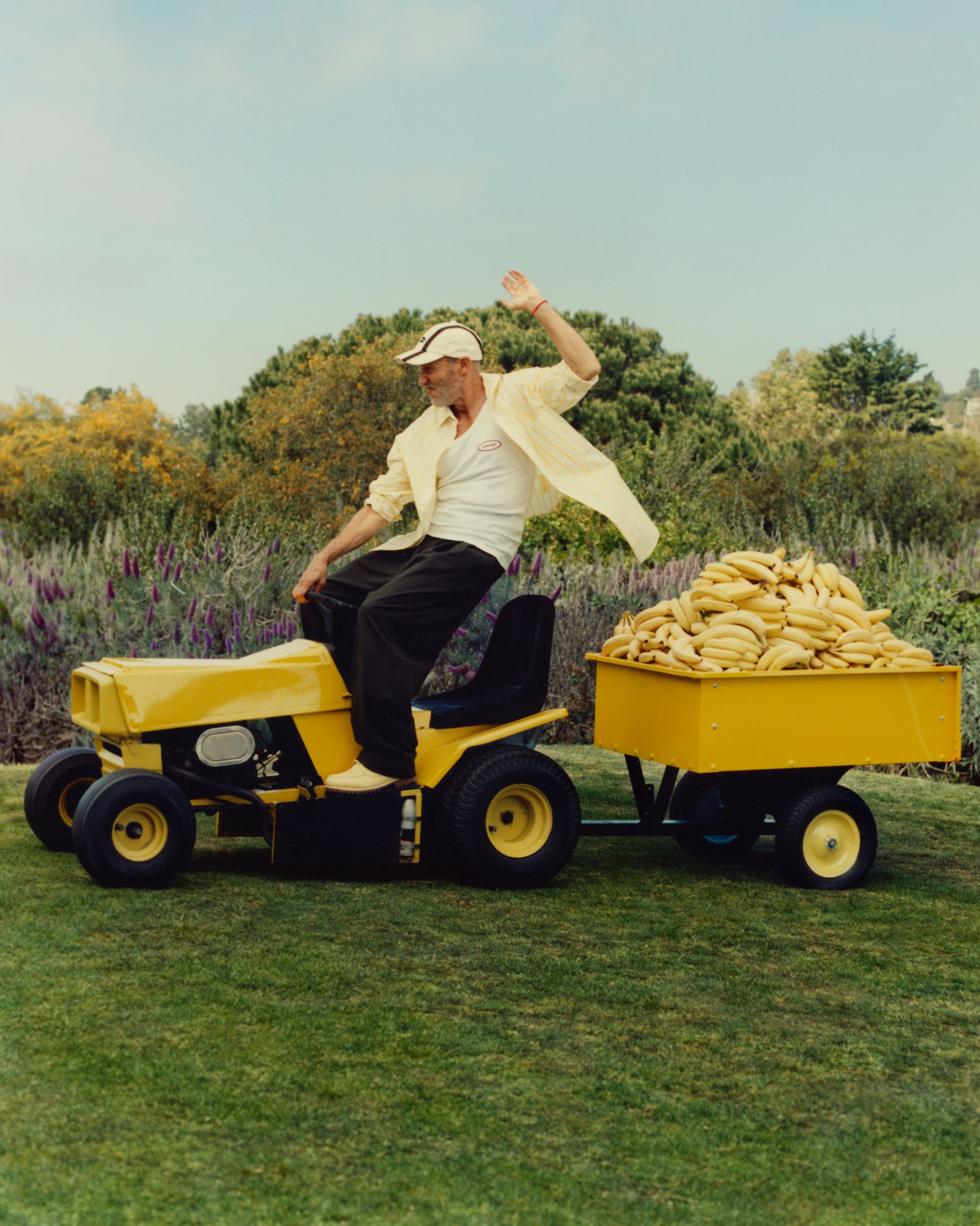 The reasons why Jacquemus would go bananas are many these days: between the recent celebration of its 15th anniversary, the opening of its new store in Los Angeles last week, and the appearance of its creations in the third season of The White Lotus, it's safe to say Jacquemus is grinning from ear to ear. A contagious smile and mood, judging by its latest campaign featuring Jon Gries, American actor and star of the aforementioned series. But while both the brand’s summer pieces and the charisma of the sixty-year-old actor may make us blush and turn us tomato red, the campaign revolves around an entirely different color: yellow. A favorite of Simon Porte Jacquemus, inspired by the sun of his beloved Provence, but especially by bananas, which are omnipresent in this campaign.
