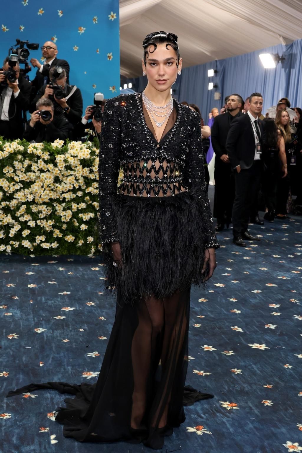 In second place we find the Maison Chanel. As we predicted, singer Angèle was indeed present, dressed head-to-toe in Chanel with a look far edgier than her first Met appearance in 2023. Dressed in a lilac gown paired with a leather jacket and matching belts worn at the waist and around the neck, she coordinated perfectly with Chanel’s new fragrance Chance, of which she is the ambassador. She wasn’t the only Chanel ambassador present and shining bright. Her fellow singer Dua Lipa, with whom she performed Fever in 2020 and who is now the new face of the Maison’s leather goods line, posed in an all-black ensemble made of tulle and feathers with a 1920s flair. The other new face for Chanel bags, Jennie, wore a long off-shoulder dress adorned with the iconic Camellia and a pearl necklace, accessorized with a black and white hat. But the Maison didn’t stick to just black—Lupita Nyong’o, Chanel’s global brand ambassador since last October, proudly represented it in a suit/shirt/trousers set in a vibrant light blue, embellished with a long veil flowing from the shoulders.