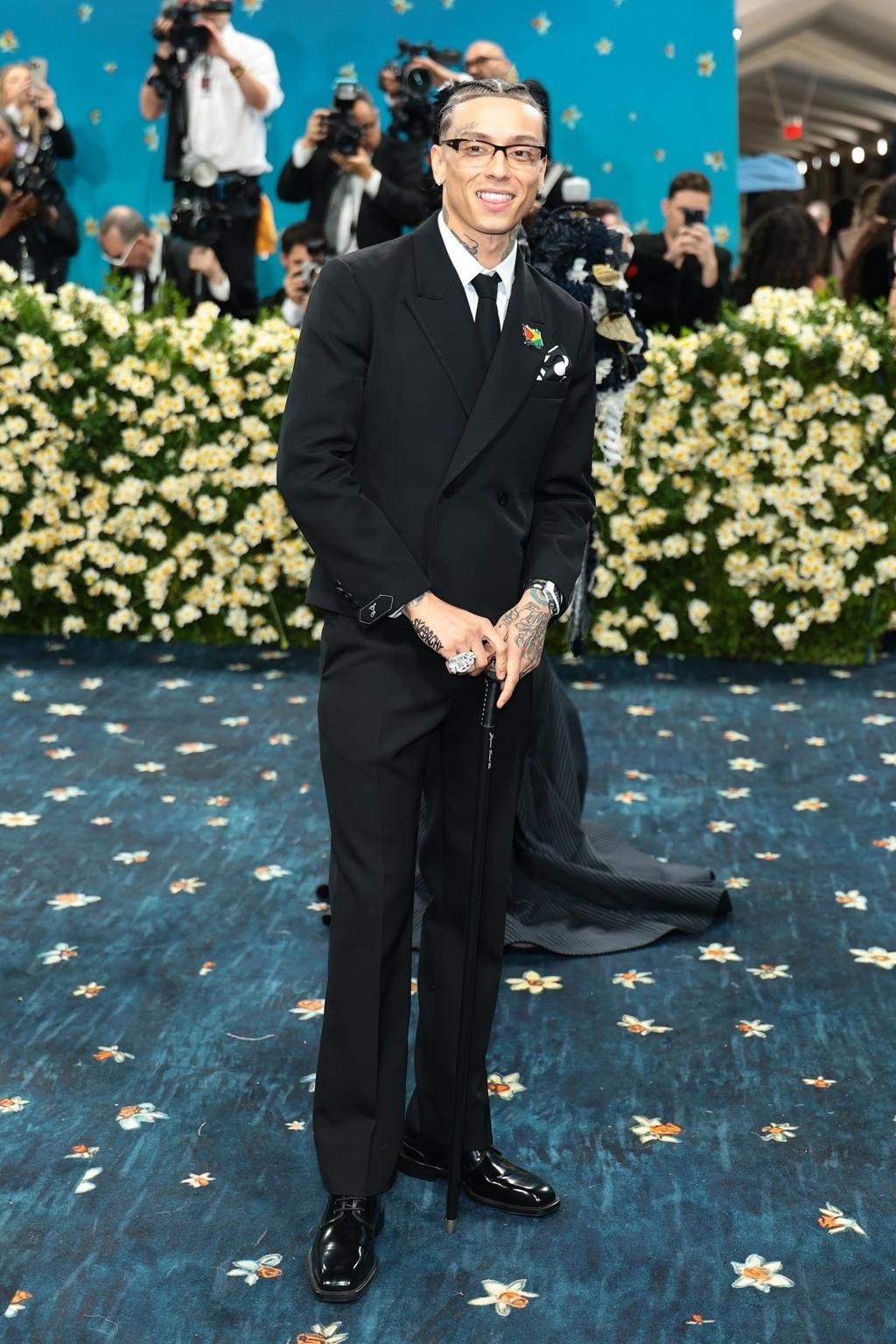 More discreet and less instantly recognizable, Jacquemus was also in attendance with custom looks for Tyla and Central Cee. While the Water singer set the bar high last year with her sand gown by Olivier Rousteing, she did not disappoint this year either. The young artist paid tribute to icons Josephine Baker and André Leon Talley with a corseted poplin dress paired with an oversized men’s shirt delicately draped over her shoulders, both pieces “finely striped with glitter threads and transparent crystals, with a surreal touch in the raw and irregular embroidery details, adorned with delicate crystal-cut strands”, as described by designer Simon Porte Jacquemus in an Instagram post. But her counterpart Central Cee was not to be outdone, dressed in a black Japanese wool tuxedo featuring “a double-breasted jacket, well-cut trousers, and an immaculate white poplin shirt”, all accessorized with a polka-dot pocket square, an elegant pipe hanging from a leather strap around his neck, and a cane topped with a polished metal sphere.
