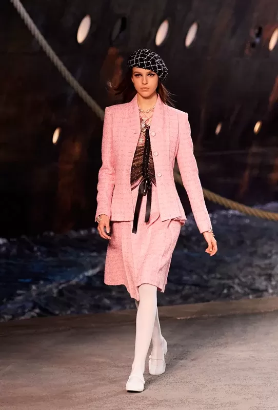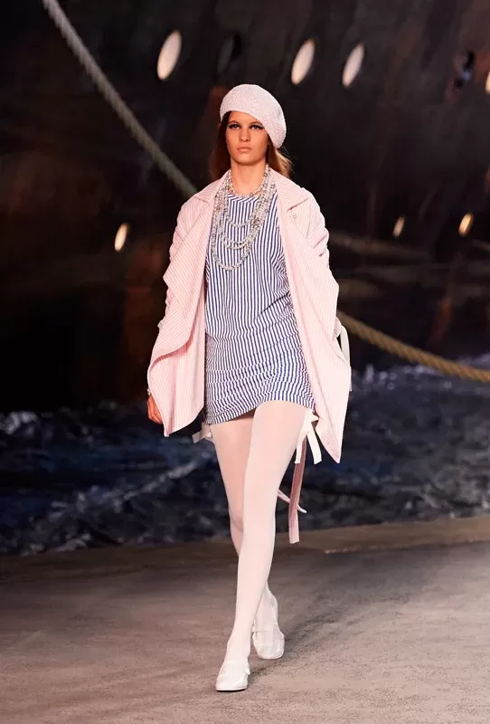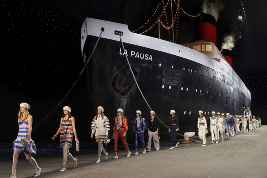 Before invading campaigns, houses — Lanvin and Patou leading the way — had already taken over 20th-century ocean liners, aiming to seduce wealthy clientele heading for the sun. Quickly, boutiques began to appear on the shores of the most coveted seaside resorts. Whether for a short stopover or a longer stay, these boutiques — most open only in the summer season — offered pieces suited to luxury tourism. Yet the term "cruise collection" only emerged in the 1990s. Today, it no longer refers to a maritime wardrobe, but to a nomadic state of mind. Karl Lagerfeld gave it a spectacular interpretation in 2018 for Chanel's 2019 cruise collection: a life-size ocean liner was recreated under the glass roof of the Grand Palais. Onboard, nearly a hundred passengers wore pieces inspired by marine attire, where the house’s emblems mingled with nautical imagination. At the end of the show, guests rushed aboard the technical marvel, responding literally to this “invitation to travel.” Another remarkable embarkation: Jacquemus' show Le Chouchou at the Château de Versailles. Seated in boats on the Grand Canal, turned into front row seats for a grandiose show, guests peacefully watched models walk the historic park’s lawn. Dior, for its part, took the experience even further with its Dior Spa Cruise, a wellness boat in the heart of Paris — a city whose emblem is a ship.