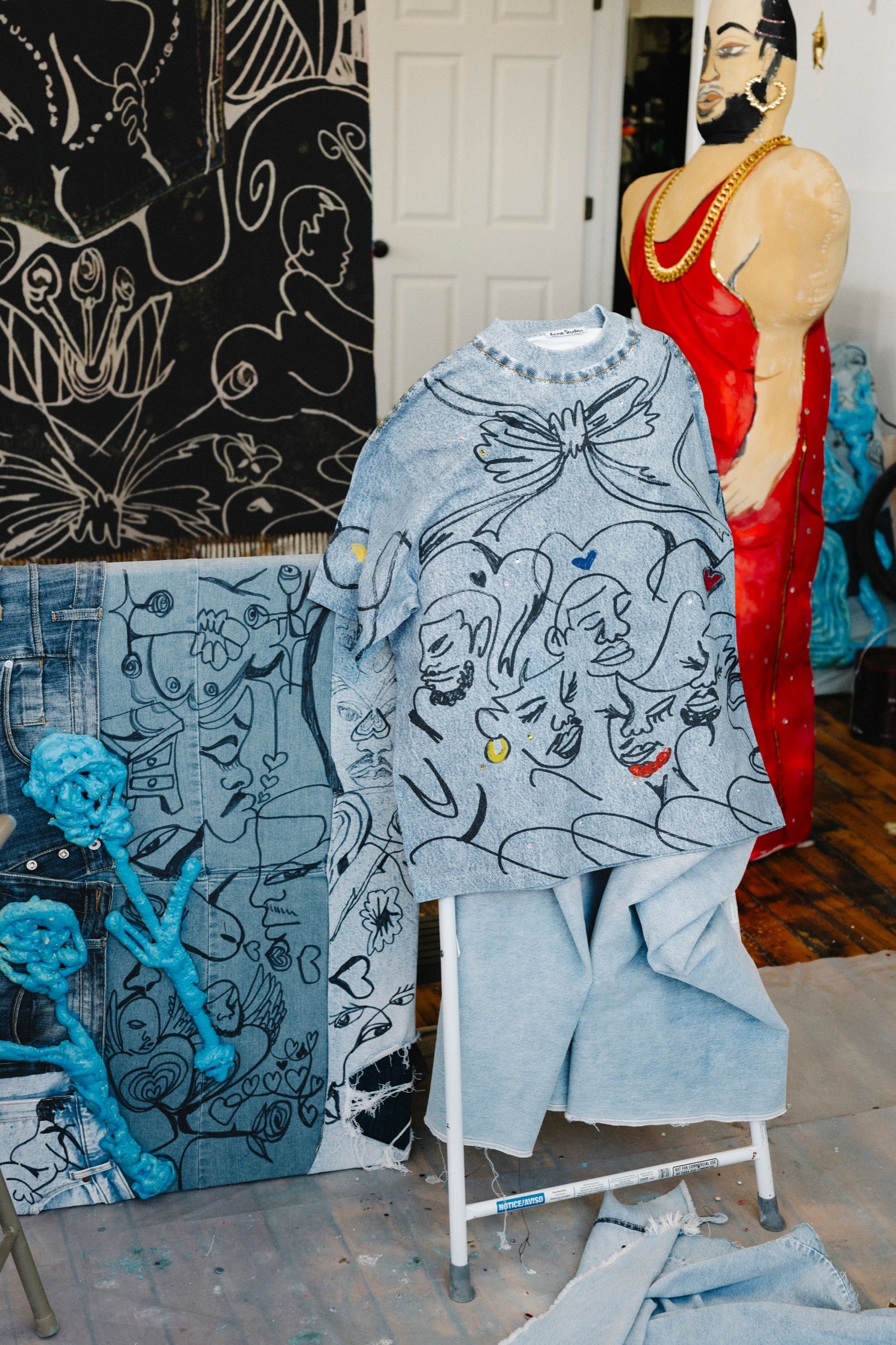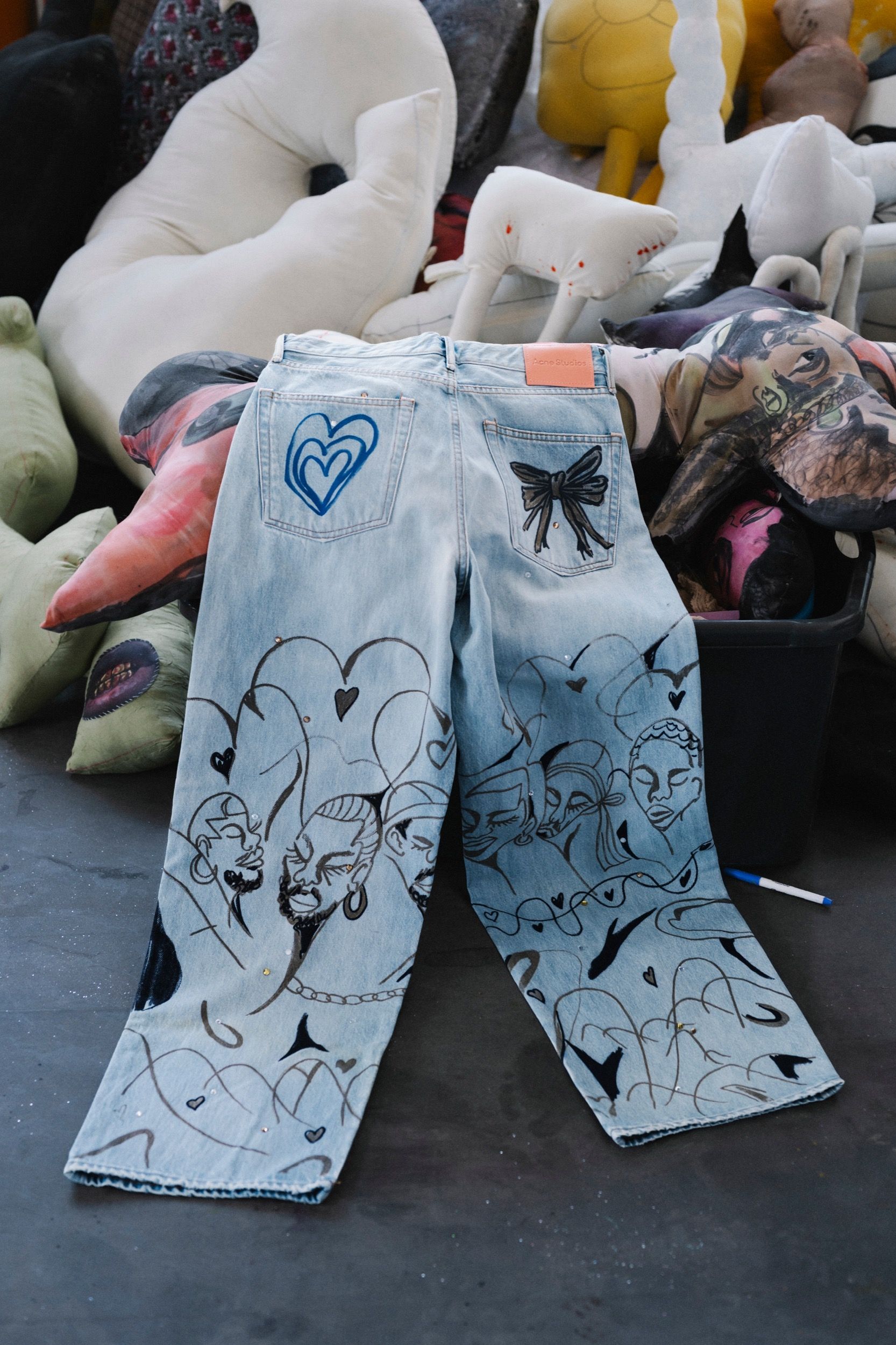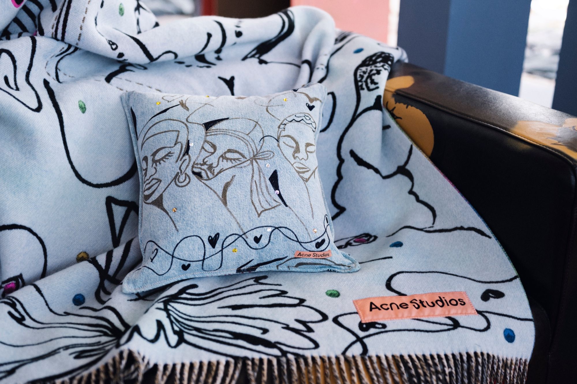 The exhibition accompanies the launch of “Acne Studios Loves Jonathan Lyndon Chase,” a capsule collection that applies the artist’s illustrations to a range of garments and homeware pieces. The drawings, often inspired by personal relationships and intimate scenes, are translated onto signature items from the brand, including the “1981” jeans, short- and long-sleeved T-shirts, cushions, and a blanket. The fabrics mimic the appearance of denim, a material deeply rooted in the history of Acne Studios, here used as a base for a layered visual narrative. The project aligns with the brand’s ongoing interest in working with contemporary artists—not as a mere aesthetic strategy, but as an effort to expand its visual codes. In this instance, Chase’s work introduces a distinctly queer and intimate aesthetic, distancing itself from the polished narratives of commercial fashion.