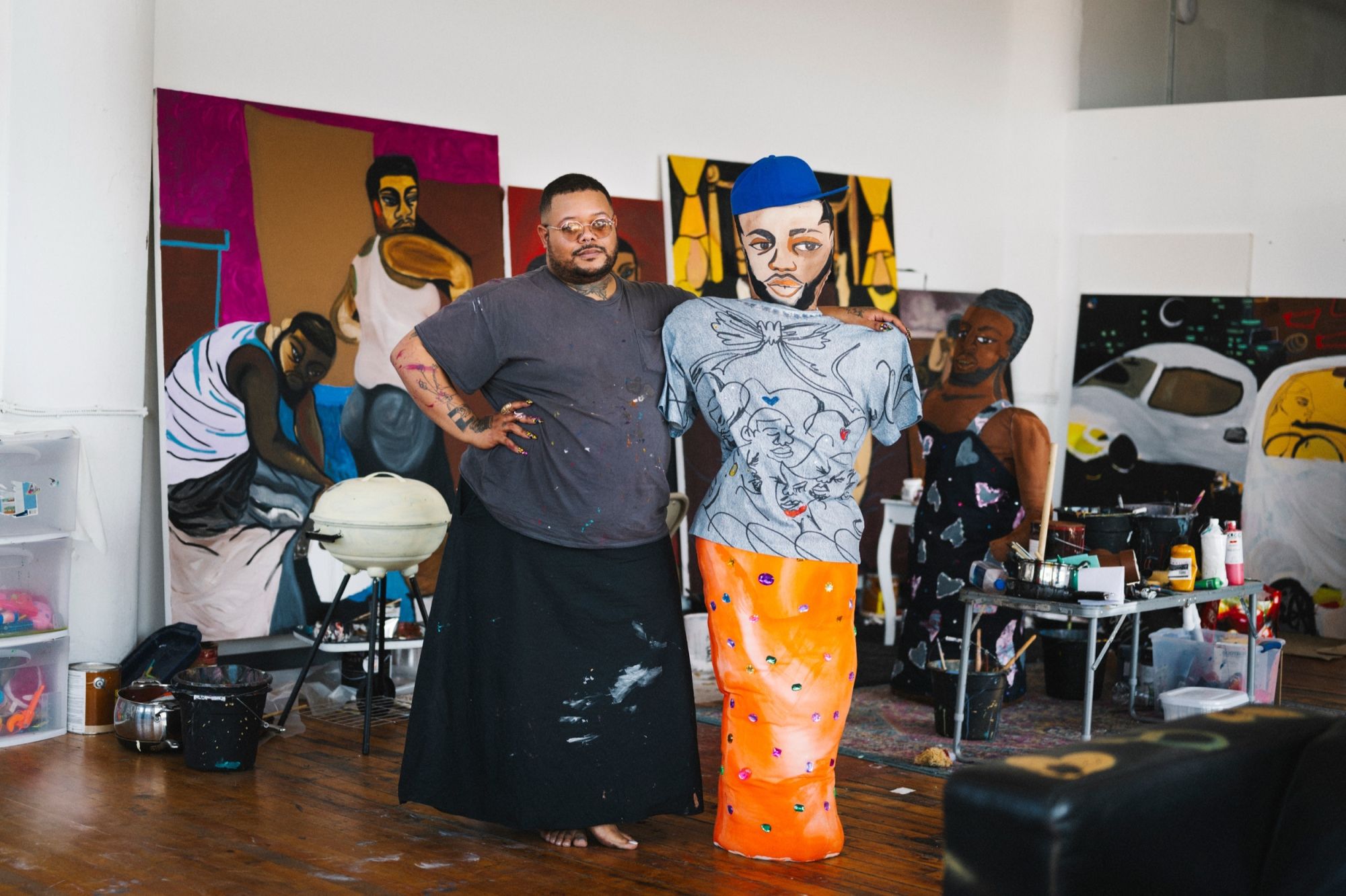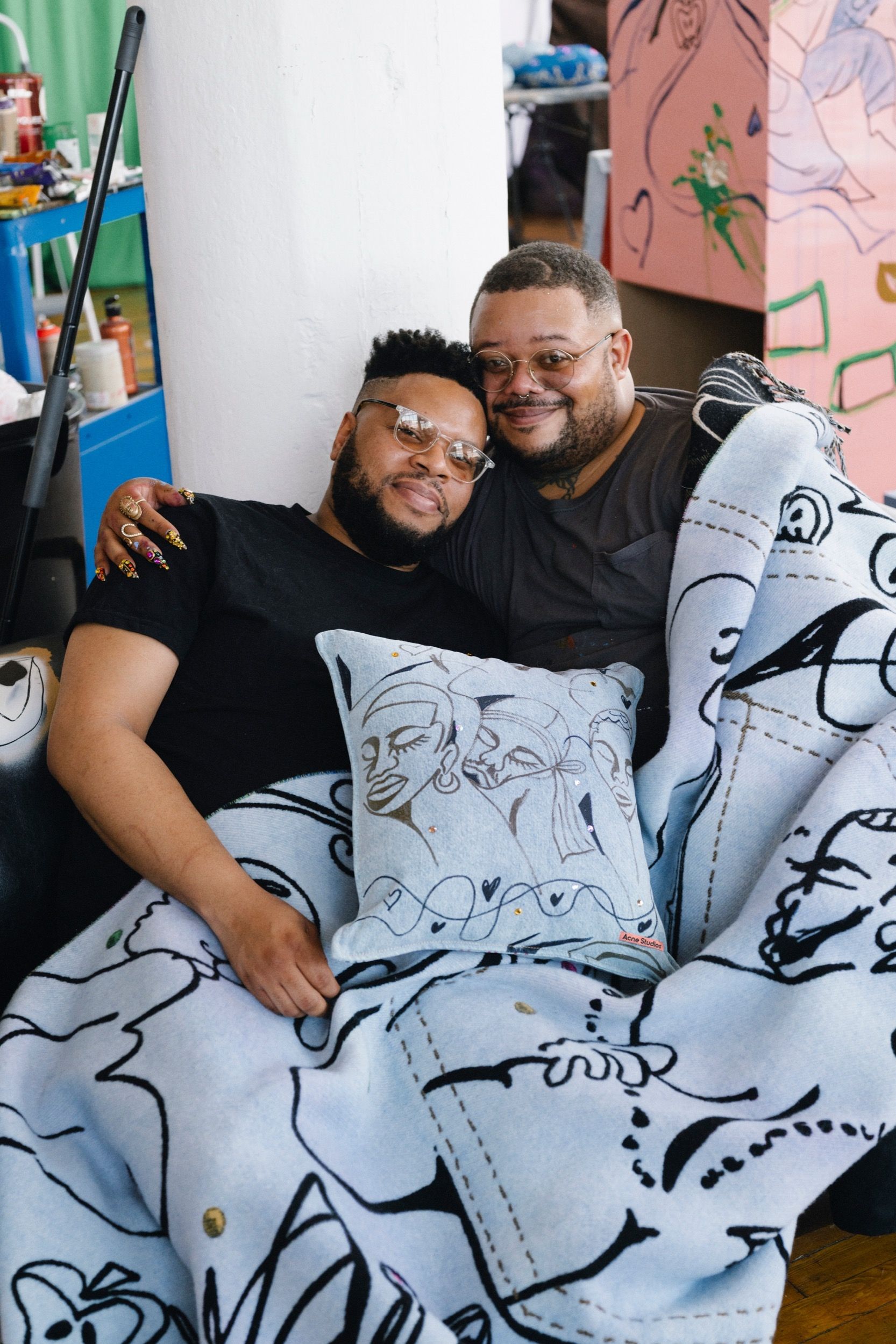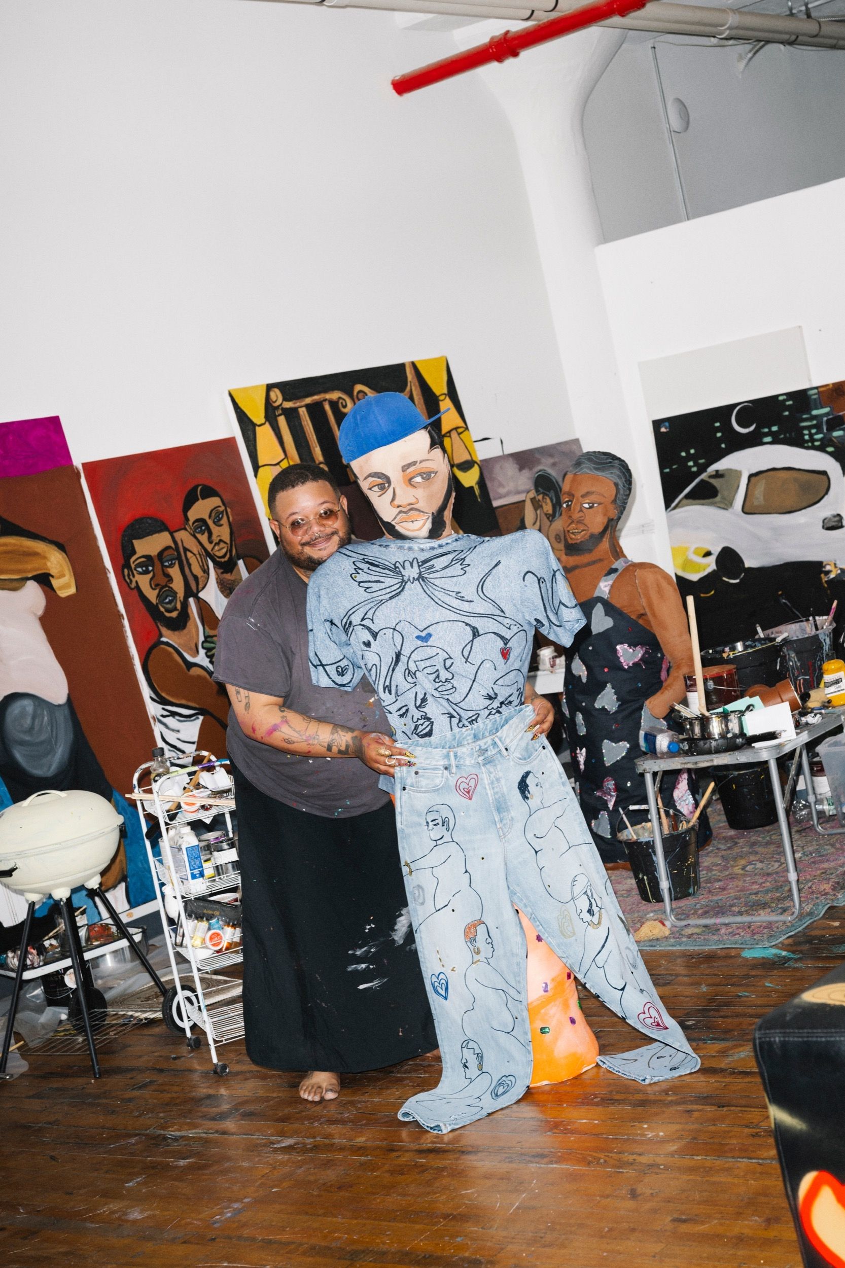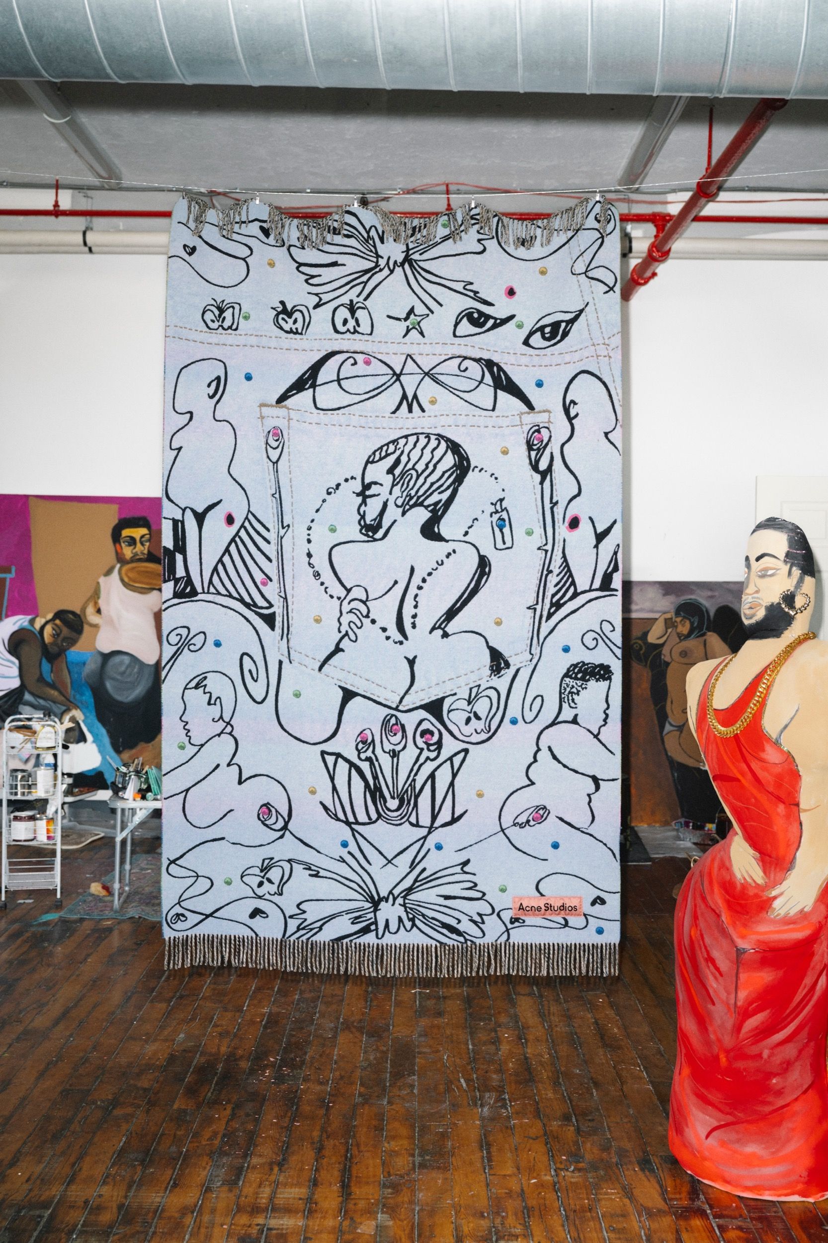 On the occasion of Frieze New York 2025, Acne Studios resumes its collaboration with Jonathan Lyndon Chase, a visual artist from Philadelphia, with a temporary exhibition and a capsule collection presented inside the Greene Street store. The project continues the dialogue started last September, when Chase designed the set for the SS25 womenswear show, transforming the runway into a layered and intimate domestic scene. From May 7 to 11, the Swedish brand's New York space will become an immersive installation composed of furniture, paintings, and soft sculptures. Chase’s aesthetic, characterized by spontaneous gestures and an expressive approach to bodies and objects, distorts lamps, sinks, frames, and fans into hybrid forms that reflect on Black and queer identities, vulnerability, and everyday affection.