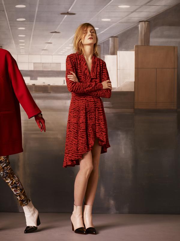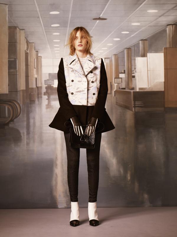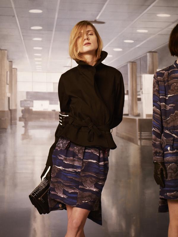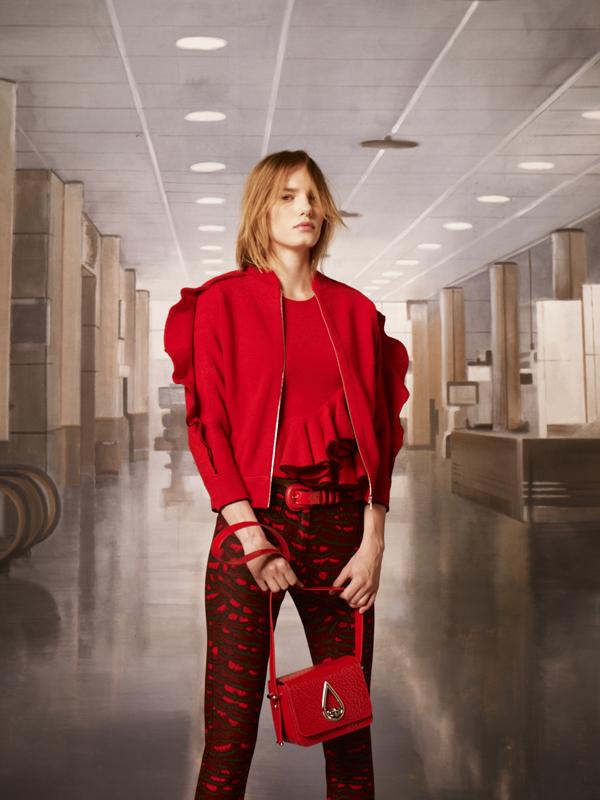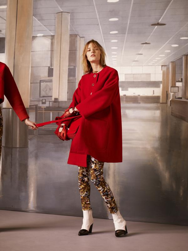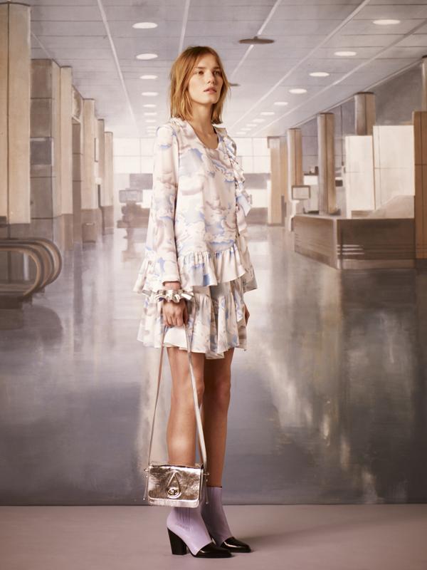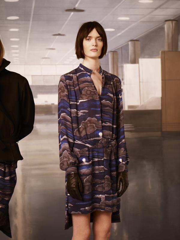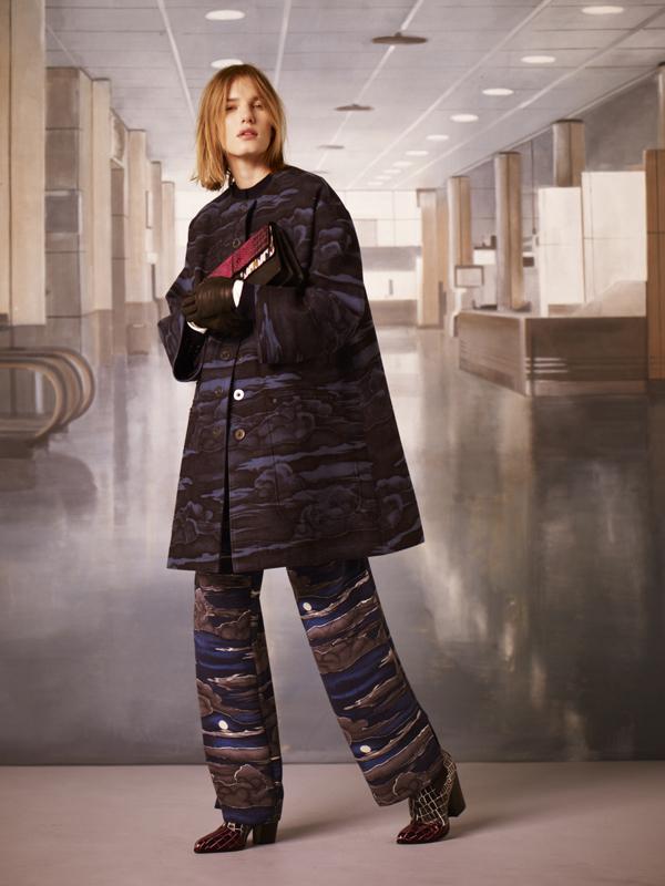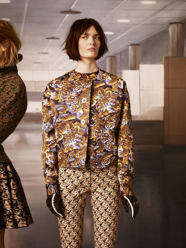 I colori e le stampe sono d'impatto: rosso acceso,bianco e nero decisi da un lato, rosa tenue e celeste dall'altro. Candide nuvole e stampe floreali per alcuni capi, tigri selvaggie, draghi e stampe trompe l'oeil per altri. Originalità anche nella scelta dei tessuti, si incontra la delicatezza del raso duchesse trapuntato con neoprene, shearling, denim stampato e lane granulose senza perdere armonia e coerenza con i tagli.
