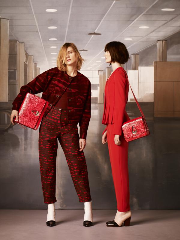 Il tutto è completato dagli accessori, stivaletti e guanti bicolor bianchi e neri che riprendono la grafica di alcune sihouettes, pochettes e borse squadrate, nei colori e nelle stampe della collezione, talvolta metalliche, con chiusura a goccia e collane in metallo.