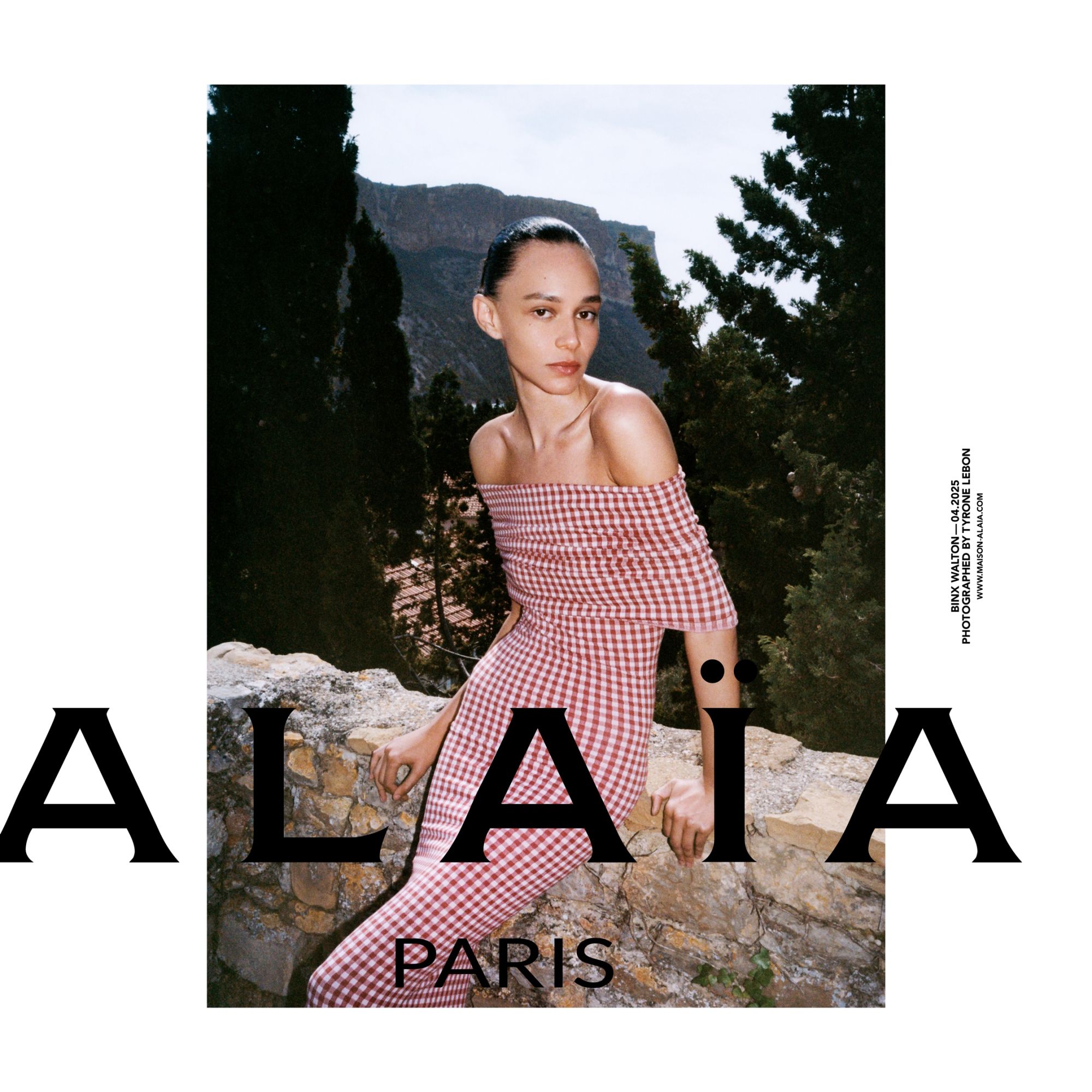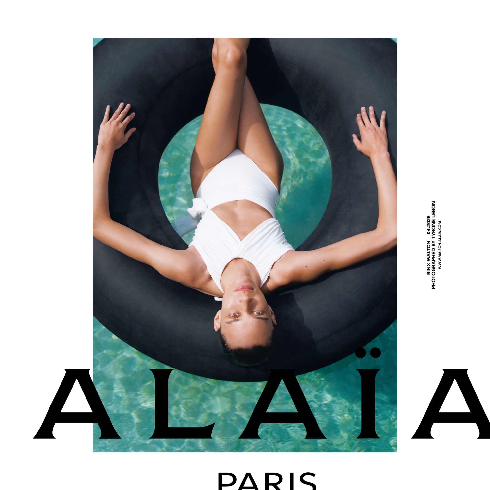 Indeed, it is around the warm and comforting sunlight and through a gentle breeze one could almost feel on the face when looking at the photos that Archetypes, the Summer Fall 2025 campaign of the House, is built. Thanks to Anok Yai and Binx Walton, Pieter Mulier’s collection comes to life through these shots, perfectly embodying what defines the very essence of the Alaïa house: a sculptural aesthetic, magnetic, desirable, and powerful. On floaters, a deckchair or lying directly on the ground by a hypnotizing blue pool, the models showcase pieces from Alaïa that make us want just one thing: to slip on our most beautiful white dress from the SF25 collection and head straight to the South of France to kick off the summer. Through the decor, the models’ silhouettes, and the sculptural pieces of the collection, forms create a unique narrative, and summer comes to life.
