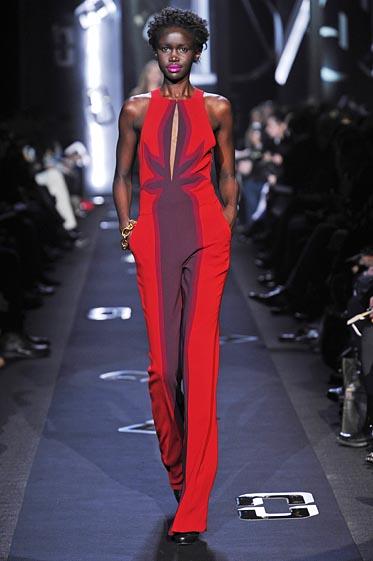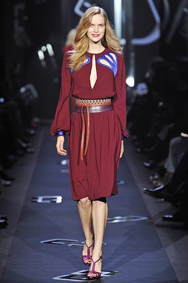 L'autunno Furstenberg non sarà grigio, monotono e noioso. La vita per lei è una festa! In passerella domina lo stile retrò anni 70, con i suoi pantaloni a zampa d'elefante, gli scolli vertiginosi, i cinturoni, il velluto rosso e l’oblò in pieno petto, particolare che ritroviamo in molti modelli della collezione, soprattutto negli abiti da giorno con stampe optical. Diane gioca con i materiali, li sovrappone,li riempie di luce, di trasparenze, di oro e argento, suggerendoci un look glam rock.