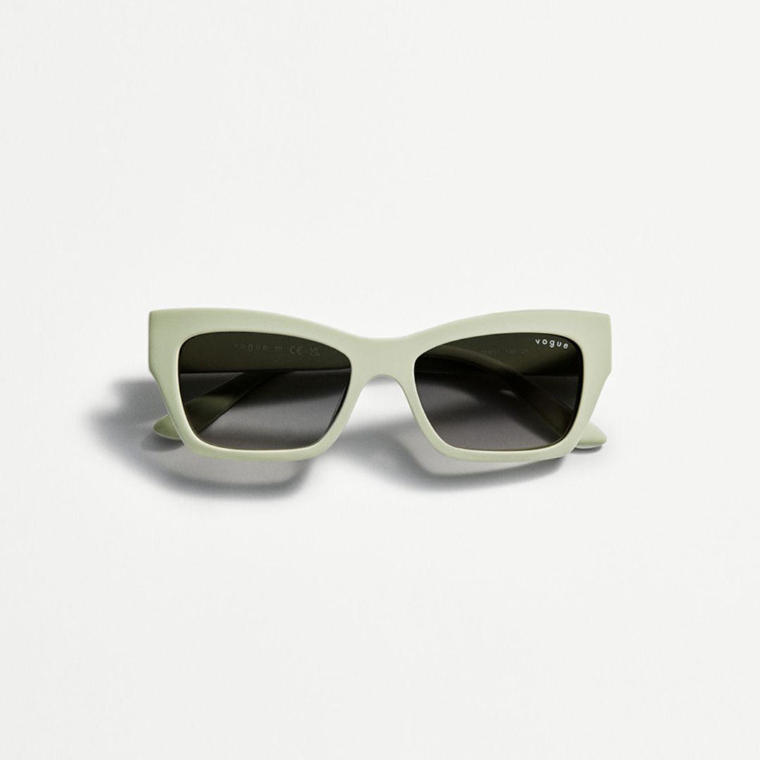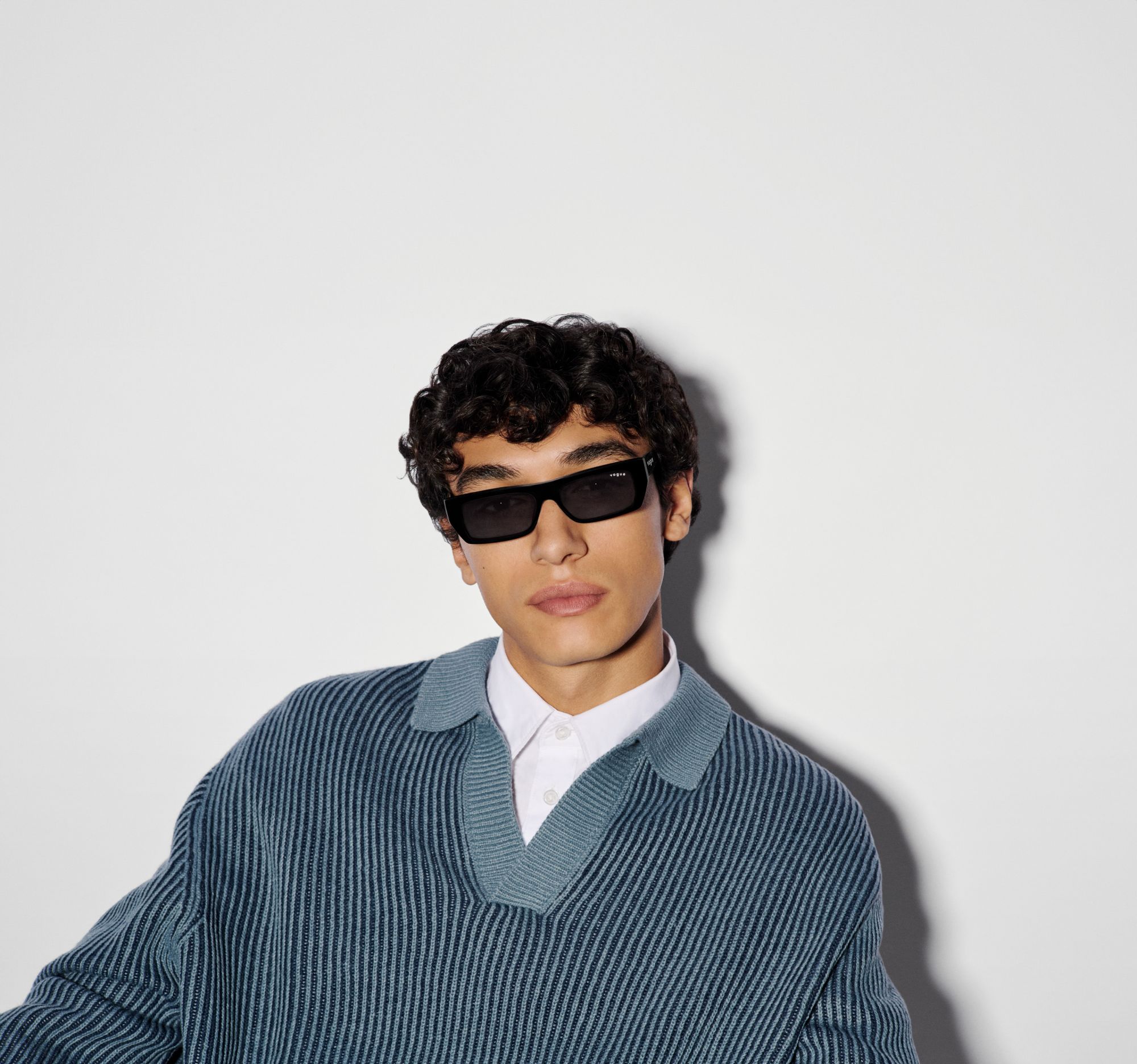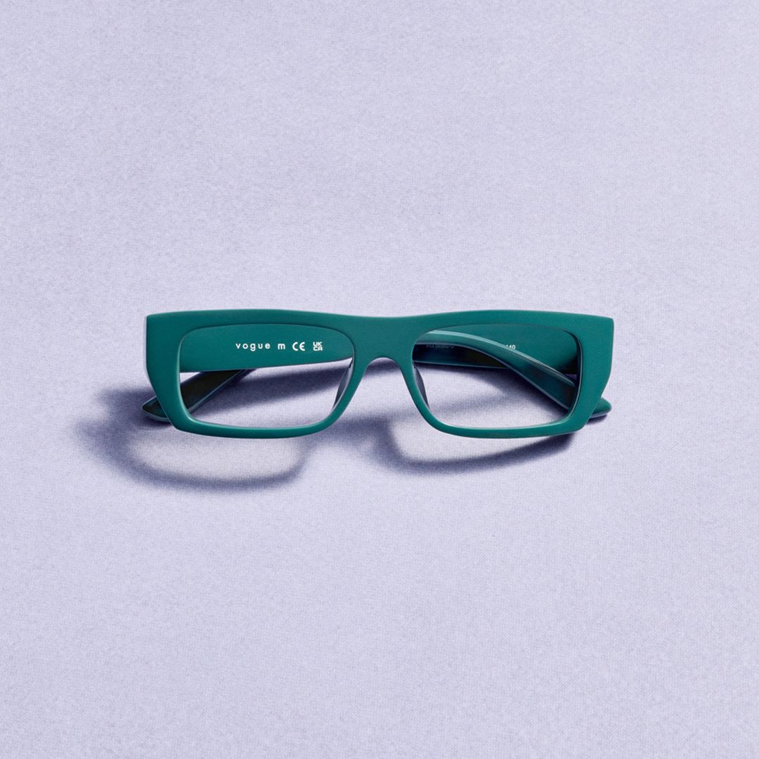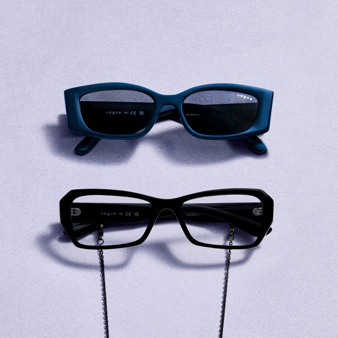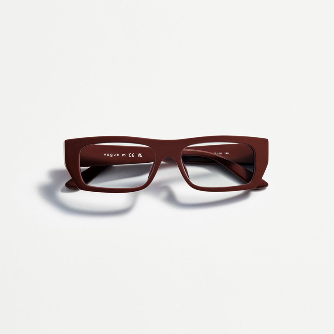 For fans of architectural and bold design, there is a rectangular acetate frame, confident and undeniably cool, characterized by a thick top bar, available in timeless shades as well as brighter colors like red or green for the daring. In the same spirit, another rectangular frame stands out thanks to its straight top bar and thick temples, blending character and elegance, whether chosen in a classic or colorful version. Vogue Eyewear also introduces pieces designed for versatility and functional innovation, such as the lightweight pillow-shaped frame or the fine butterfly silhouette in nylon fiber. Maximalist glamour is also represented: the collection offers frames adorned with crystals for a sophisticated effect. Finally, the brand gives a subtle nod to the 90s with a rimless oval frame, enhanced with tinted lenses, delivering a clean, vintage look. And for the second consecutive season, the Teens Collection reaffirms its success: full of energy and colors, its light and slim silhouettes include the rectangular nylon fiber frame with bold temples or the finer model available in powder pink and blue.