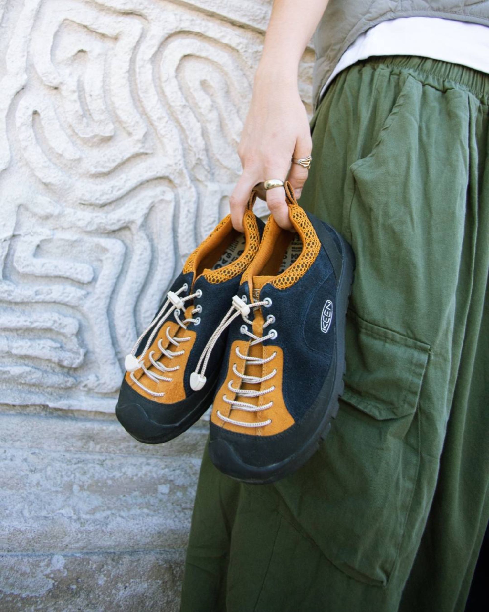 Although they’ve now been embraced by fashion and those who work in it, neither the Mojito nor the Jasper were designed for the fashion industry. Yet, as we’ll see, their description easily matches that of a Milanese creative who loves both clothing and mountain hikes. Meijer explains that the Keen model «was designed for those living a hybrid lifestyle, moving between the outdoors, the city, and everything in between. We’ve seen the Jasper worn by people who see it as an expression of individuality. Even though KEEN doesn’t rely on traditional ambassadors, the Jasper has naturally been embraced by artists, stylists, and musicians around the world.» Not to mention that the balance between aesthetics and functionality, as Parisotto points out, has become essential in fashion just as much as in technical apparel.