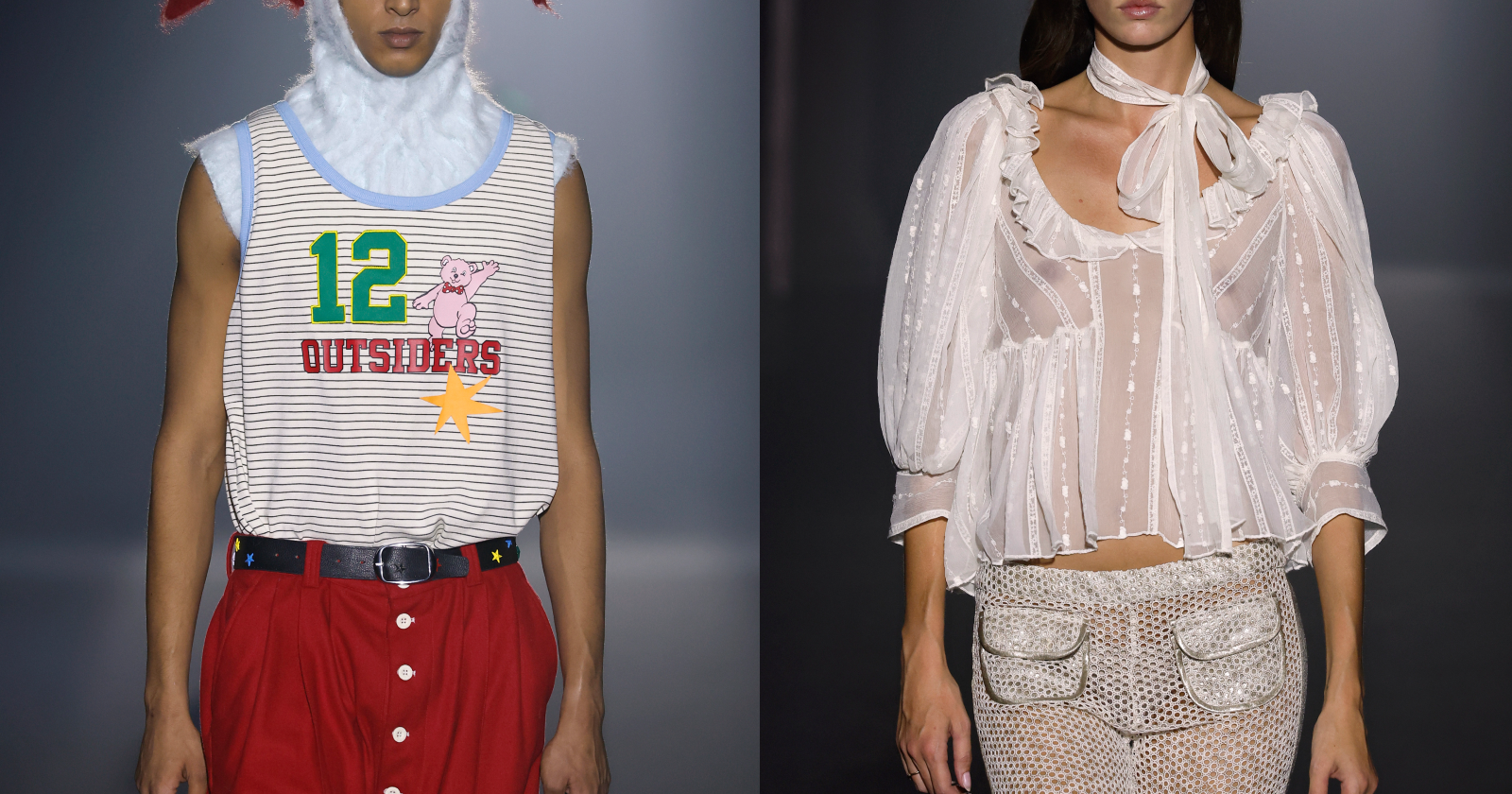 Dominnico continues to define its aesthetic as a balance between nostalgia and the future. For SS26, Domingo Rodríguez Lázaro builds a dialogue between the 18th century and the post-internet era with structured corsets and rococo volumes that blend with taffeta and regenerated denim, creating opulent yet light silhouettes designed for a gender-free body and beyond rules. The collection plays with references to Sofia Coppola’s Marie Antoinette, but renders them in a cyber-romantic key through pastel tones and metallic details. It is an exercise in style that shows how material research and upcycling can coexist with a pop and conscious vision of luxury.