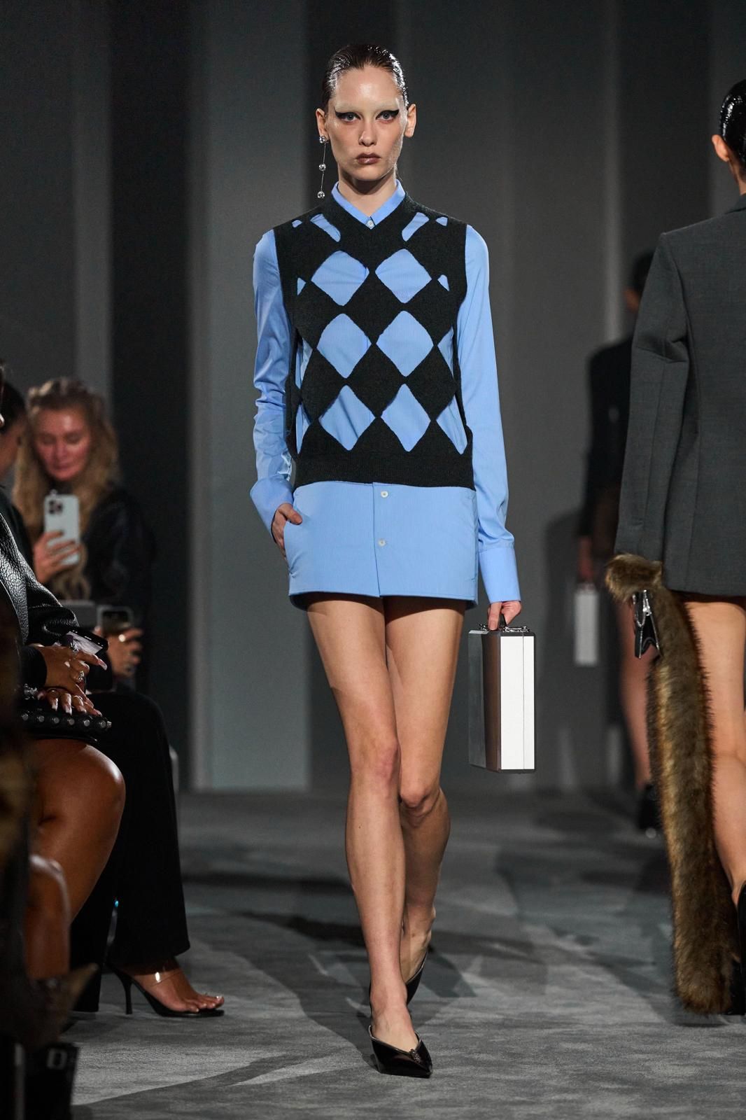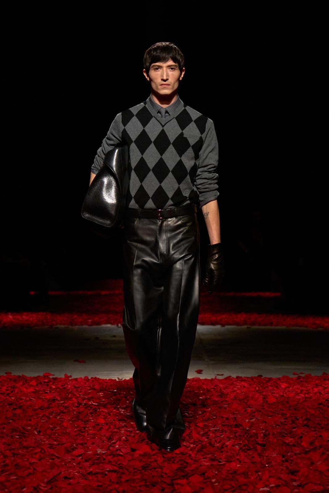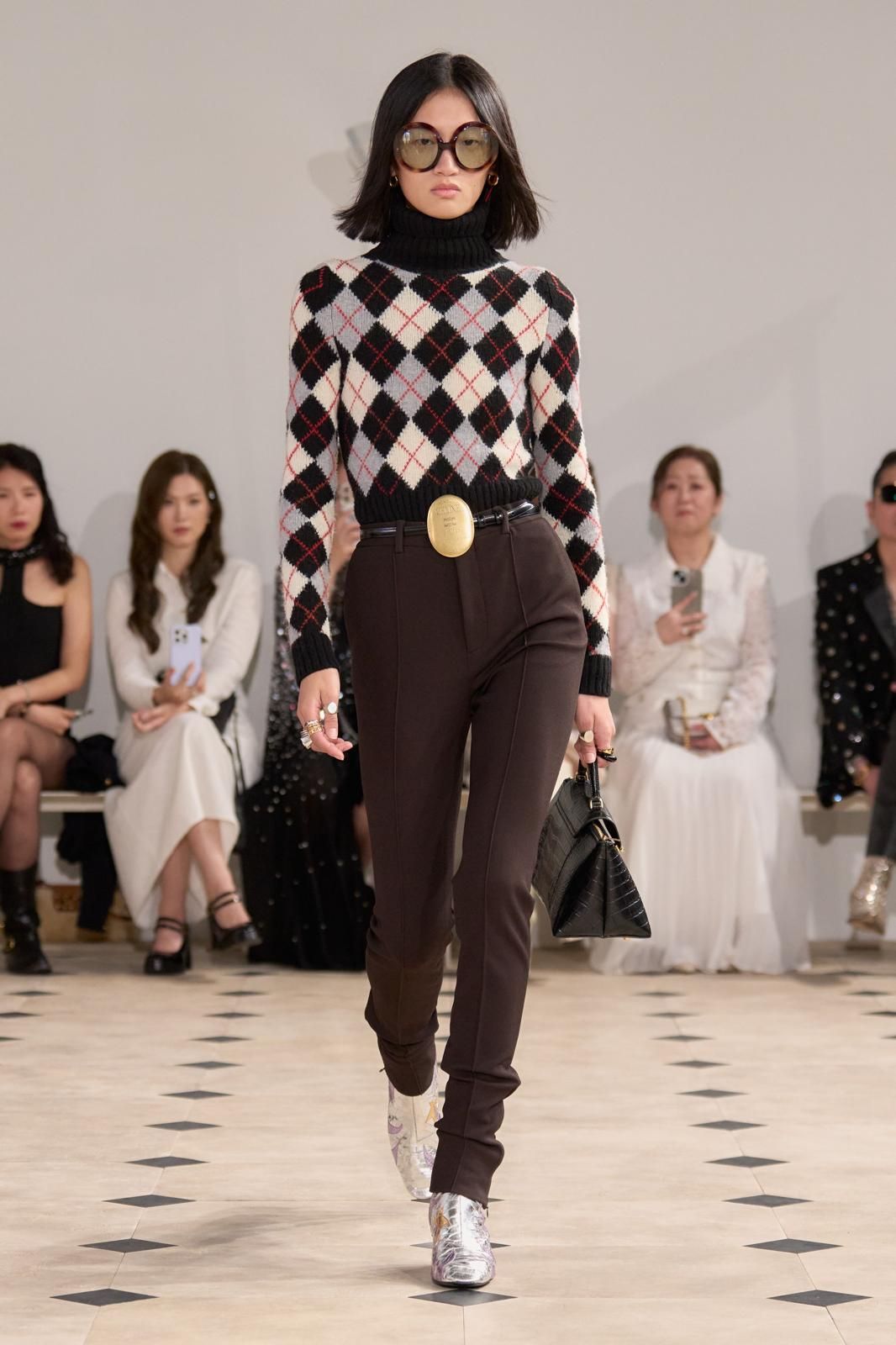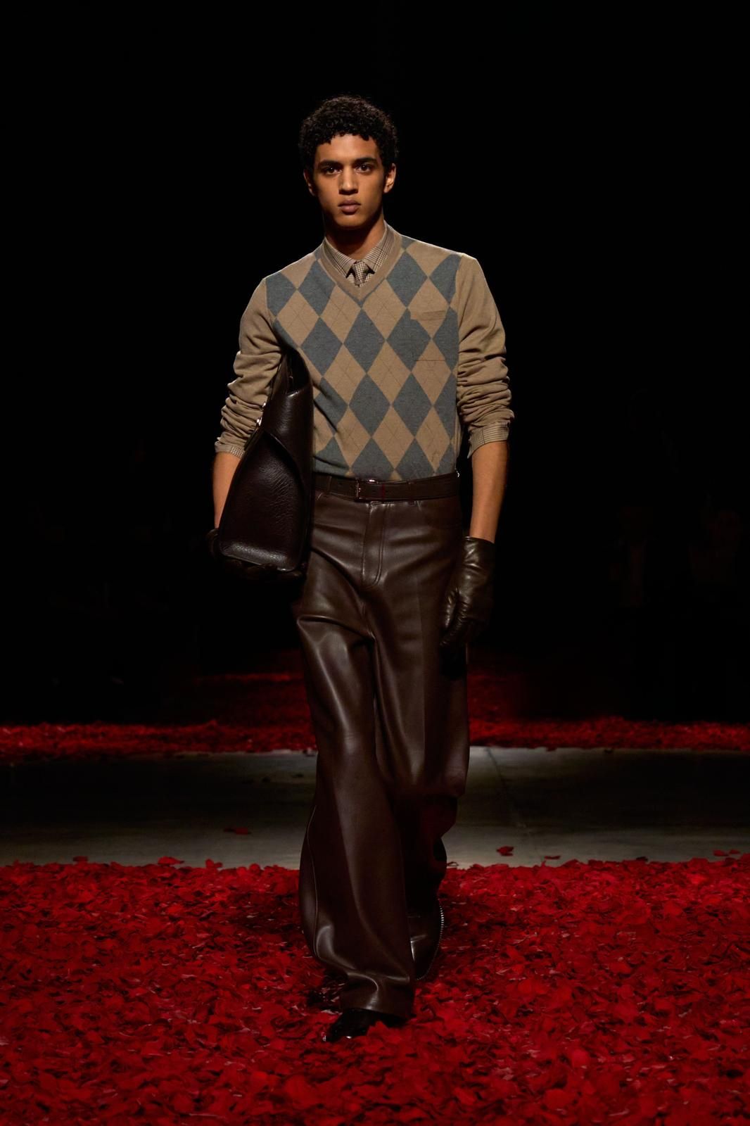 Even in the latest fashion proposals, a preppy reading of the pattern hasn't been missing: Pharrell Williams at Louis Vuitton creates a cardigan with embroidered beads that reprise the diamond pattern, while Thom Browne proposes it on a checkered pleated skirt. Elsewhere, at Proenza Schouler, the diamond sweater becomes a sort of asymmetrical scarf, while Maximilian Davis at Ferragamo in his latest winter collection creates a contrast between the formality of the argyle sweater and the eroticism evoked by gloves and leather pants. Michael Rider in his debut collection for Celine celebrated the pattern by proposing argyle sweaters paired with riding pants complete with thick, round glasses. Jonathan Anderson in the Resort 2026 of his eponymous brand has a community of artists and intellectuals, including actor Joe Alwyn and Bengi Unsal, director of the Institute of Contemporary Arts, wear the nerd sweater.