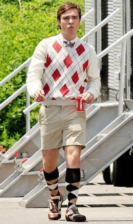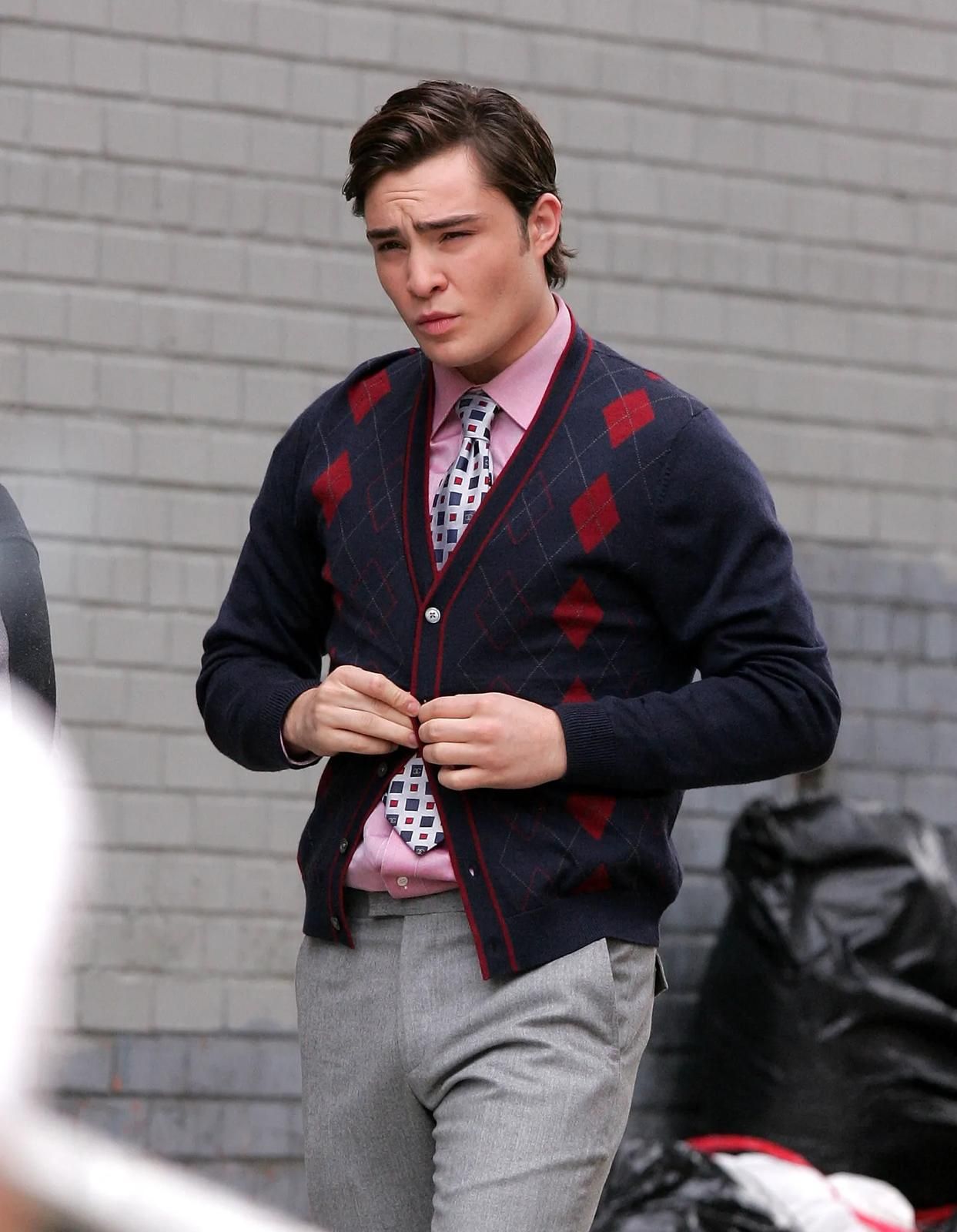 The argyle pattern has been and is still partly today, thanks to the big screen, identificatory of the classic nerd look if we think of Raj Koothrappali in The Big Bang Theory or Ryan Evans in High School Musical, but in reality the pattern originates in the upper echelons of society. Initially, the weave decorated socks and kilts of the Scottish Campbell clan, then becoming the uniform of wealthy British men and thus a symbol of old money life between horseback rides in the countryside and golf tournaments. But the diamond sweater, traditionally tied to a schoolboy style, has often also been portrayed in cinema and fashion in its preppy version: in Gossip Girl, Chuck Bass often wears one, while Gretchen Wieners in Mean Girls uses it as the uniform of the sexy student.
