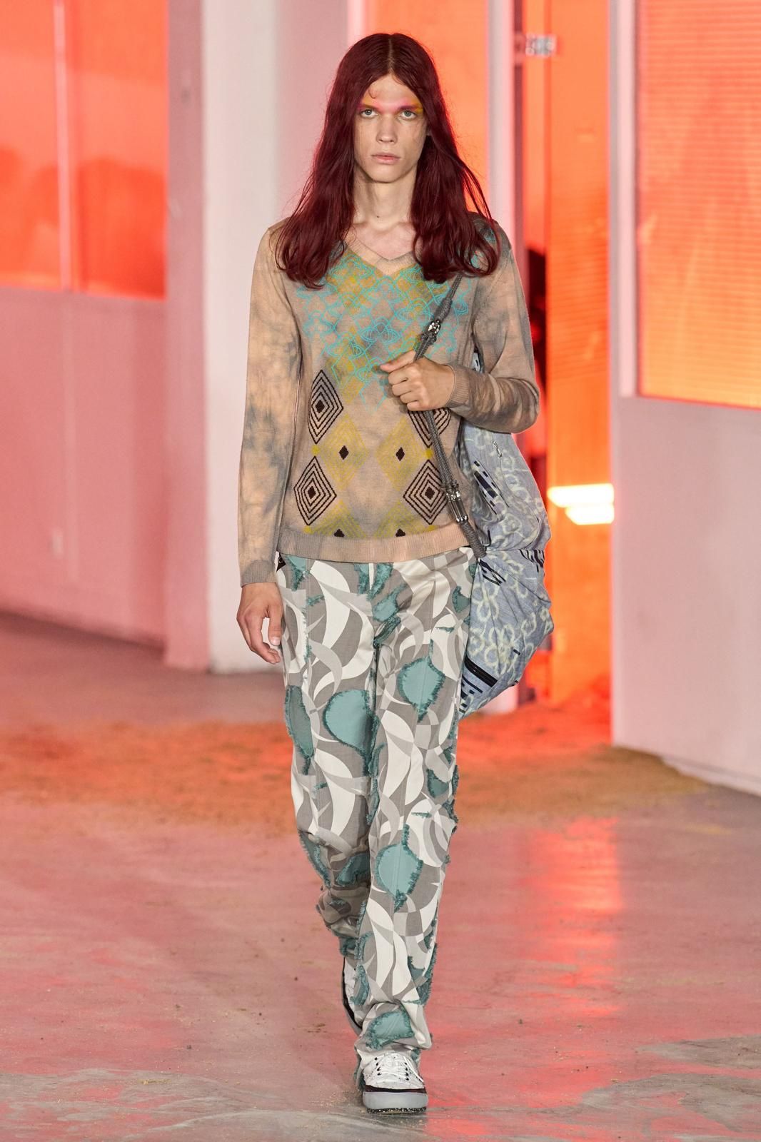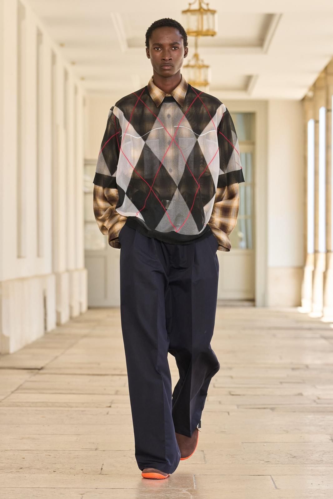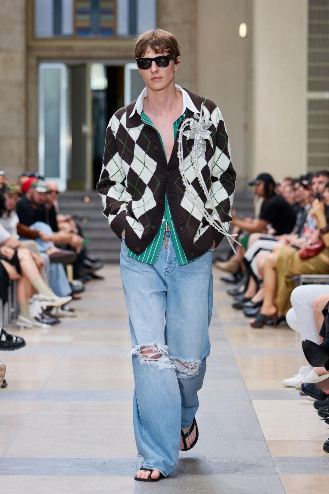 Even David Koma opts for a relaxed style in his first menswear collection, proposing an argyle cardigan paired with ripped jeans and flip-flops, while at Meryll Rogge and Kiko Kostadinov the sweater patterns are similar to kaleidoscopic figures and geometric patterns used for hypnosis. Again, the brand Kolor plays with layering by having a checkered shirt worn under a sort of transparent knit that reprises the argyle pattern with the classic red diamonds embroidered in the SS26. In some cases, the pattern is even perforated: Alexander Wang almost seems to engrave the diamond motif, making the underlying shirt dress stand out, while at Etro we find a sort of knitted sweater that recalls fishermen's nets in the collection. All that's left is to open grandpa's closet or take a quick look on Vinted to wear the sweater of the season.