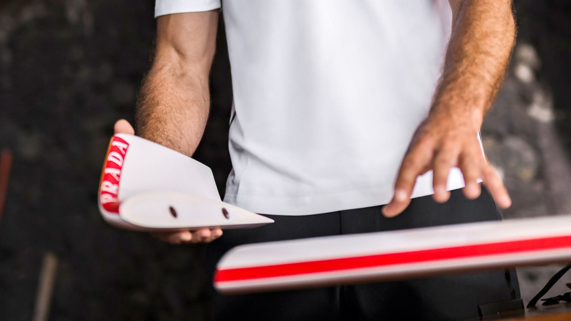Prada Linea Rossa supplied the technical equipment used during the test, focusing on high-performance materials designed to withstand significant aerodynamic stress. The brand’s approach was to adapt functional accessories and components to the needs of the body in motion, ensuring lightness, protection and adherence.