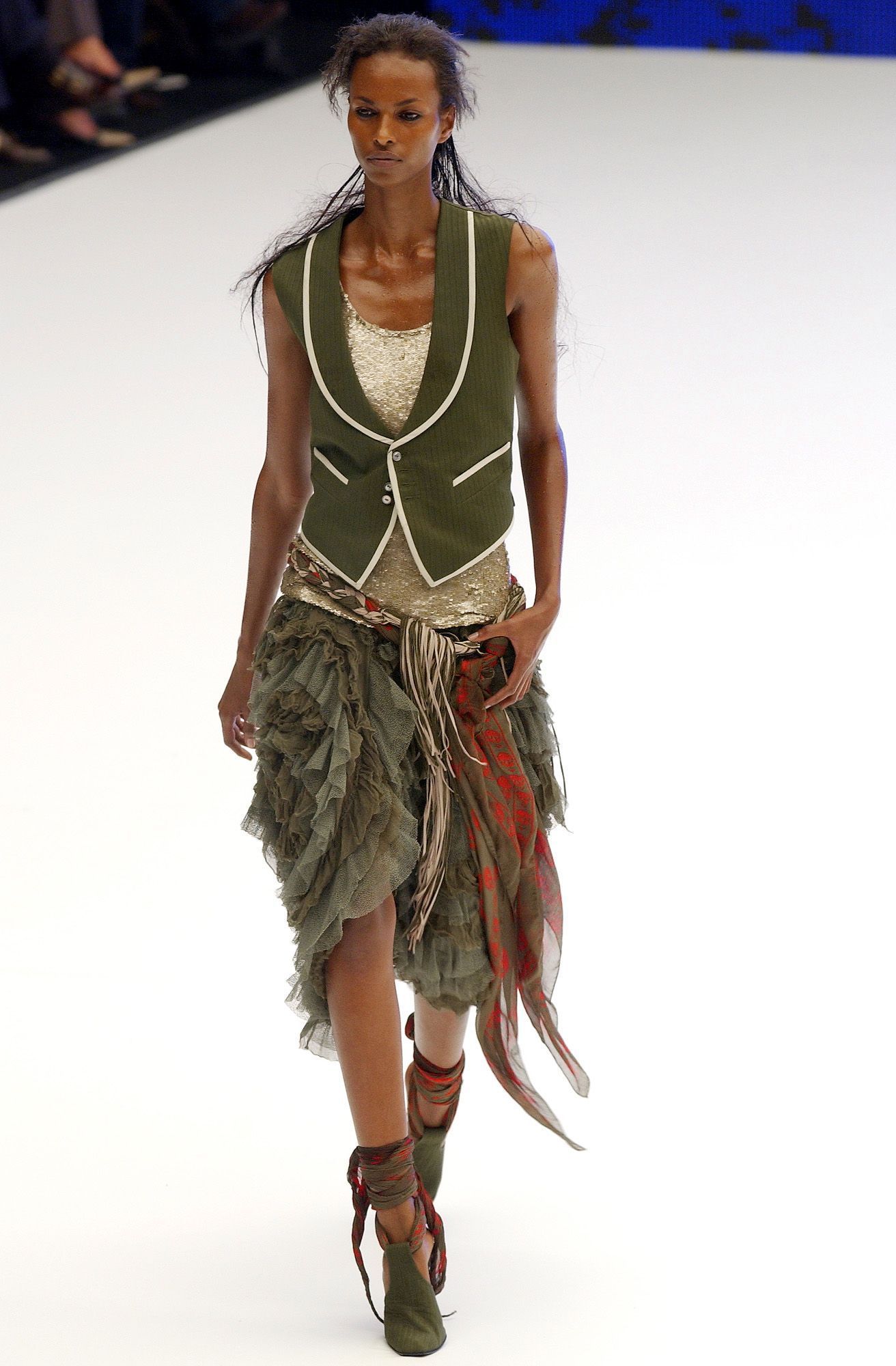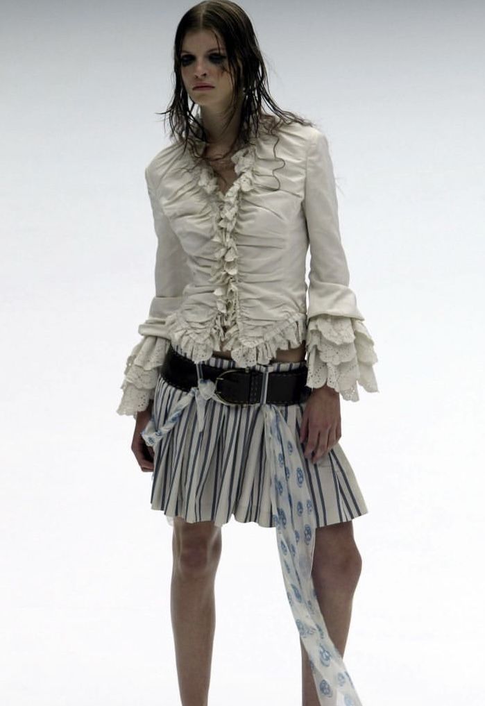 McQueen found the solution to the pressures from the major groups in the early 2000s. For SS03, titled Irere, the designer took inspiration from pirate adventures and the imagery of the Amazon rainforest. While the oyster dress - named because the hundreds of circular organza veils it was composed of evoked the image of an oyster - left the audience speechless for its technical elegance, it was the Skull Scarf that left a mark on the market, tied around the hips and handbags of dozens of models. The motif naturally drew inspiration from pirate flags, while the show’s styling - and therefore the decision to accessorize so many looks with these bandanas - was signed by Katy England, McQueen’s right-hand woman.