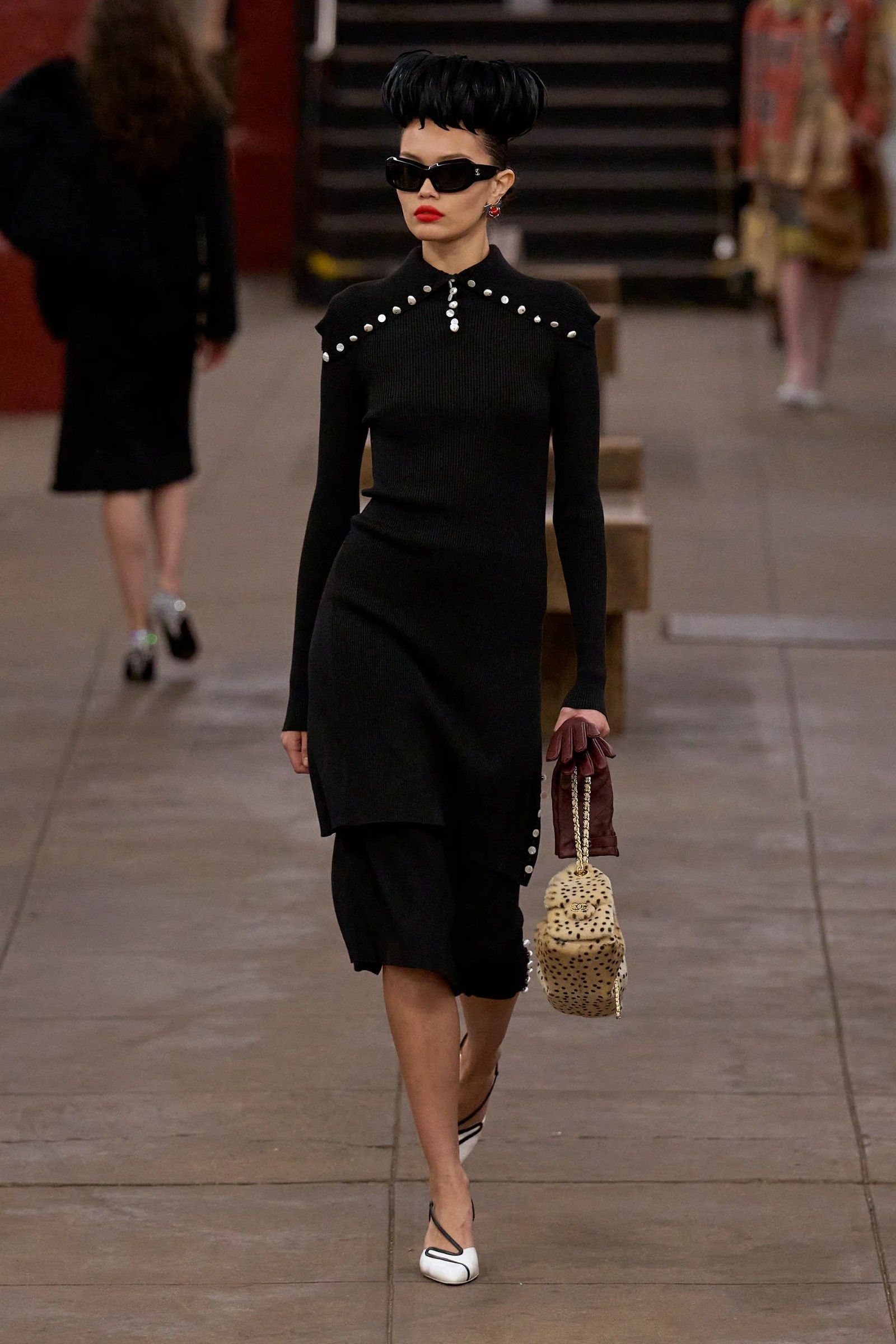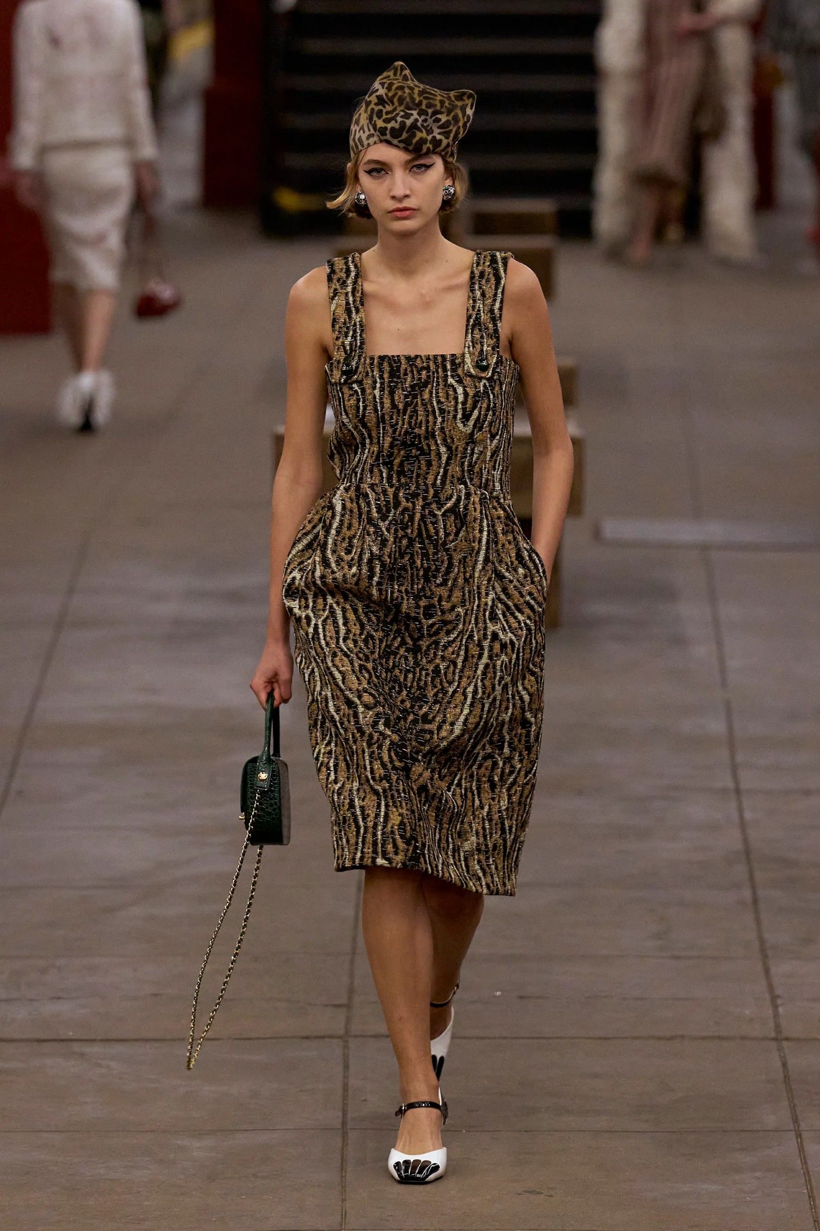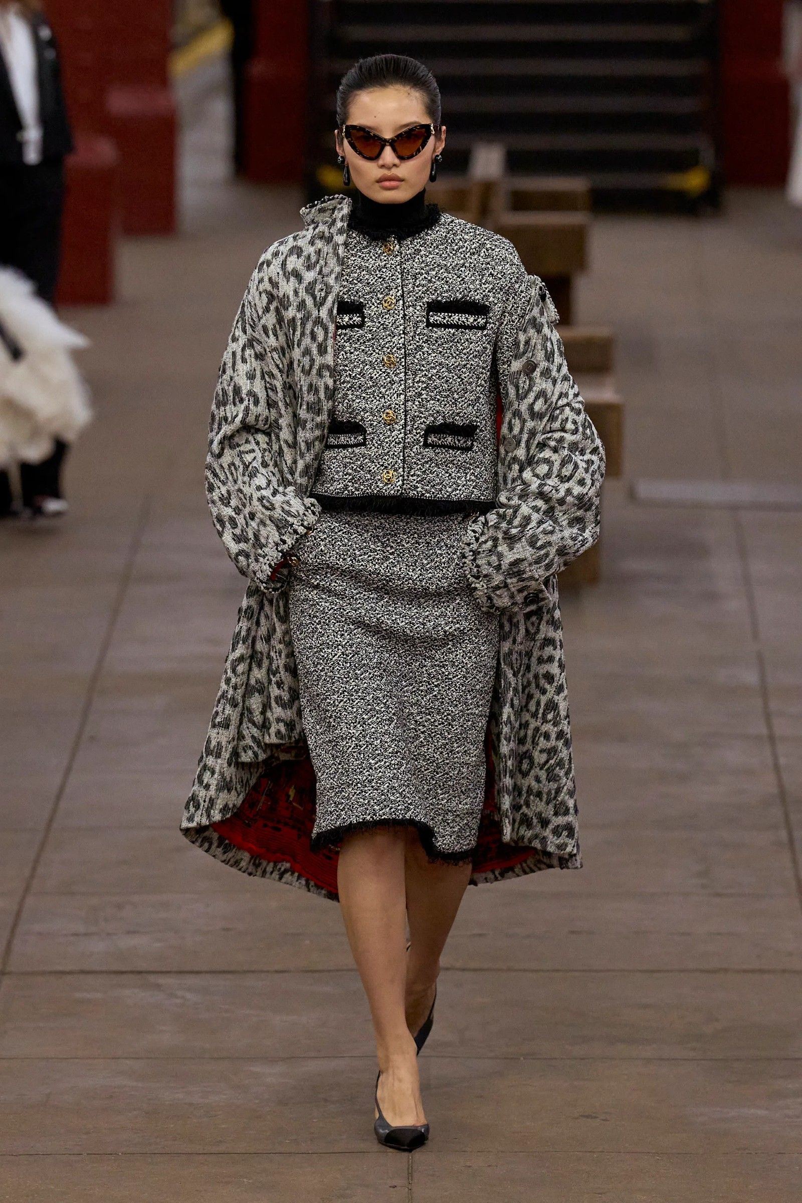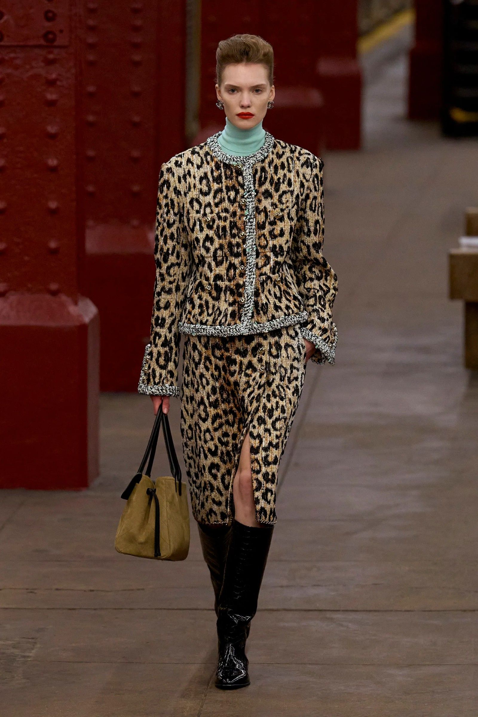 Yesterday we witnessed the return of that refined campiness: a flood of leopard jackets and dresses, the I Love New York T-shirt paired with the classic tweed suit, theatrical feather boas, a jacket-and-shirt look under which peeked a sweater referencing Superman’s costume, Alex Consani in pinstripes and fedora like a Prohibition-era gangster, a full look covered in puppy prints and another in ladybugs, two-tone shoes with cartoon eyes on the uppers. All signs of ironic self-satisfaction that lightened the usual gravitas of Chanel’s savoir-faire.