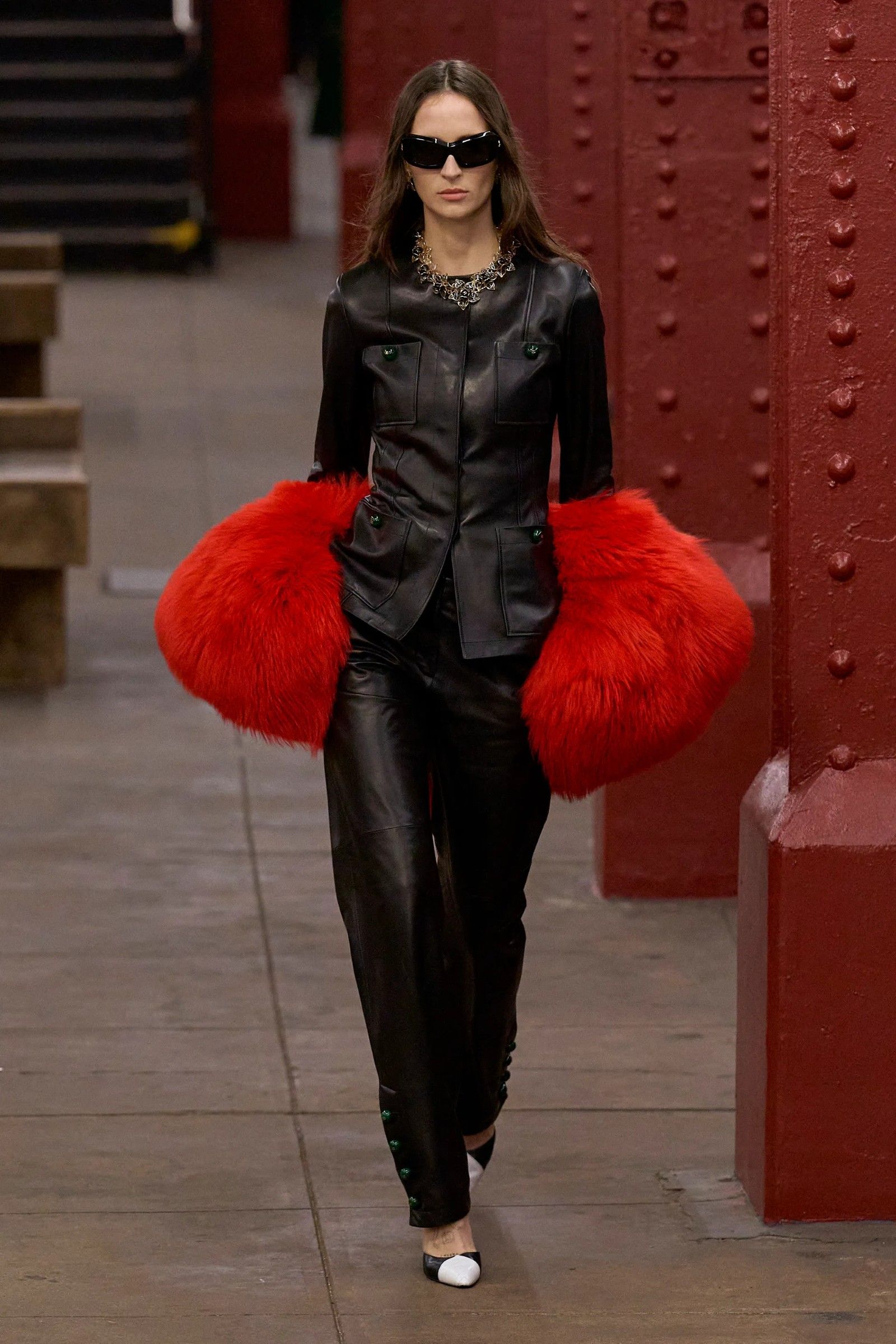 Excluding the looks where red was the dominant color (there were several, including a jewel-encrusted dress that faded from red to white in a delicate gradient), red also appeared as clothing pieces within darker looks: a burgundy shirt, a turtleneck peeking out from a leather trench, and of course a shiny sequined dress almost engulfed by lush black fur.