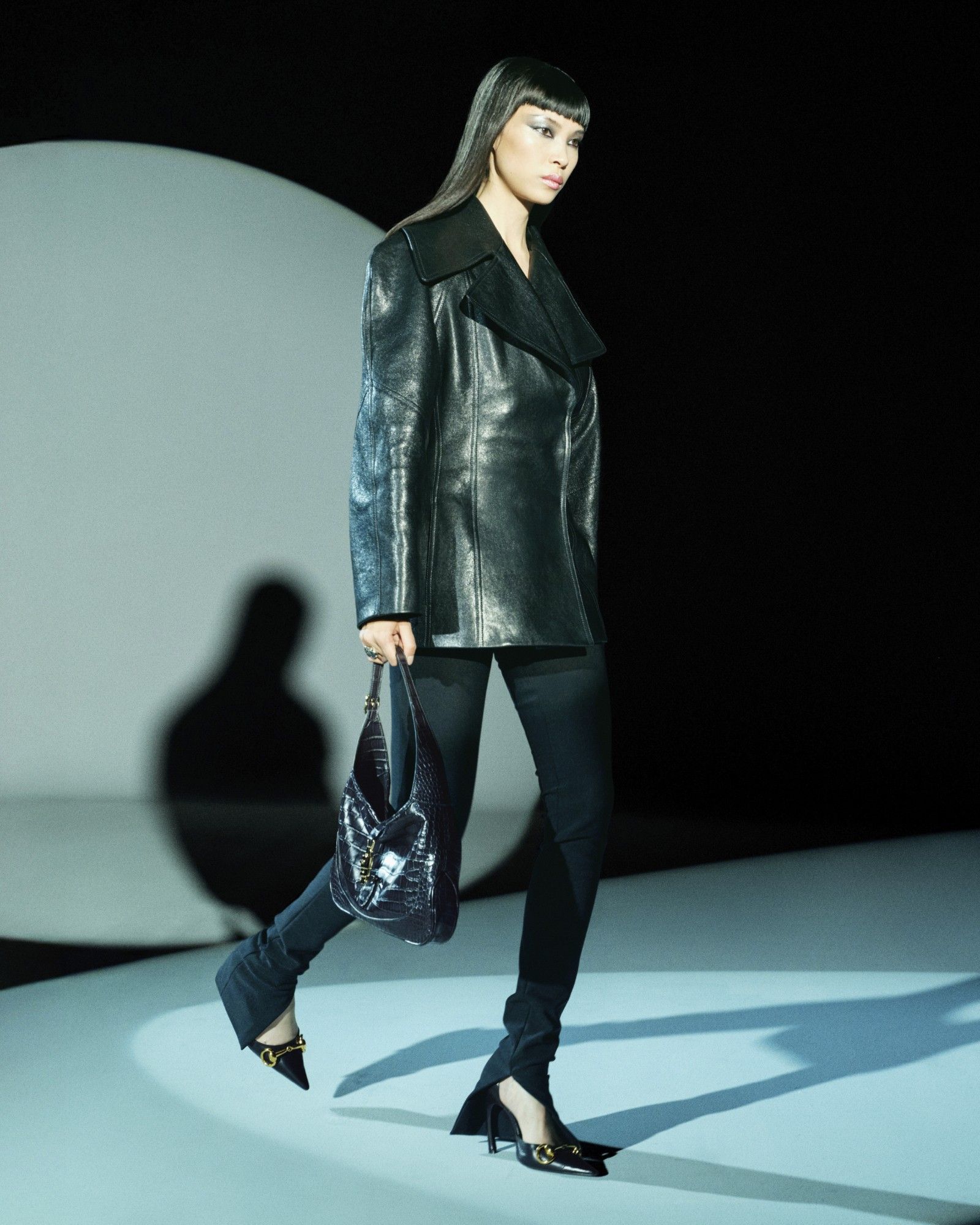 - While certain looks evoke the sculptural eroticism of the Tom Ford era or the sporty Y2K aesthetic associated with David Beckham, the actual construction goes in the opposite direction: rigid structures are hollowed out and lightened, while trousers, turtlenecks and leather jackets cling to the body, creating a contrast between fluidity and tension.
