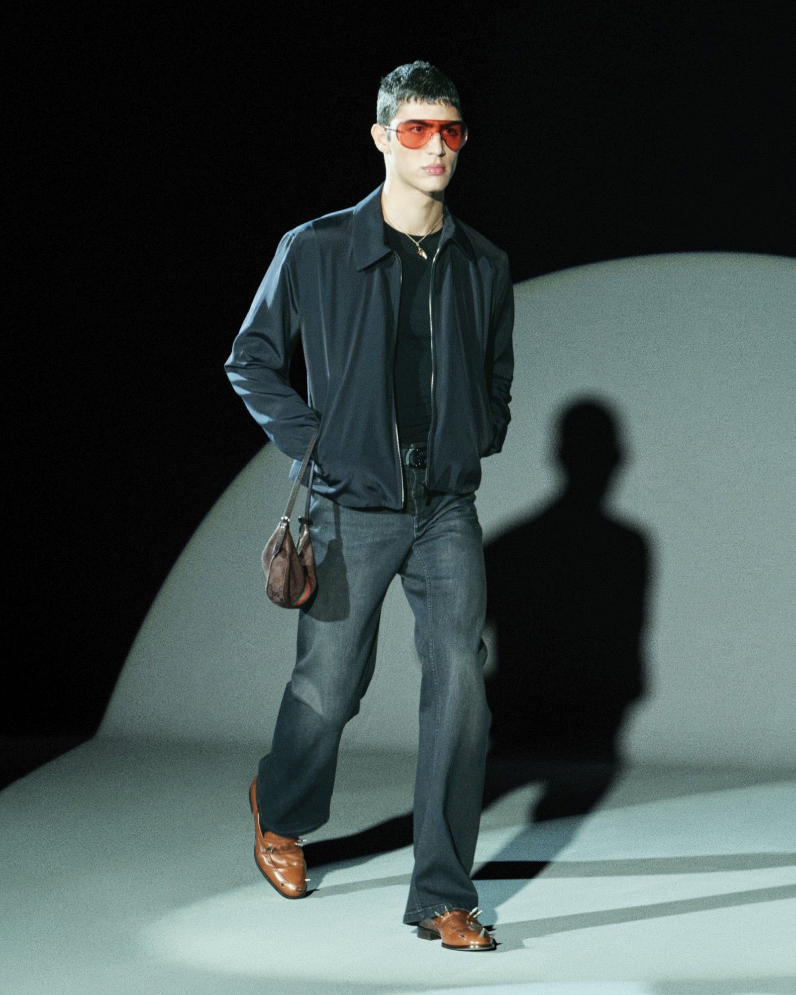 Beyond these nostalgic references (perhaps the most nostalgic is the canvas belt with the metal buckle), many combinations are extremely Demna-esque: first of all the proportions and draping of the tailoring, then the minimalist combo of blazer and jeans with pointed shoes, the oversized women’s blazer, the suede pussy-bow dress, the loden buttoned right to the top and the shiny leather micro-jackets that leave exposed a thin, mischievous strip of skin just below the navel, the micro-sunglasses combined with slicked-back, centre-parted hair, the turtleneck tucked into jeans without a belt, the high-neck T-shirt, the moto jackets.