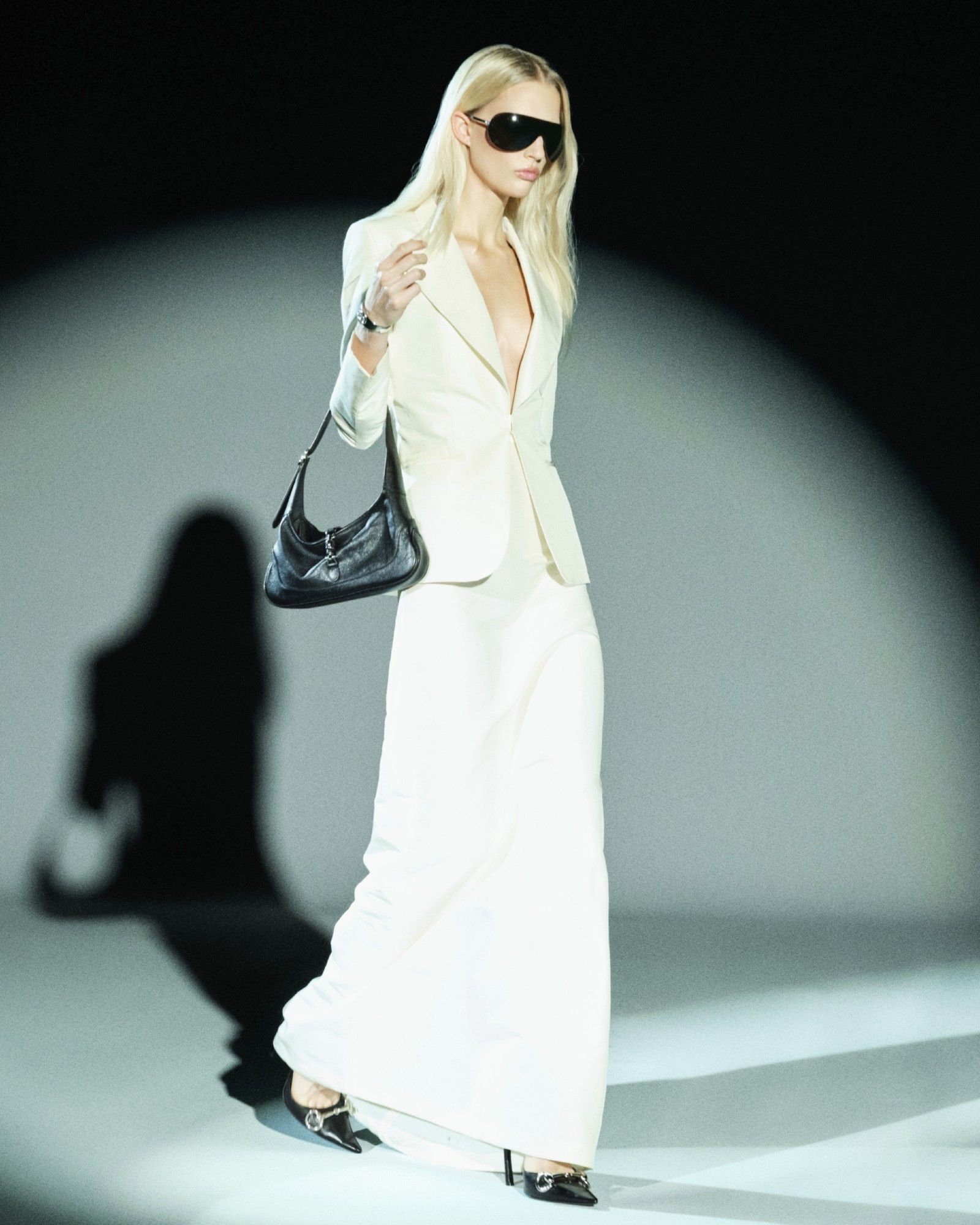 It is obviously impossible not to notice the quotations and nods to the Tom Ford era: furs and suits on bare skin, asymmetric and plunging evening gowns, pencil skirts into which silk shirts dive completely open, the skin-tight leather catsuit that Catwoman would love, that micro-python jacket, lace trousers, silk dressing gowns.