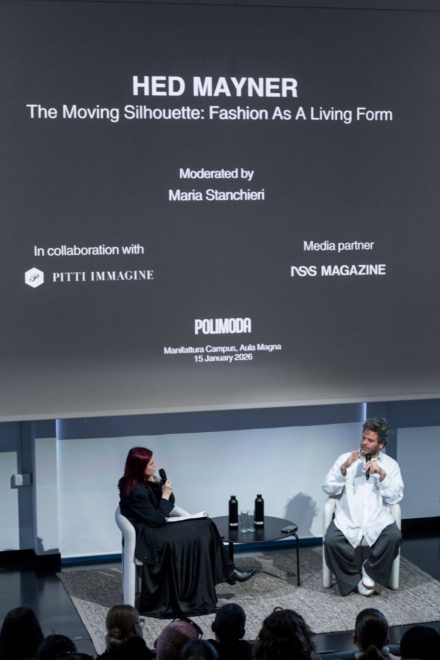 The second lecture took place on January 15 at 10:00 am with The Moving Silhouette: Fashion as a Living Form by Hed Mayner, shifting the focus to the body and the garment. The lecture explored the silhouette as a dynamic structure, in which clothing does not impose a form but reacts to the movement of the wearer. Through generous volumes and fluid constructions, Mayner described a fashion practice that engages with the body rather than constraining it. In his talk, the designer expanded on the symbiotic relationship between garment and body, the distinction between real and perceived movement, obsession as part of the creative process, and the central role of tailoring and craftsmanship, as well as the influence of places such as Paris and Italy on the development of his visual language.