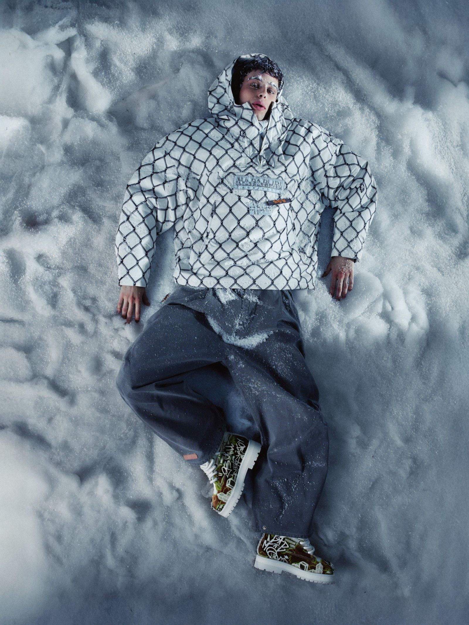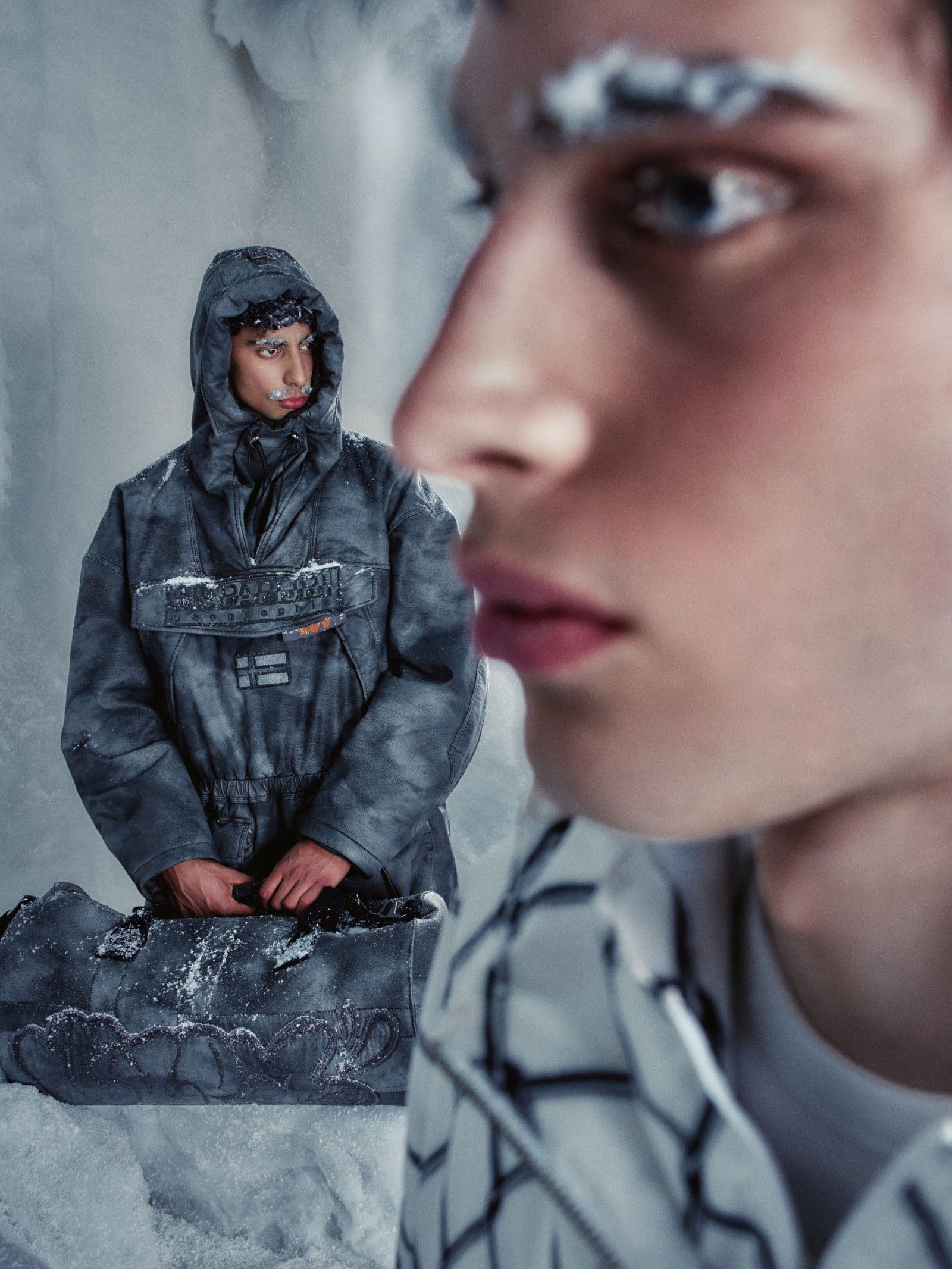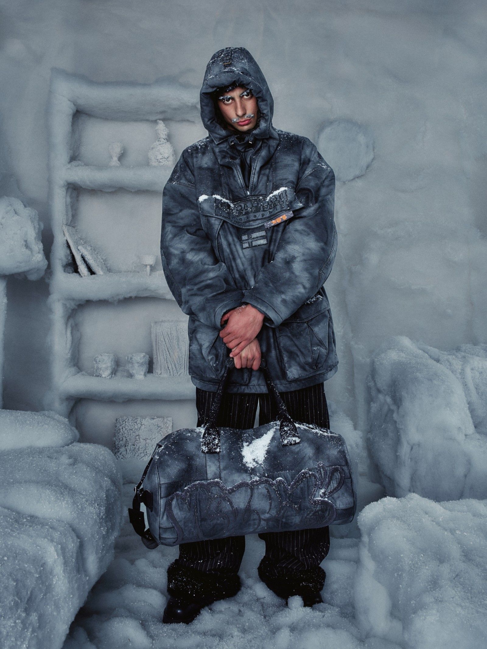 The outcome is a collection built entirely around tension and contrast. Napapijri’s signature pieces—such as the Skidoo, Rainforest, and Bering models—serve as the foundation and are radically reinterpreted. Classic silhouettes expand into oversized volumes, proportions are inverted, cuts become asymmetrical or deconstructed. A traditional striped polo gains urban edge through technical inserts and unexpected finishes. Outerwear pieces like jackets and anoraks preserve Napapijri’s engineering precision while adopting a more aggressive aesthetic, featuring pronounced layering, oversized zips, and texture play that bridges pure functionality with high fashion.