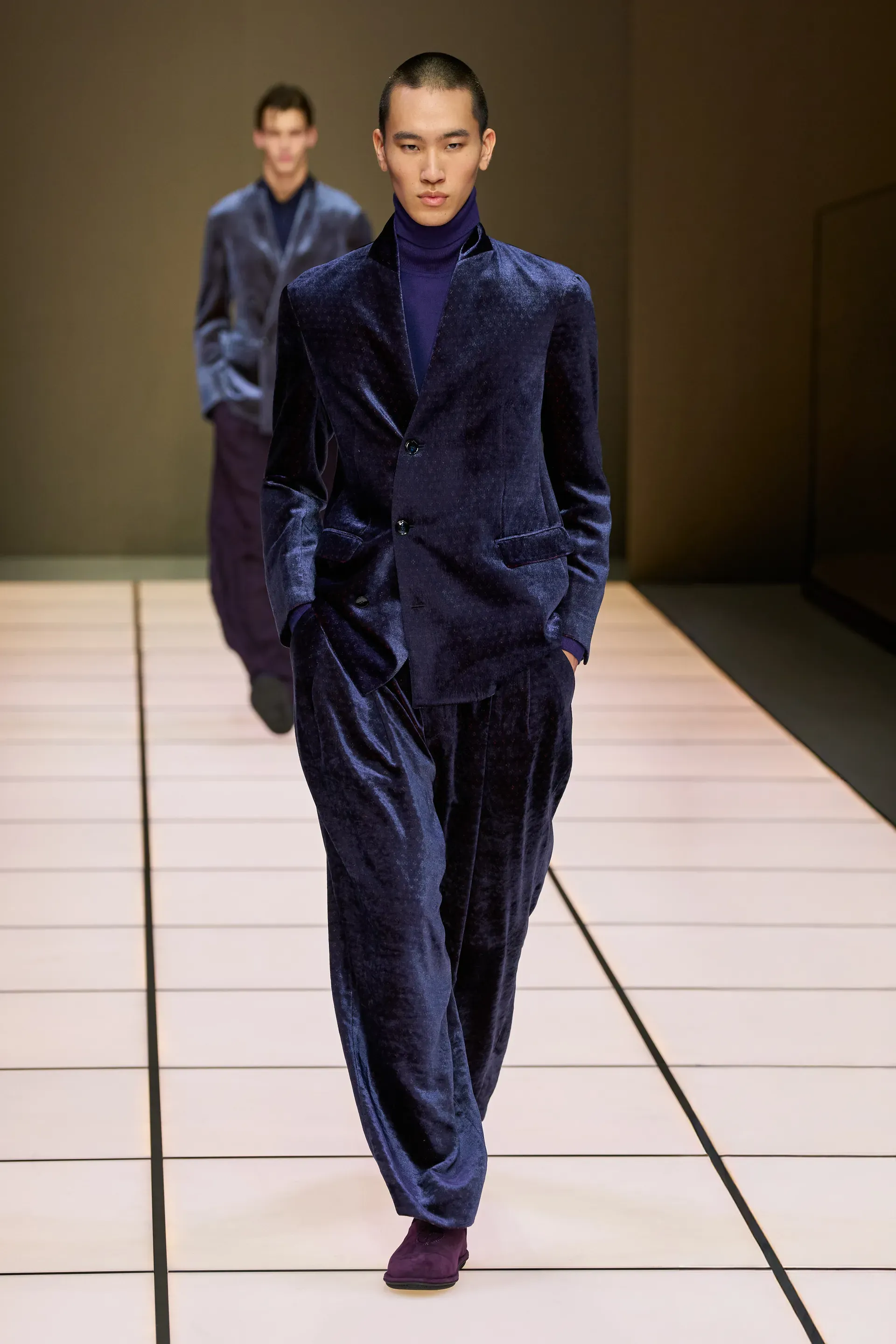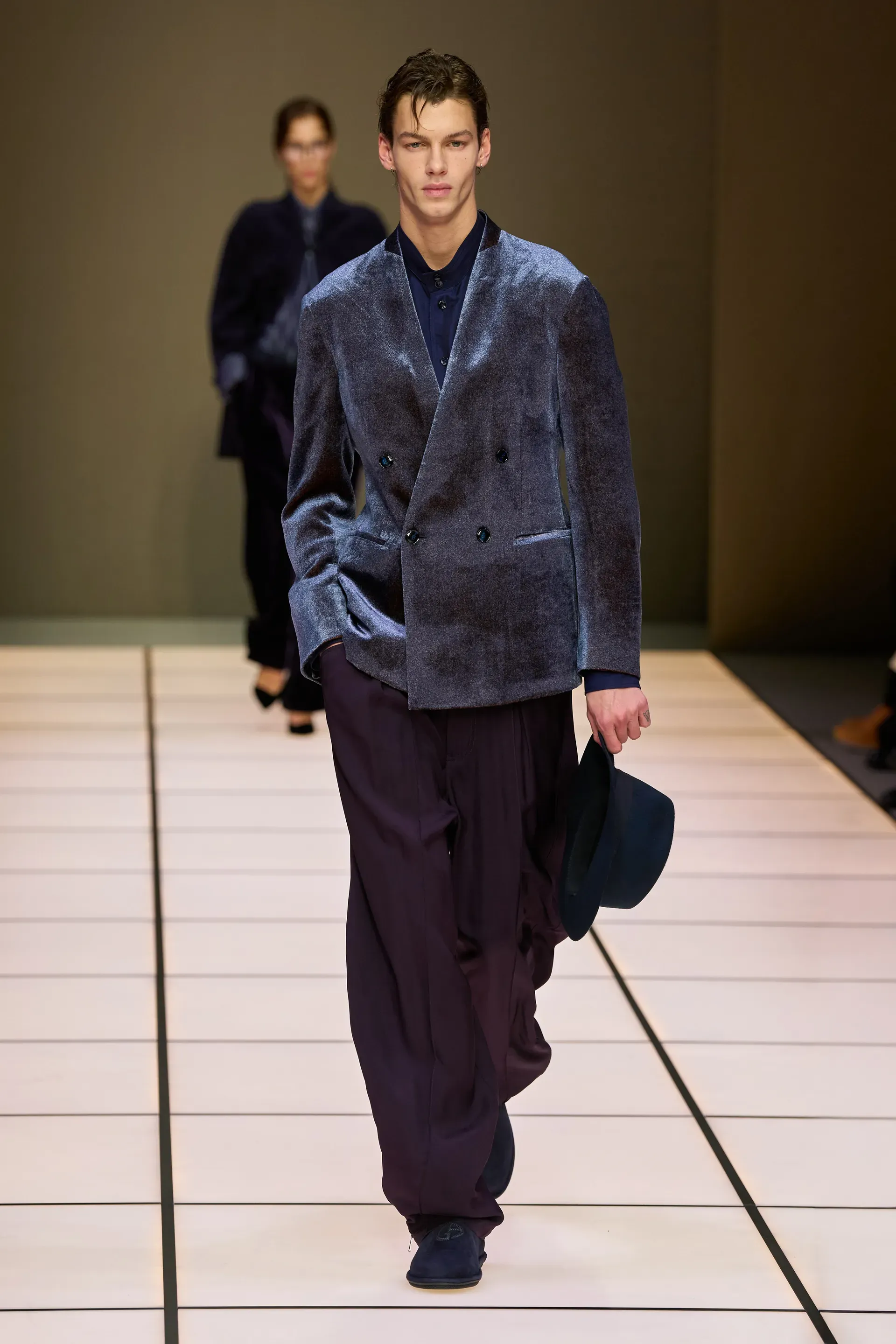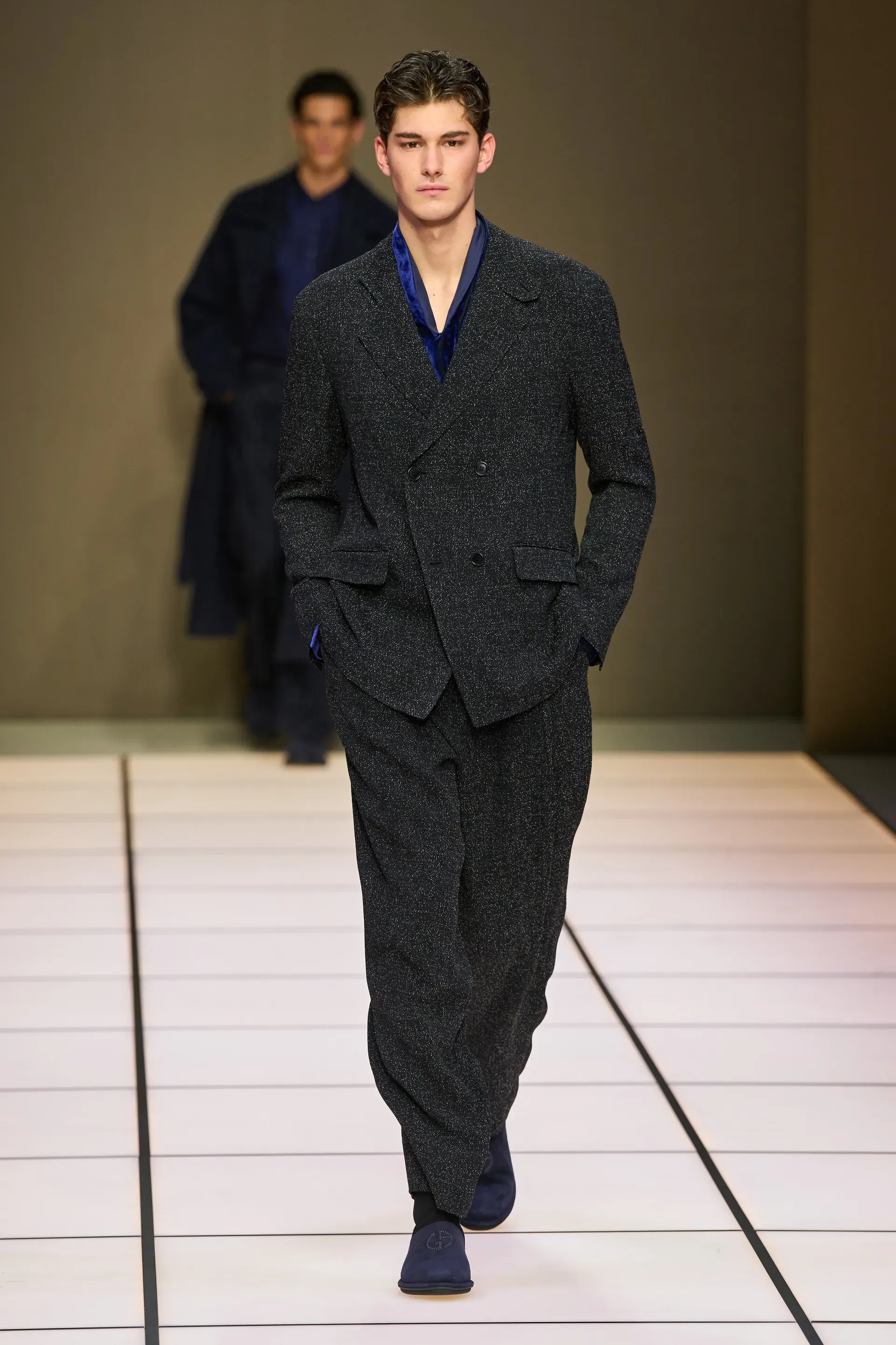 The show presented yesterday by the brand in Milan, among the last of fashion week, was, as always, quite monumental: 111 looks, some of them even in groups, which represented almost an inventory of the many (literal) markers of Armani's man. The choice, at least in the vision of Dell’Orco, who handles the menswear side, concerned a sense of continuity: there were the same heavy velvets, the dark and cool color palettes, the soft cuts, the knitwear with a retro flavor. Which does not mean that there were no variations from the classic script.