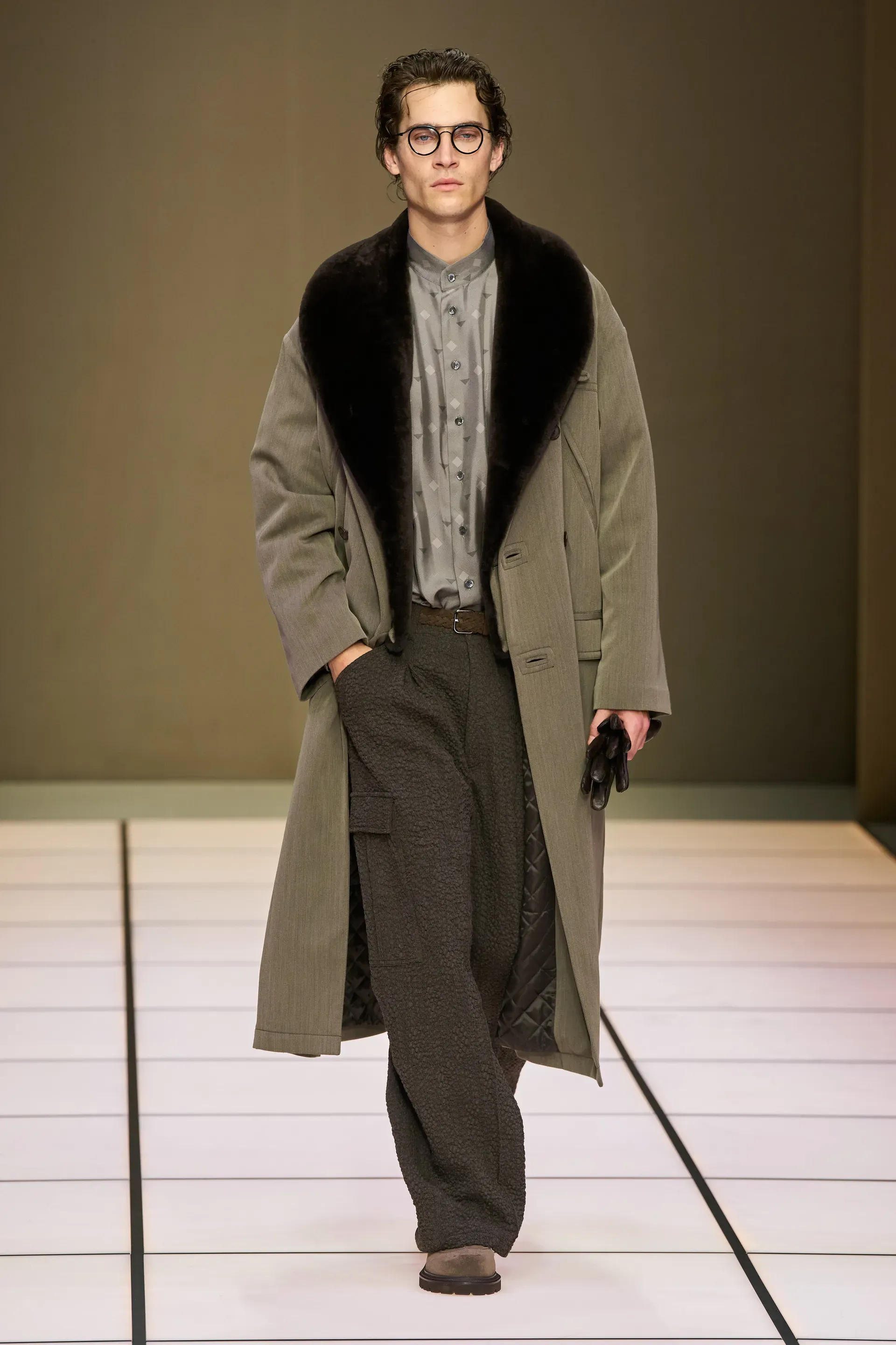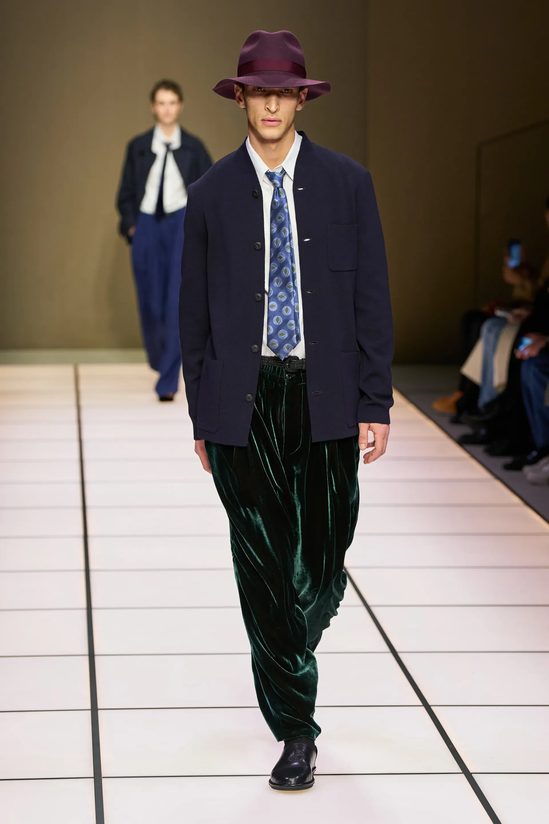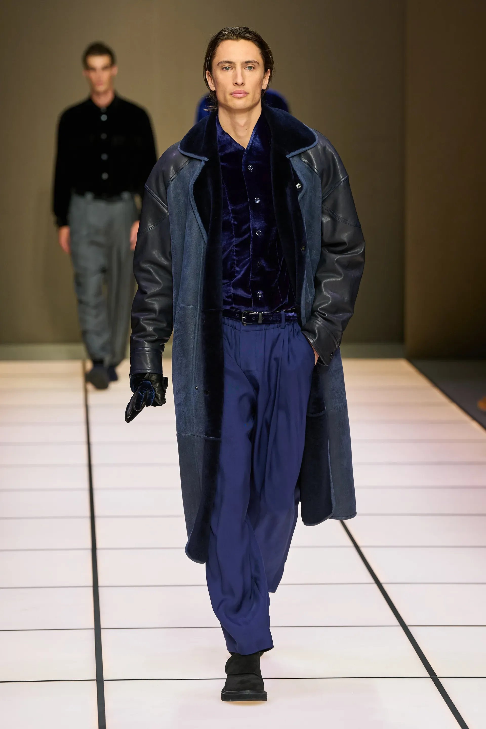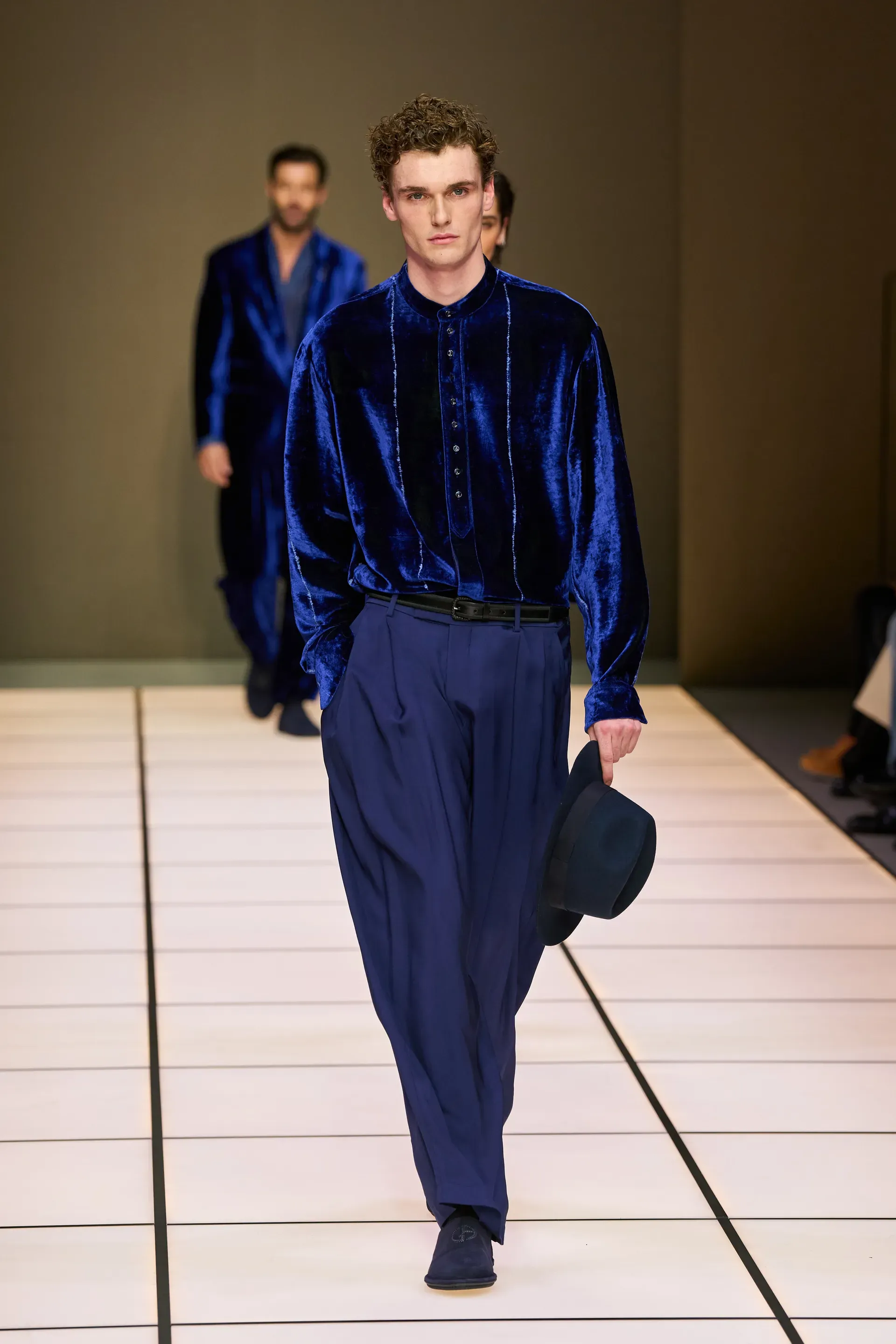 The show presented yesterday by the brand in Milan, among the last of fashion week, was, as always, quite monumental: 111 looks, some of them even in groups, which represented almost an inventory of the many (literal) markers of Armani's man. The choice, at least in the vision of Dell’Orco, who handles the menswear side, concerned a sense of continuity: there were the same heavy velvets, the dark and cool color palettes, the soft cuts, the knitwear with a retro flavor. Which does not mean that there were no variations from the classic script.