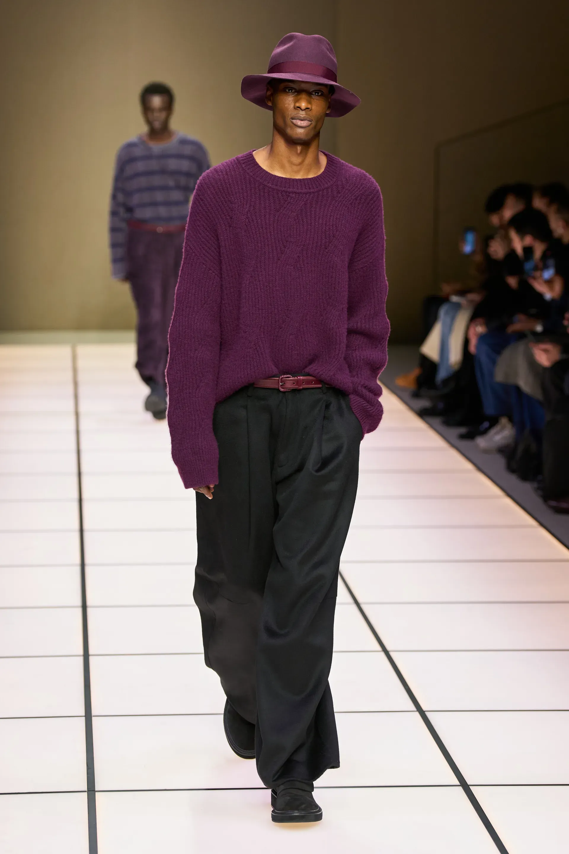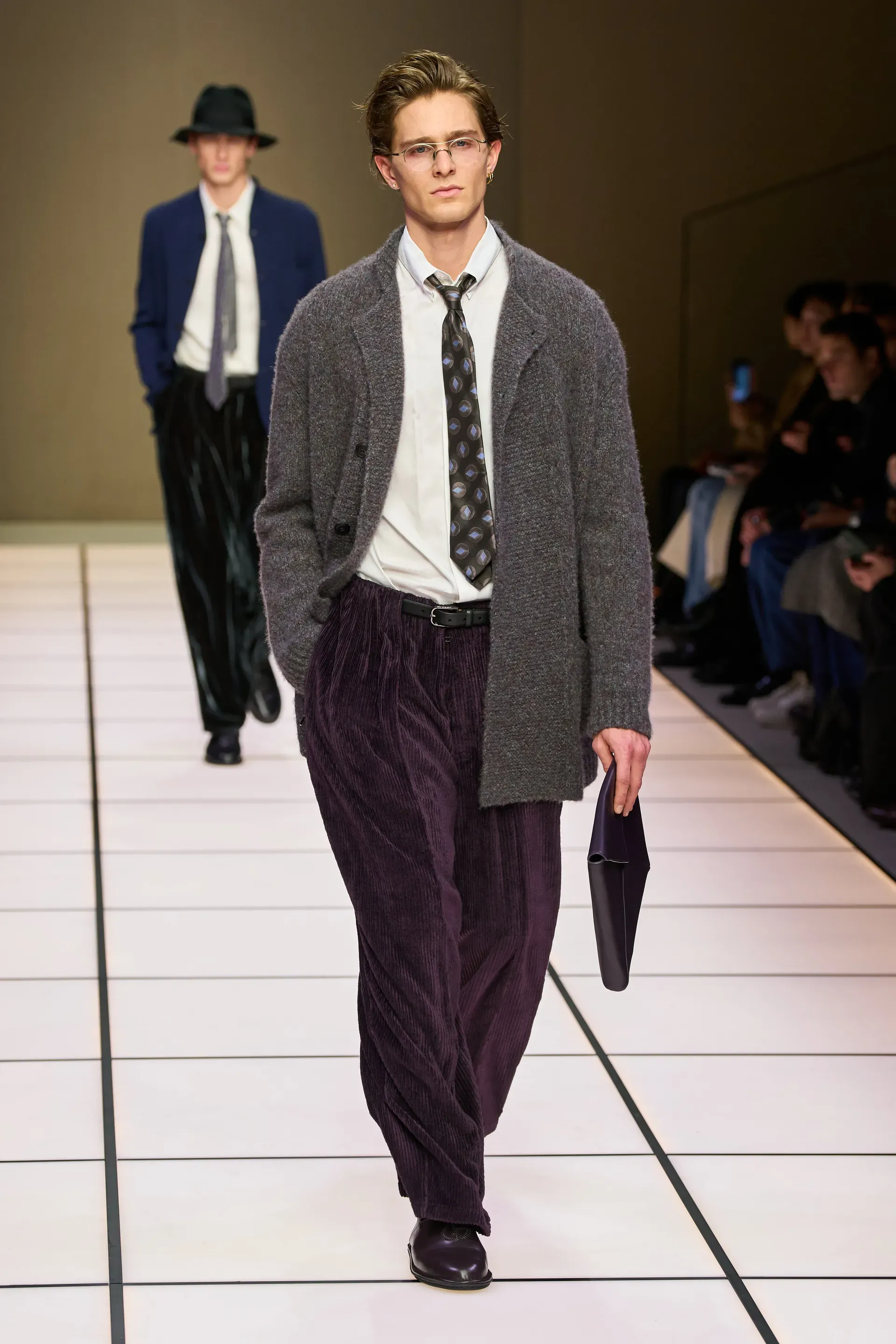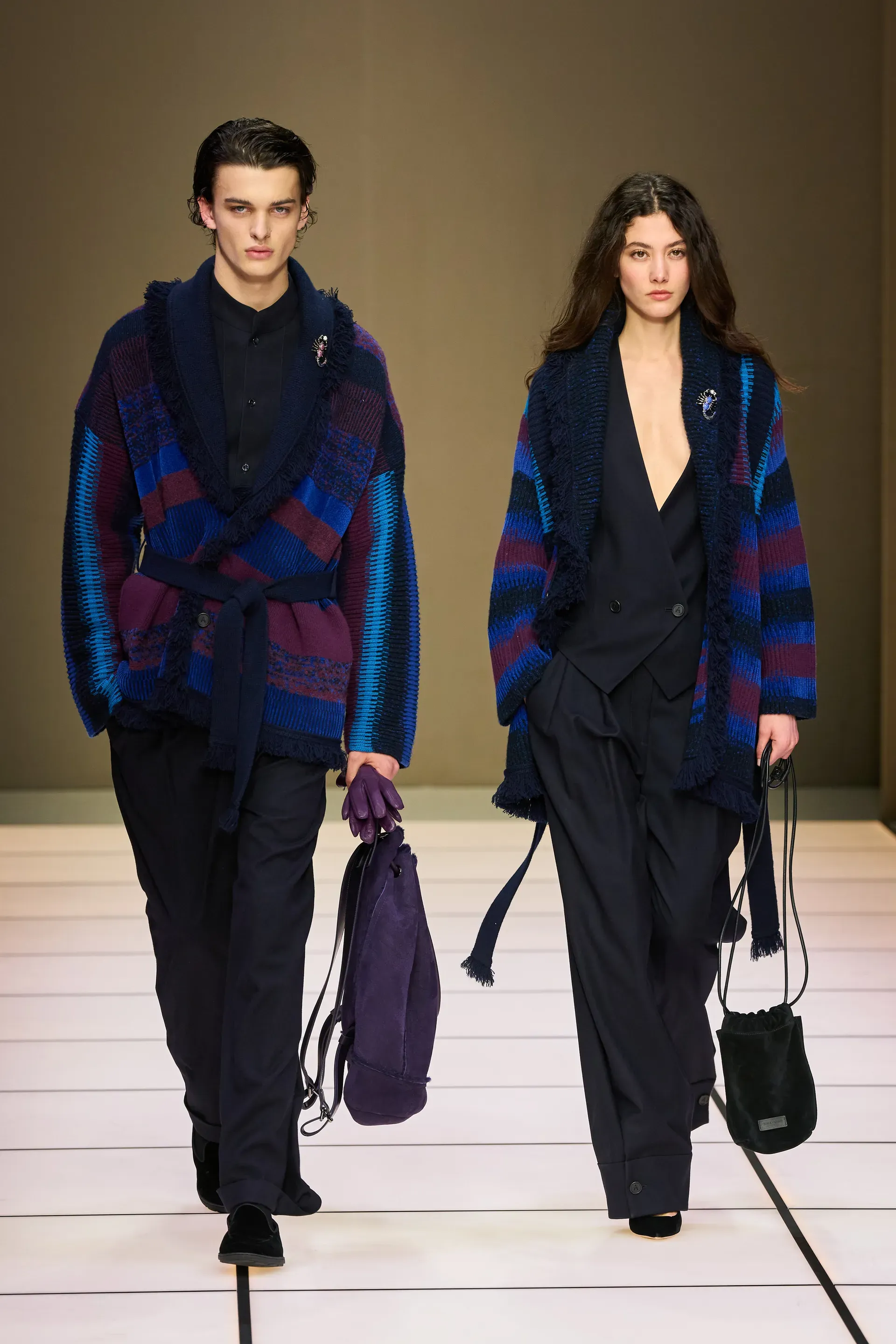 After what we could call an interlude dedicated to the Neve collection (very important with the upcoming Winter Olympics) some purple looks appeared, shearling jackets and more fitted trousers to the body, a series of ensembles more iridescent than usual even if always very Armani, and above all a shawl-collar cardigan created in collaboration with Alanui, the first time that a collaboration with an external brand appears on the brand's runway.