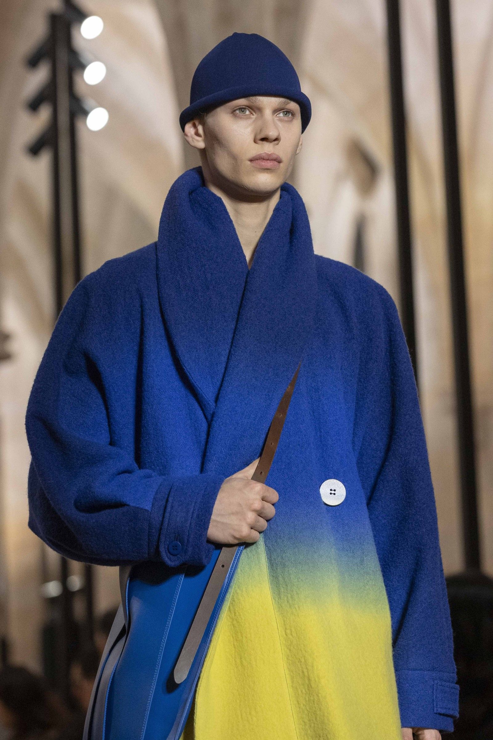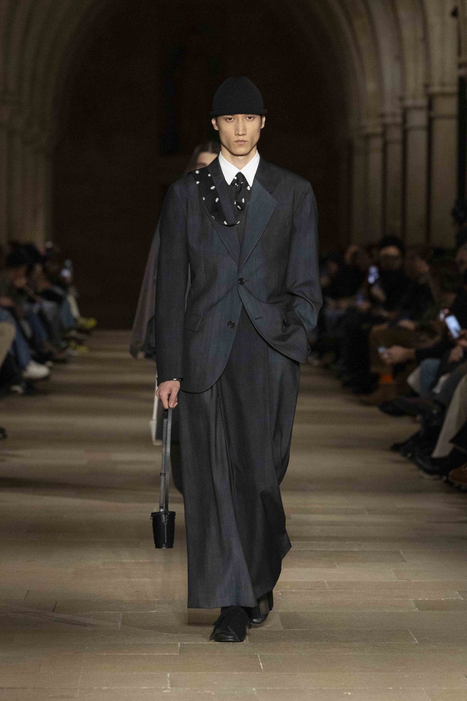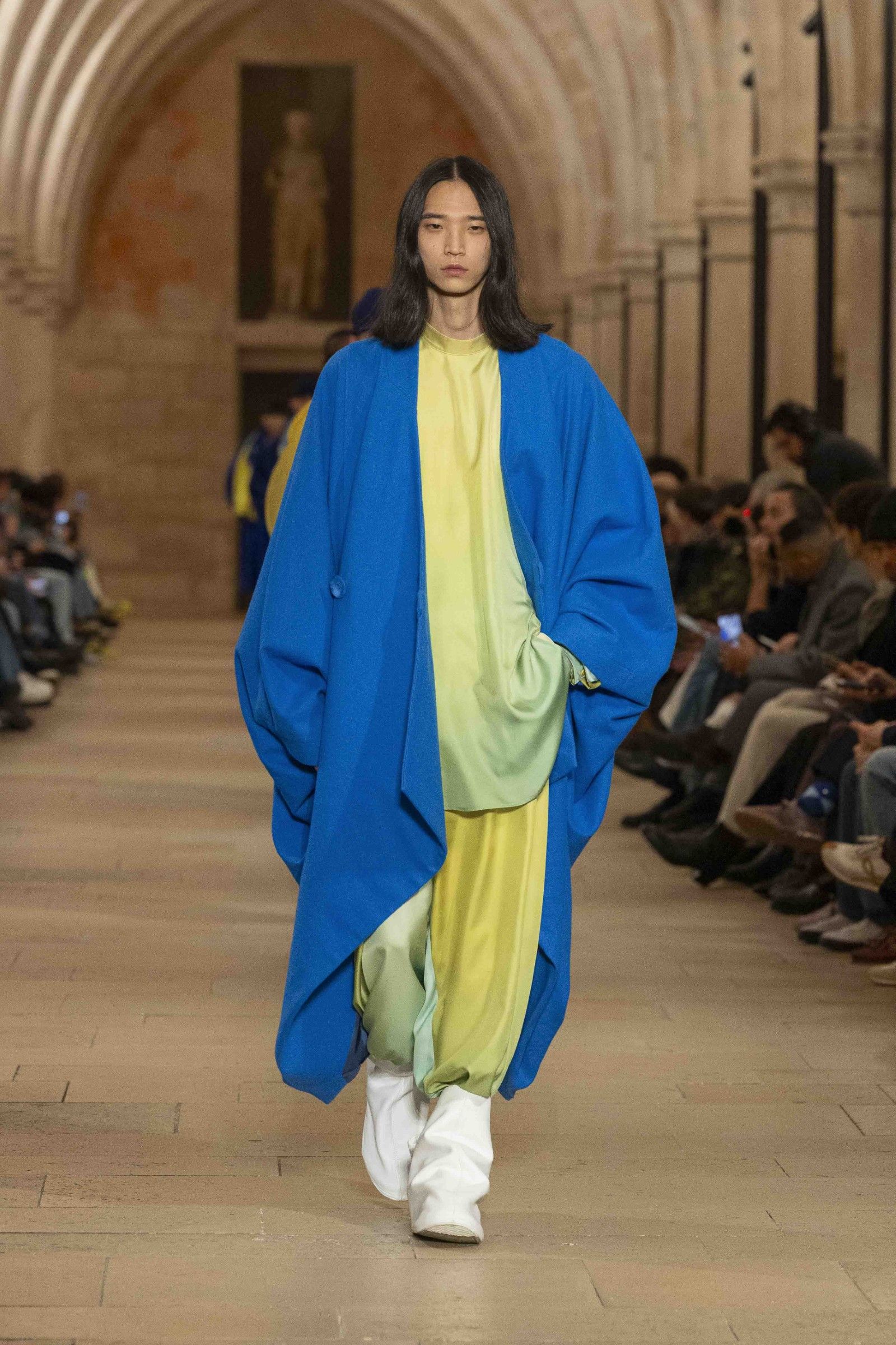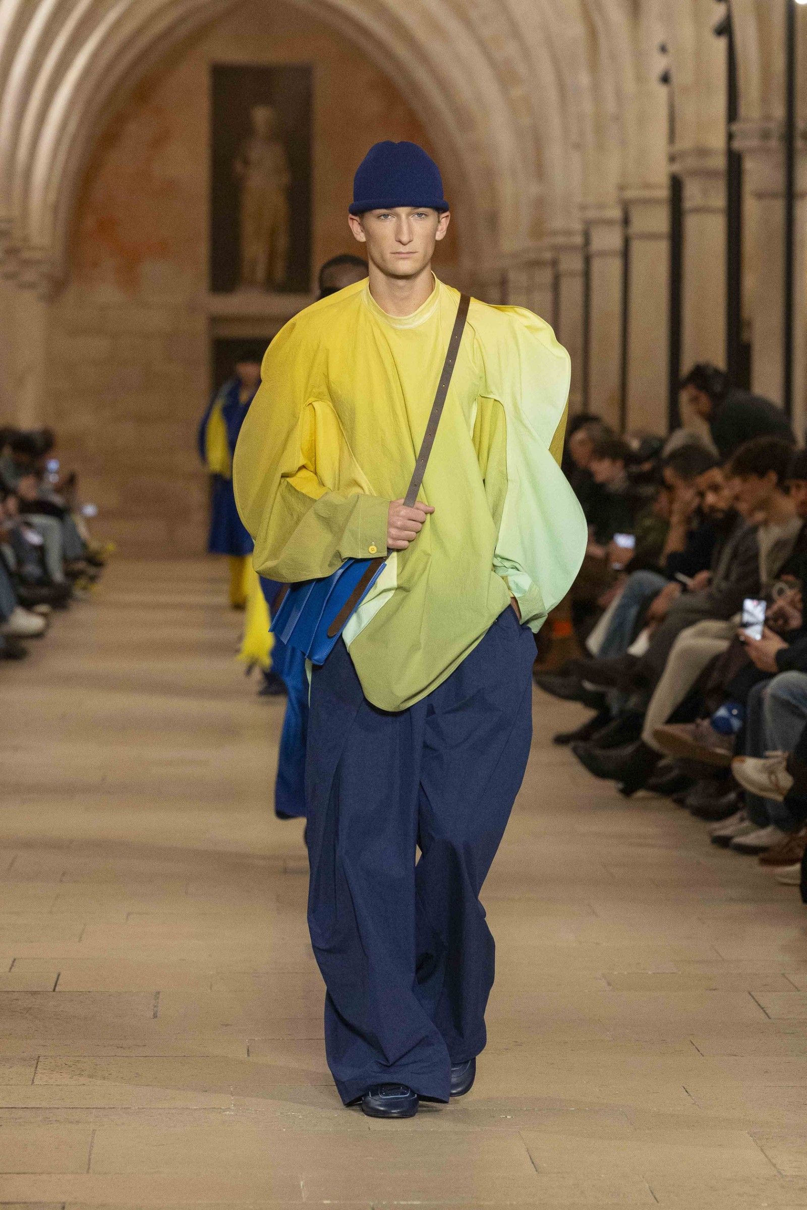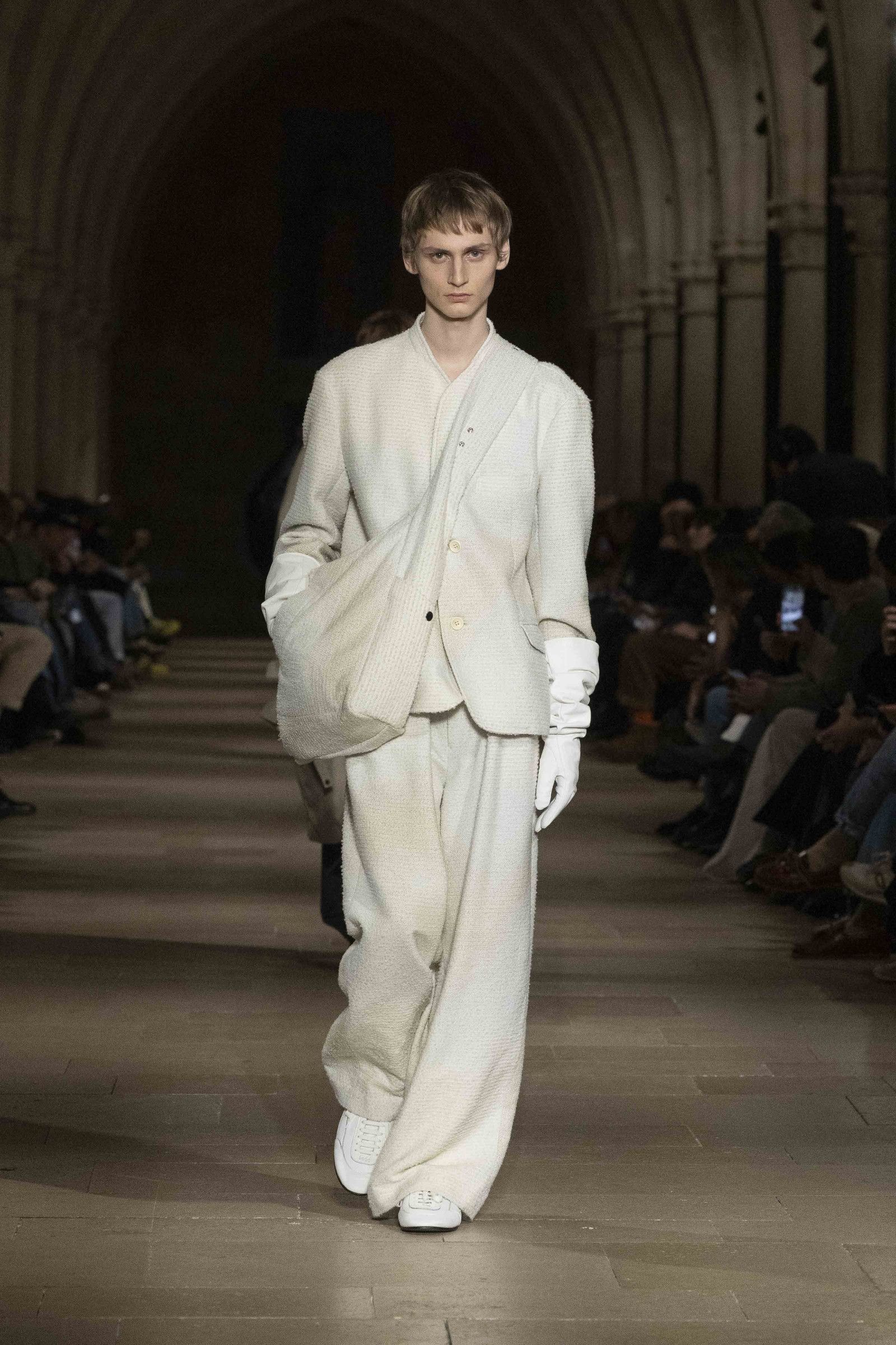 During the show, a sense emerged that formality is not imposed by rigid schemes, but springs from an inner essence, where the abstract beauty of the silhouettes translates into versatile and pragmatic garments, however conventionally elegant. Inspired by the shifting colors of the sky, ranging from the black of night to the violet of dawn and the blue and yellow of midday, the collection turns fabric into a medium for inner expression. The proposal, however, unlike the previous collection, opens a dialogue with traditional men's tailoring that at first glance is recognizable but in reality becomes increasingly experimental look after look.