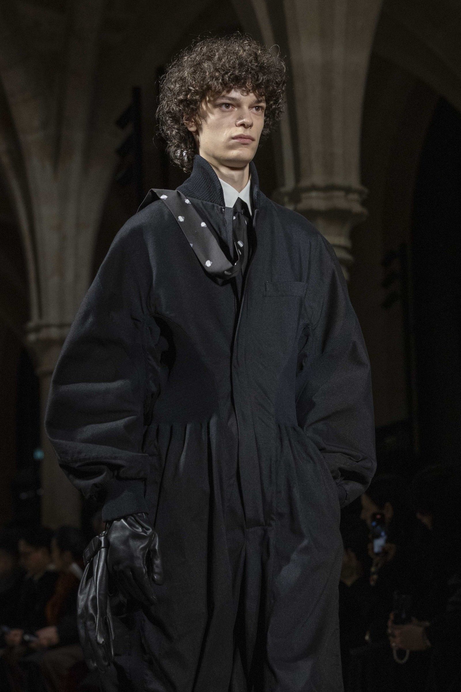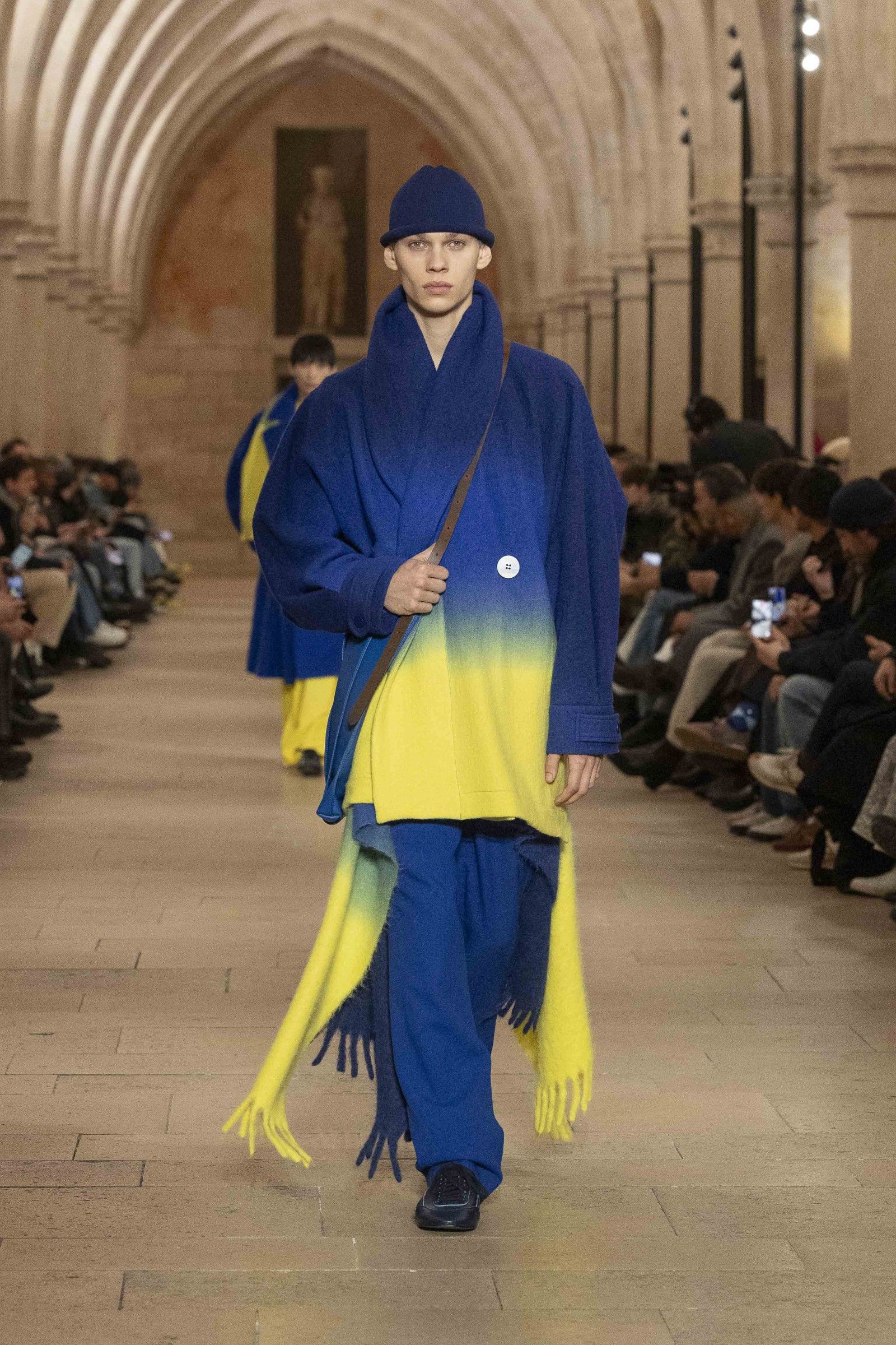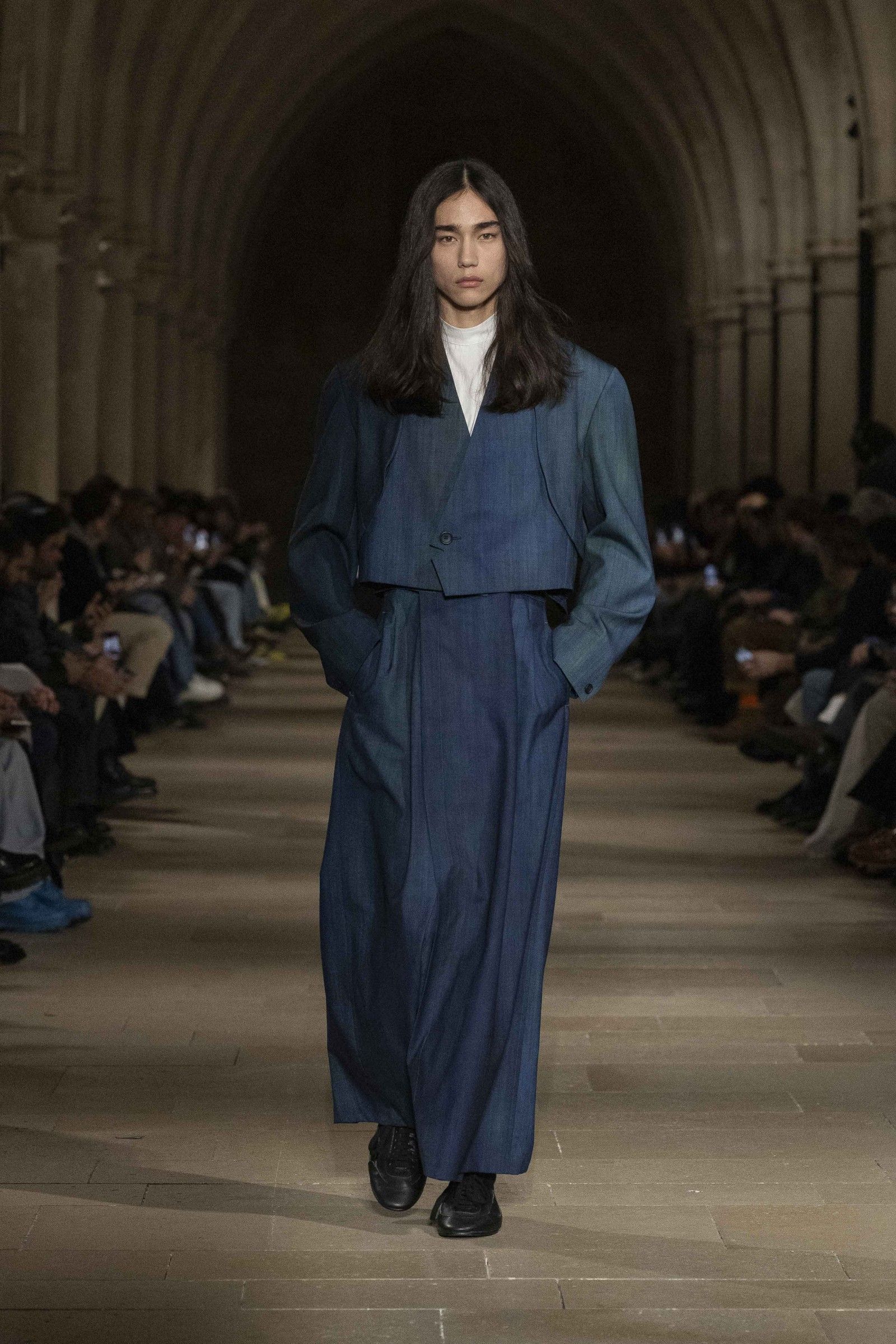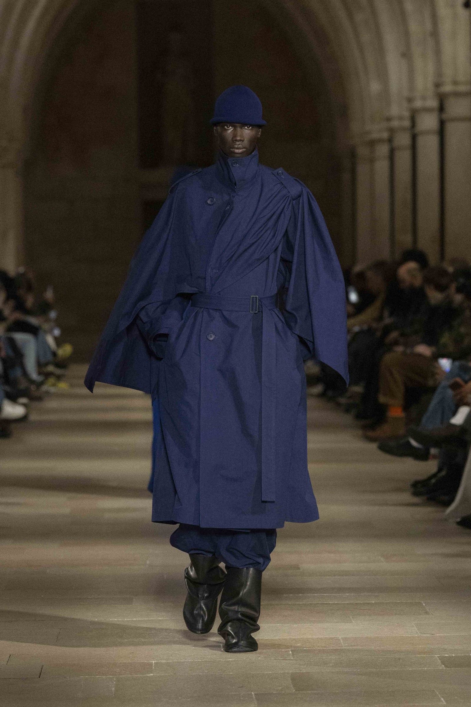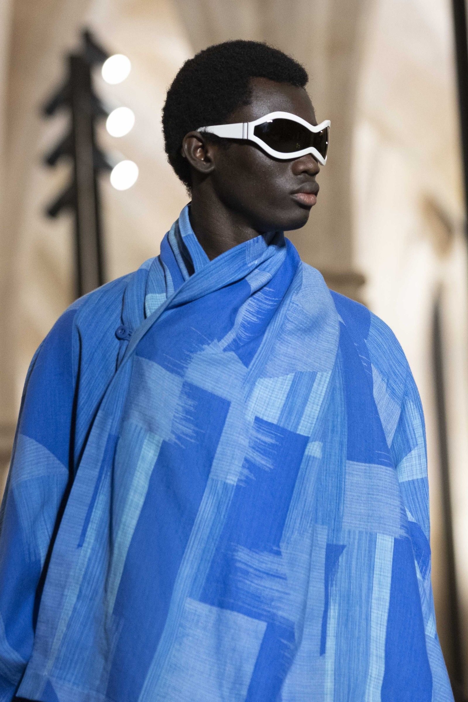 During the show, a sense emerged that formality is not imposed by rigid schemes, but springs from an inner essence, where the abstract beauty of the silhouettes translates into versatile and pragmatic garments, however conventionally elegant. Inspired by the shifting colors of the sky, ranging from the black of night to the violet of dawn and the blue and yellow of midday, the collection turns fabric into a medium for inner expression. The proposal, however, unlike the previous collection, opens a dialogue with traditional men's tailoring that at first glance is recognizable but in reality becomes increasingly experimental look after look.