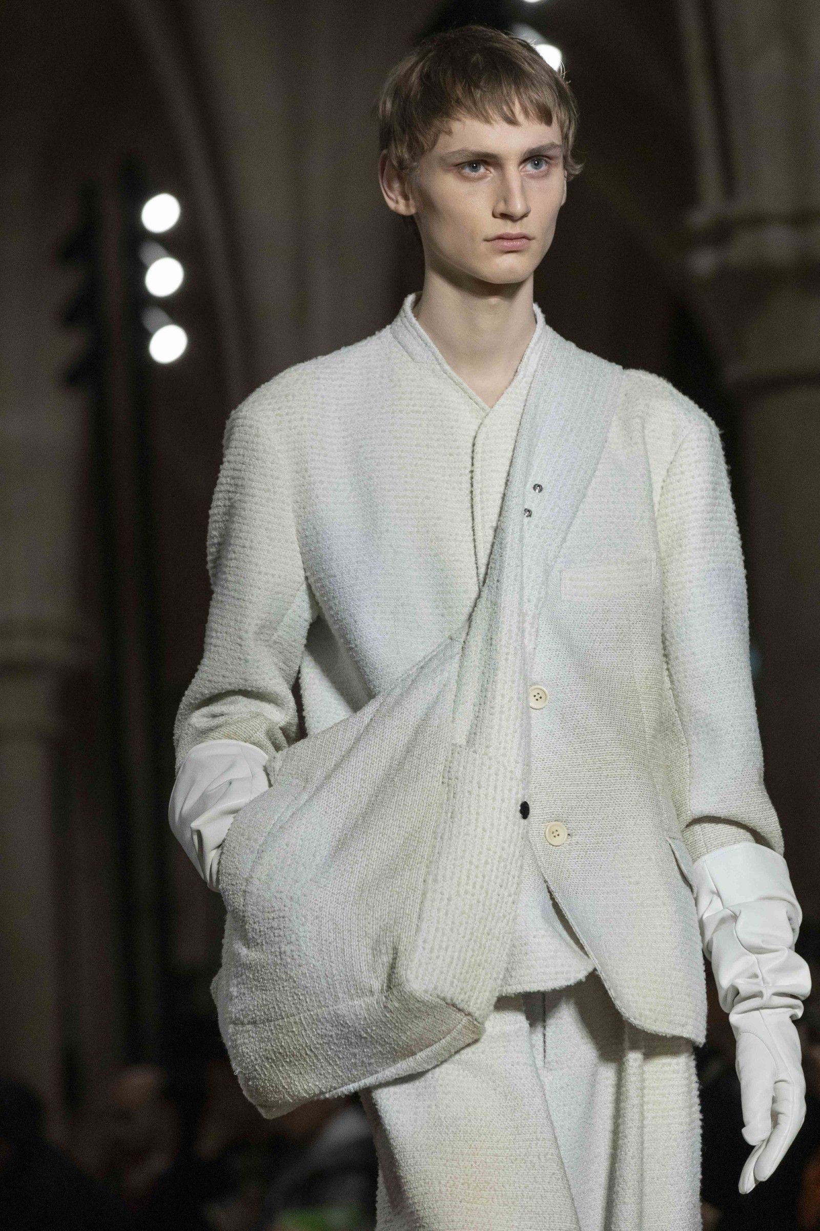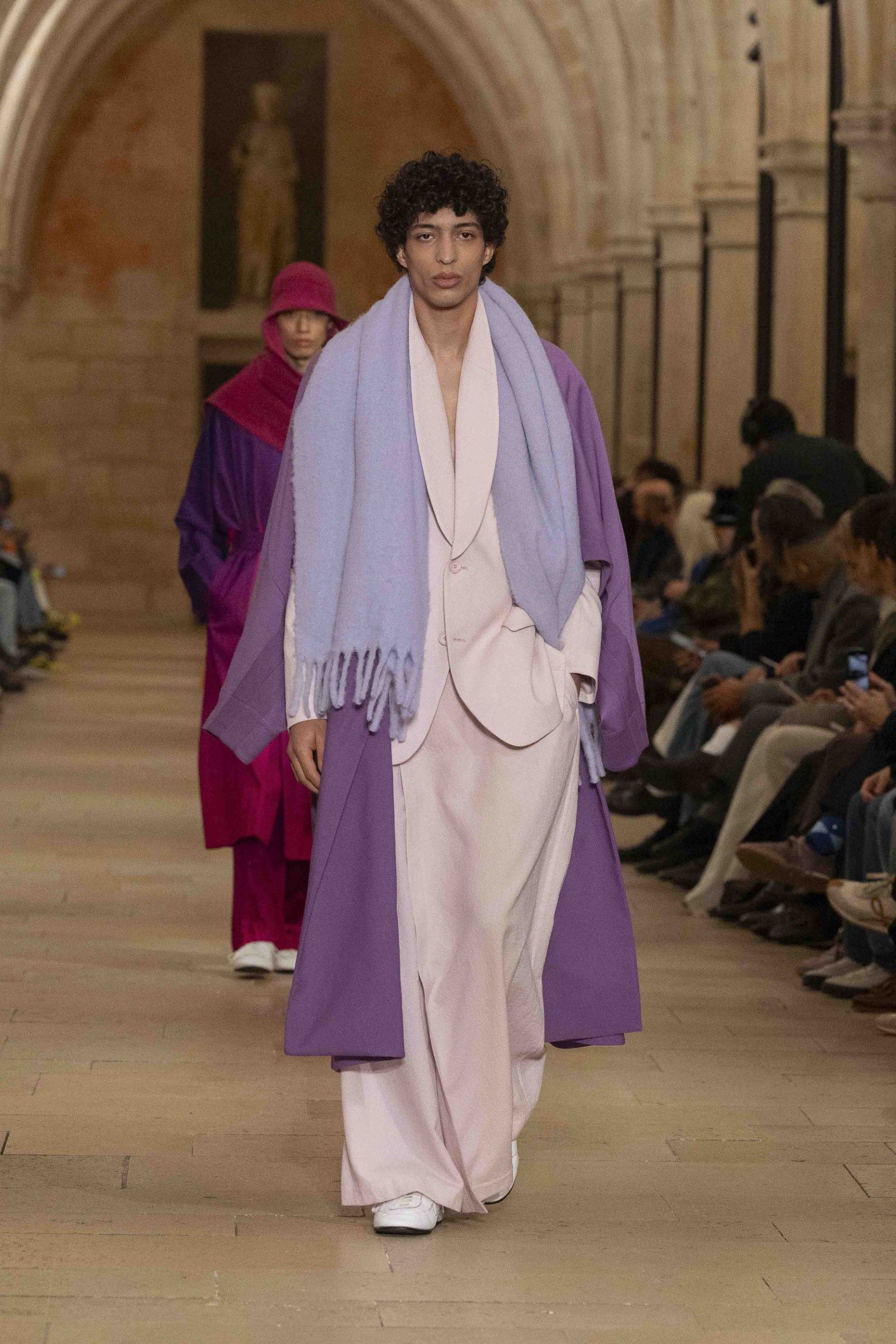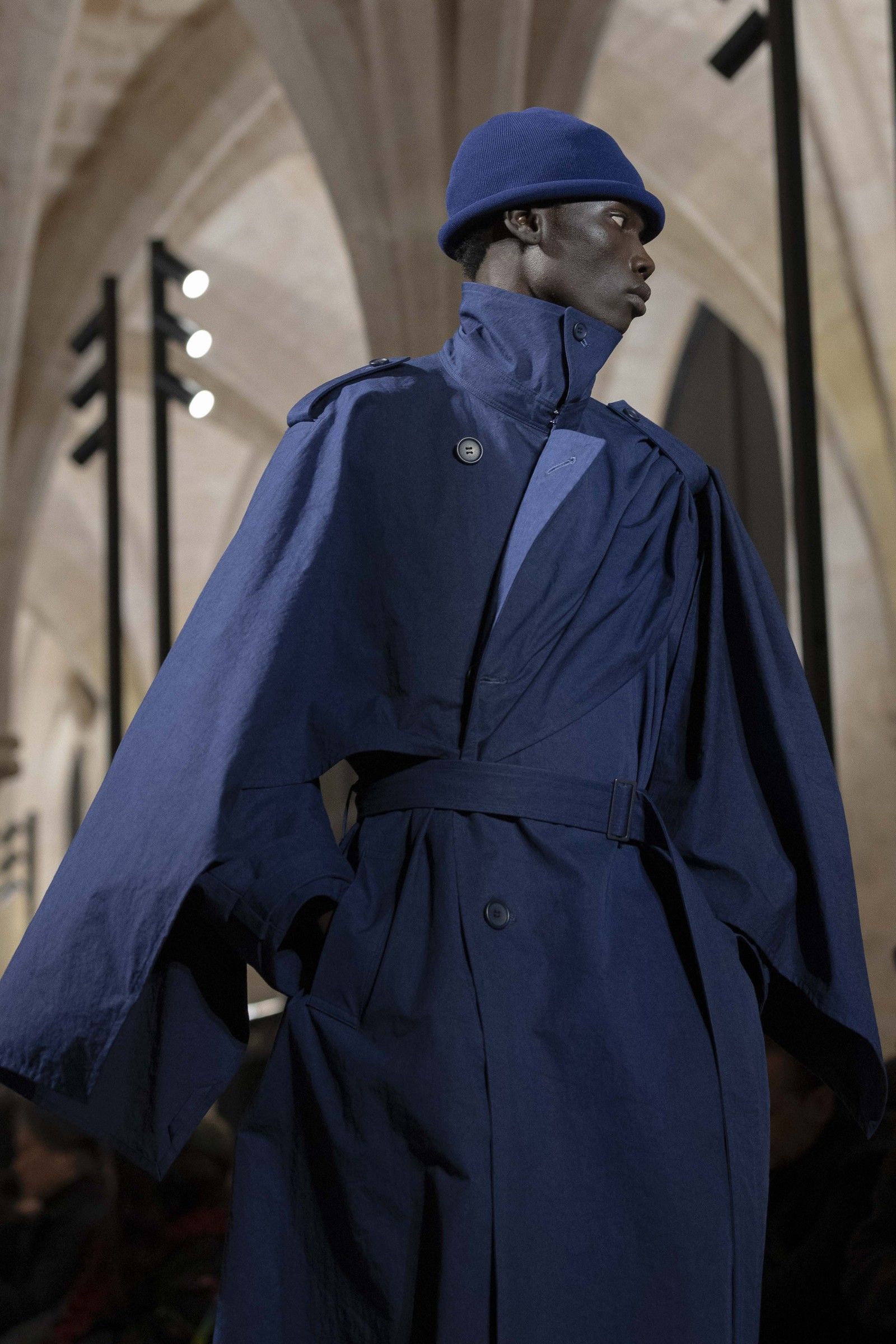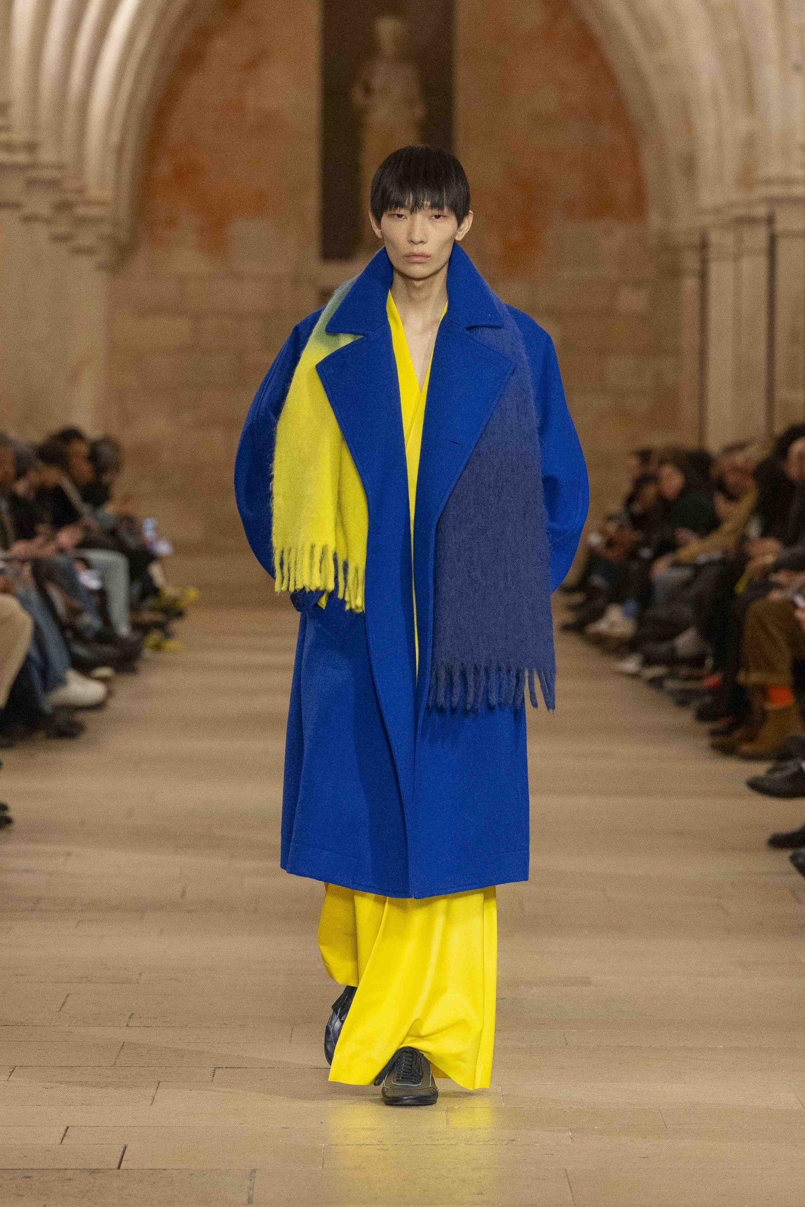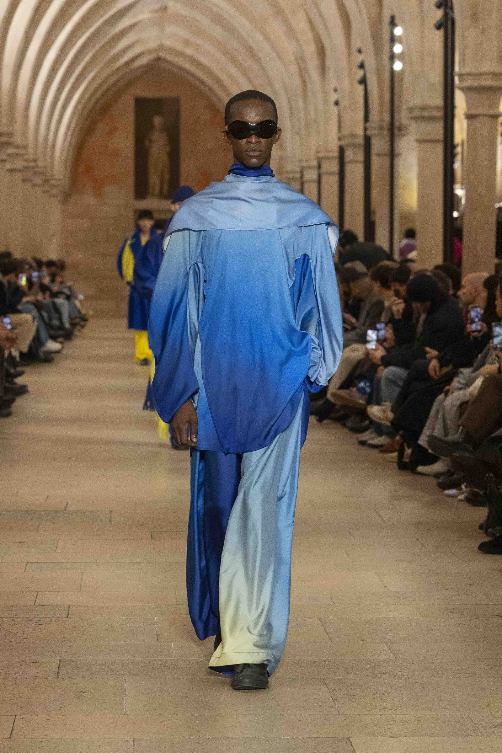 During the show, a sense emerged that formality is not imposed by rigid schemes, but springs from an inner essence, where the abstract beauty of the silhouettes translates into versatile and pragmatic garments, however conventionally elegant. Inspired by the shifting colors of the sky, ranging from the black of night to the violet of dawn and the blue and yellow of midday, the collection turns fabric into a medium for inner expression. The proposal, however, unlike the previous collection, opens a dialogue with traditional men's tailoring that at first glance is recognizable but in reality becomes increasingly experimental look after look.