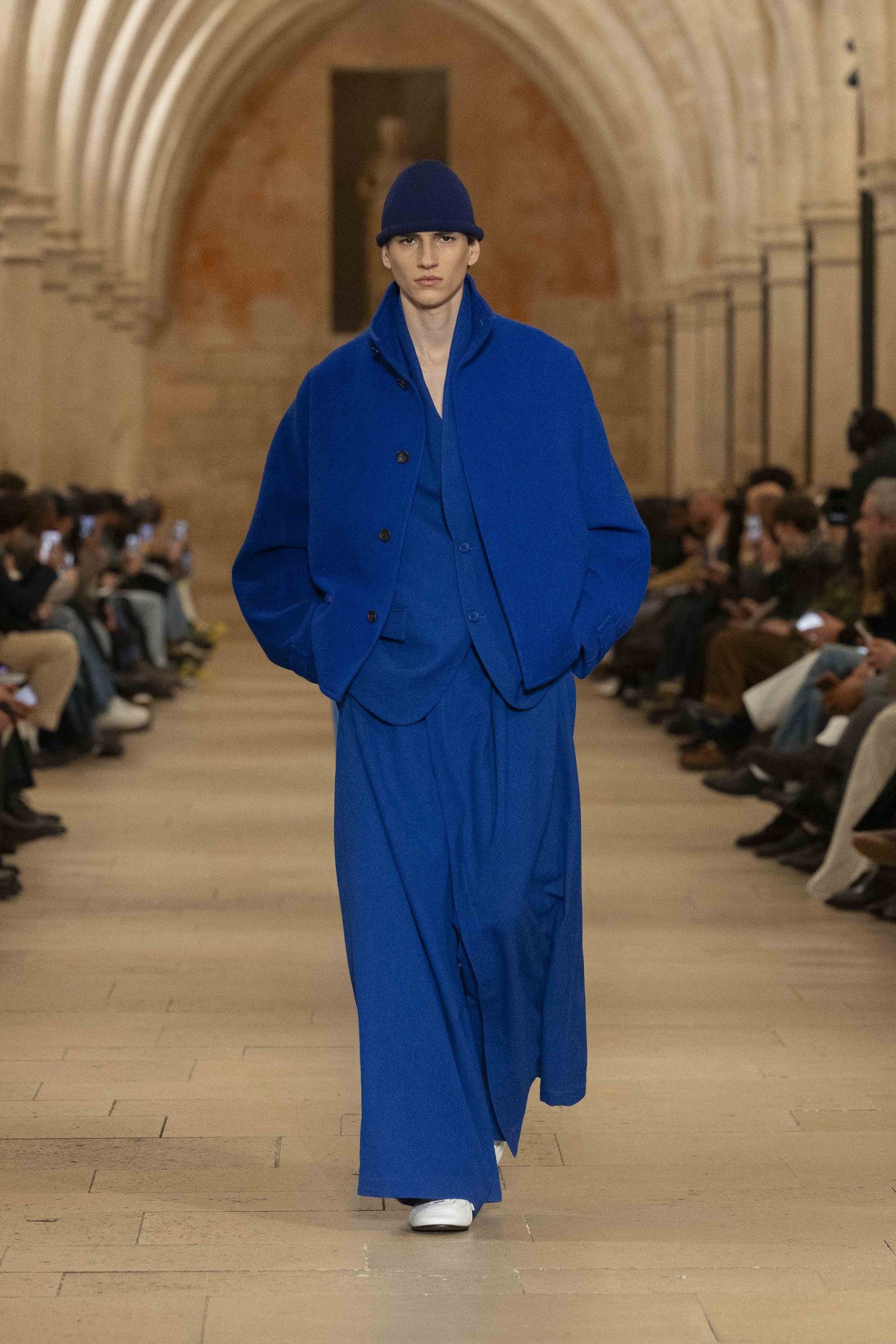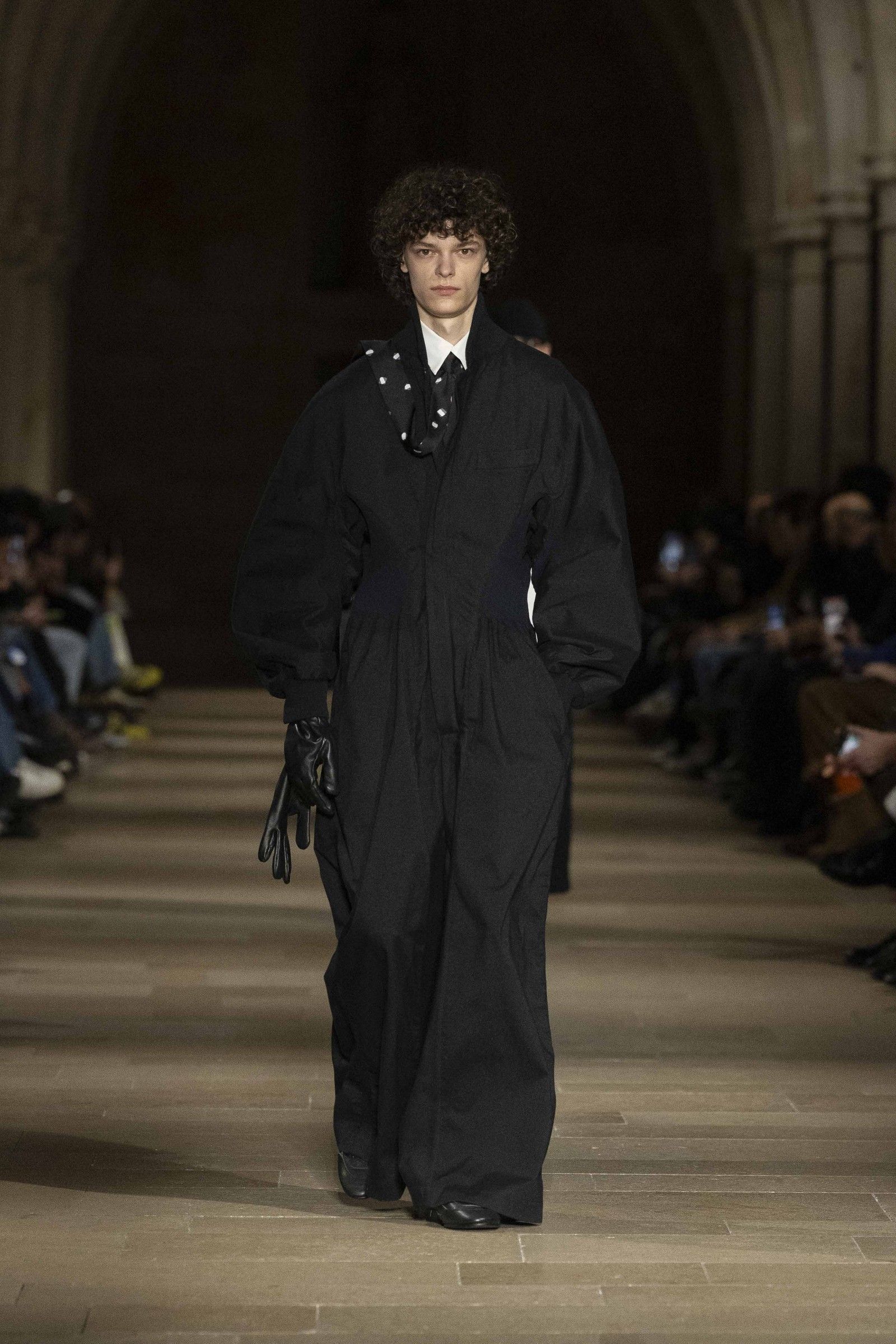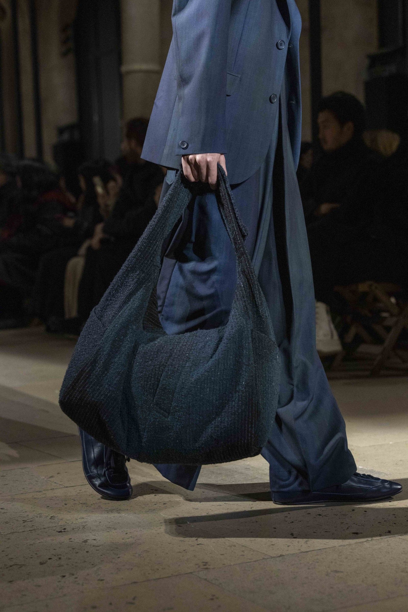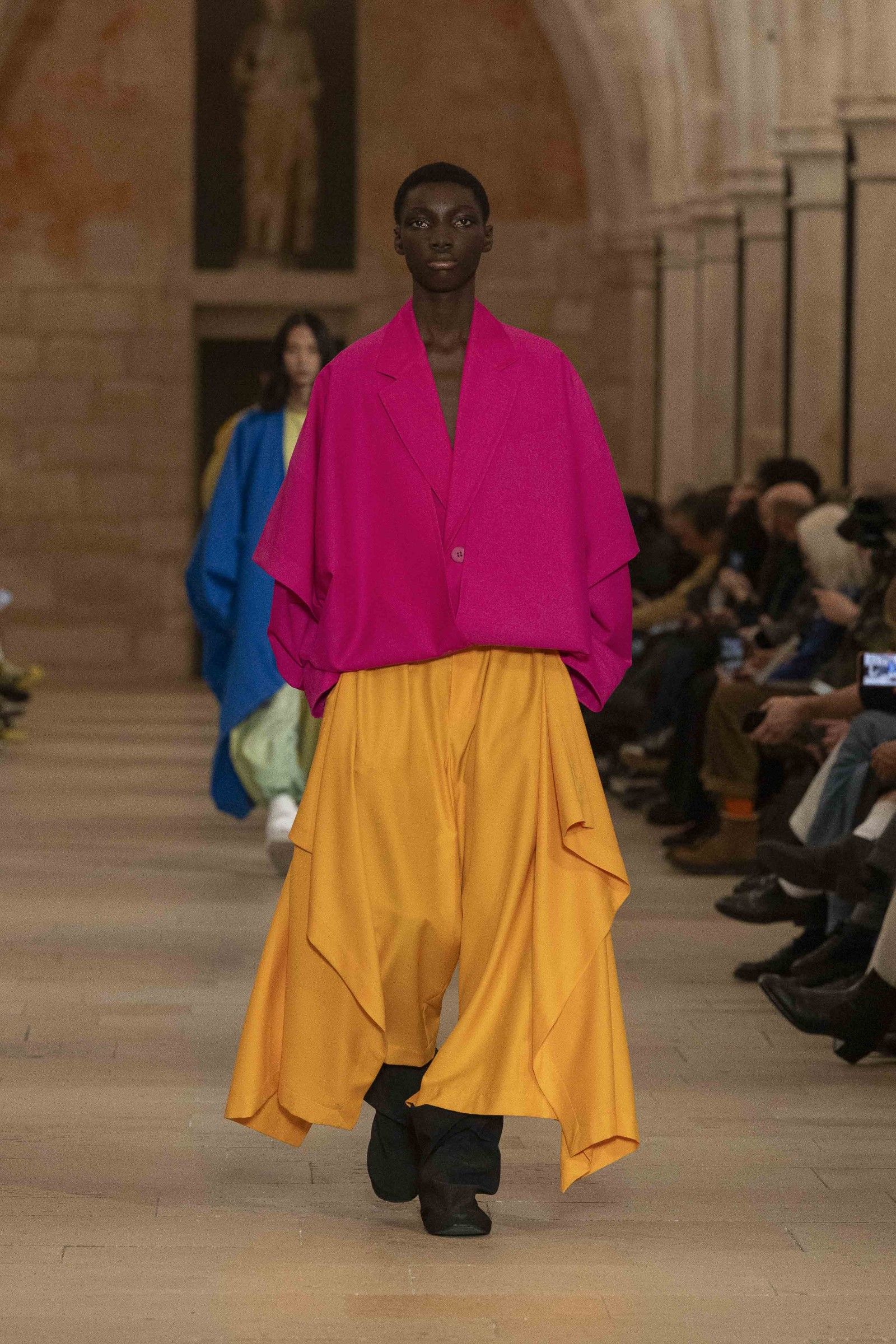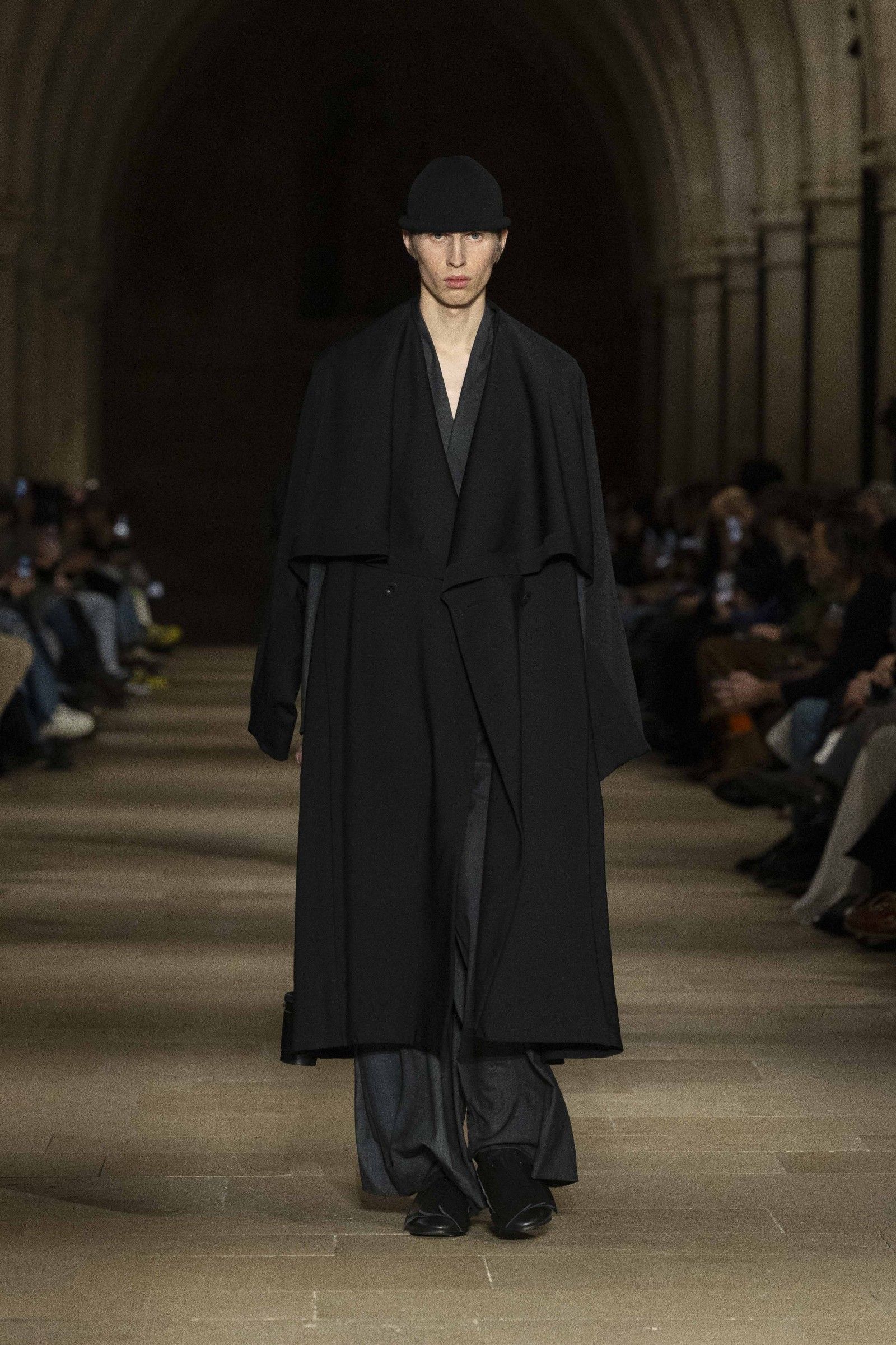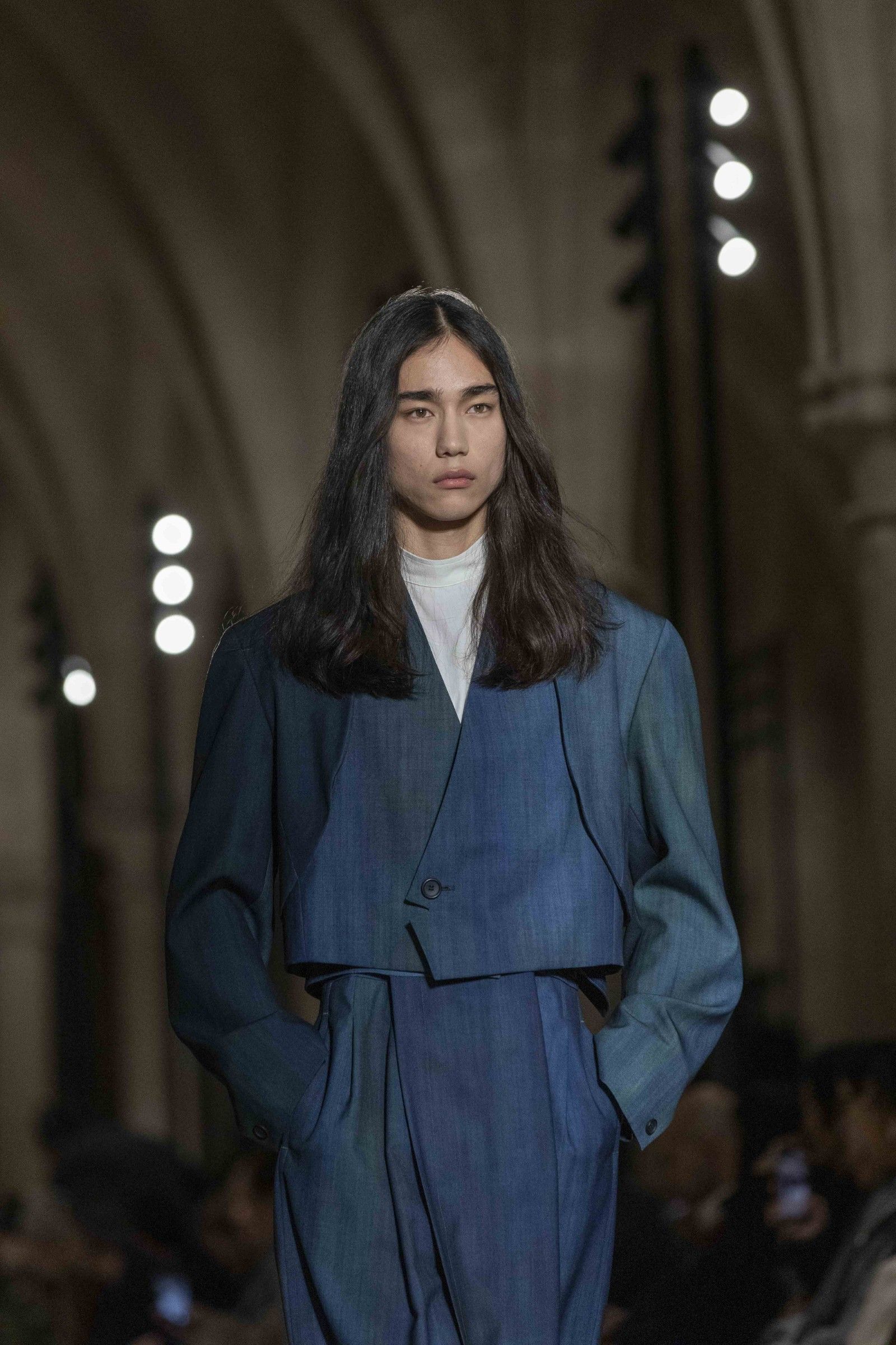 During the show, a sense emerged that formality is not imposed by rigid schemes, but springs from an inner essence, where the abstract beauty of the silhouettes translates into versatile and pragmatic garments, however conventionally elegant. Inspired by the shifting colors of the sky, ranging from the black of night to the violet of dawn and the blue and yellow of midday, the collection turns fabric into a medium for inner expression. The proposal, however, unlike the previous collection, opens a dialogue with traditional men's tailoring that at first glance is recognizable but in reality becomes increasingly experimental look after look.