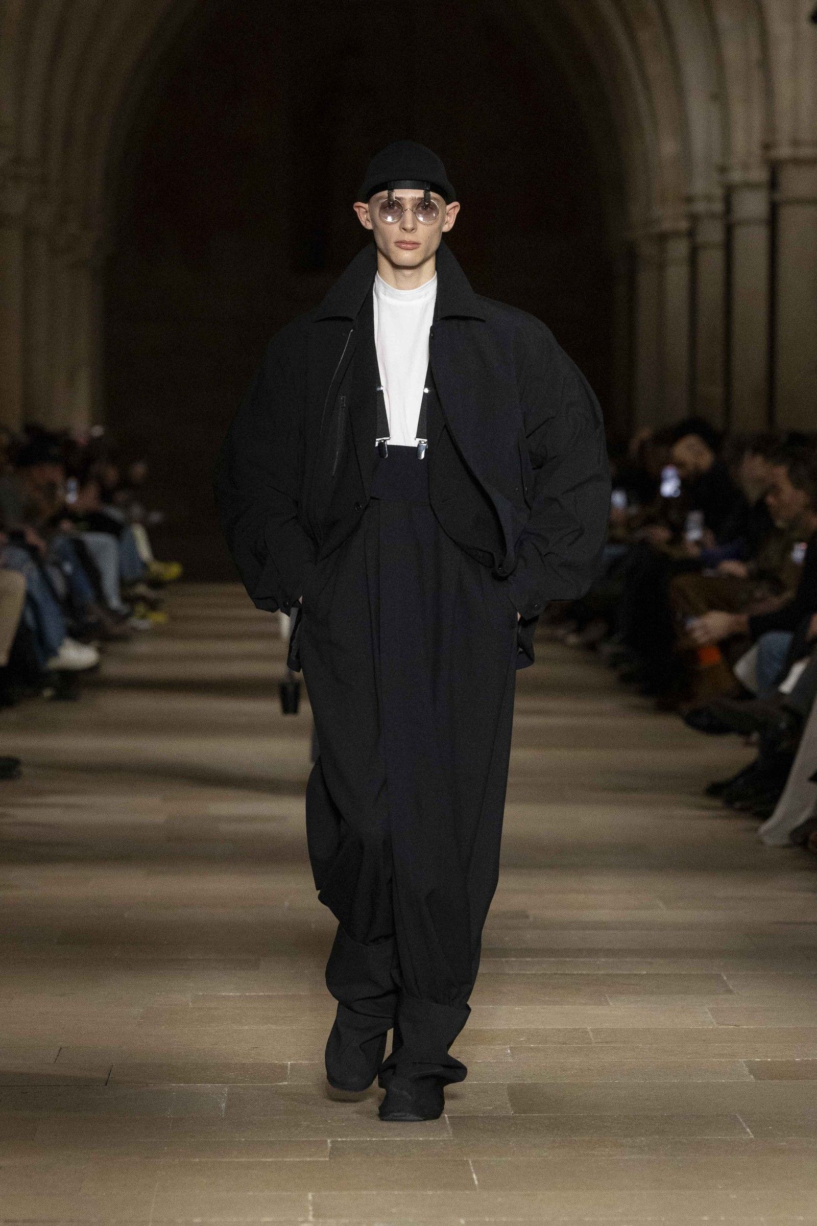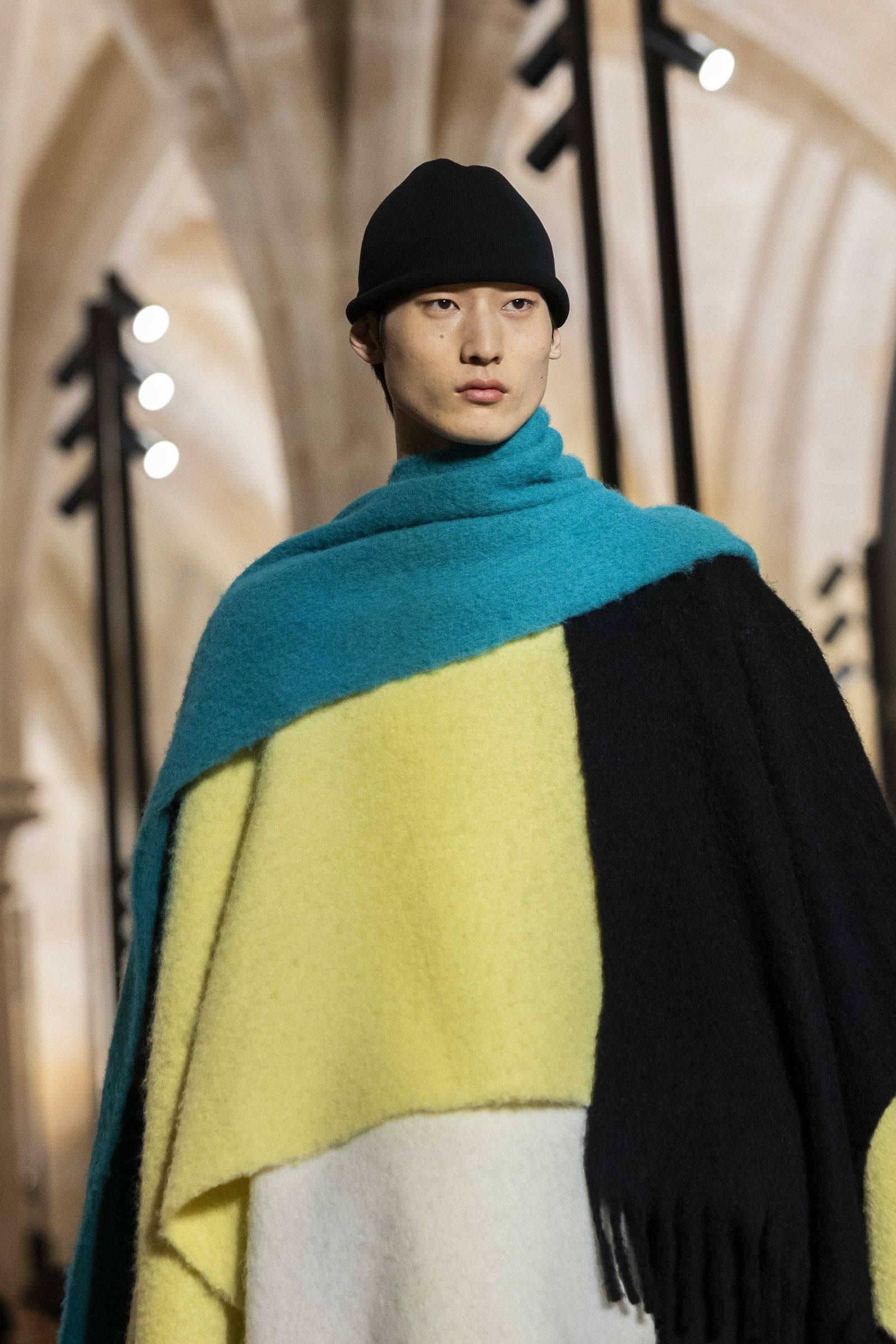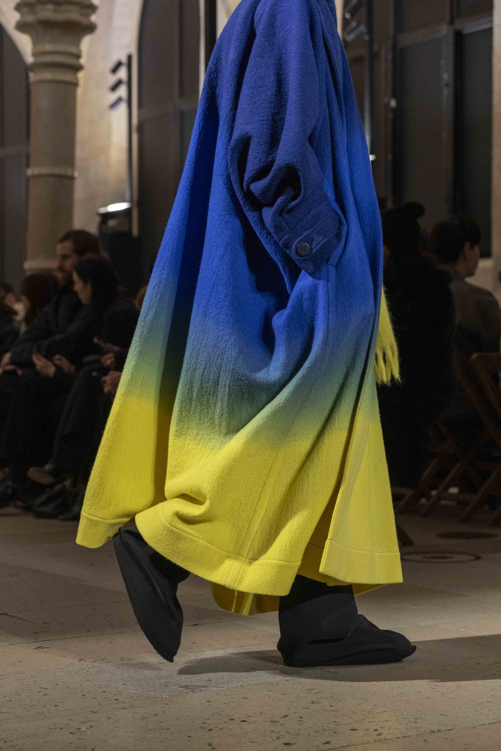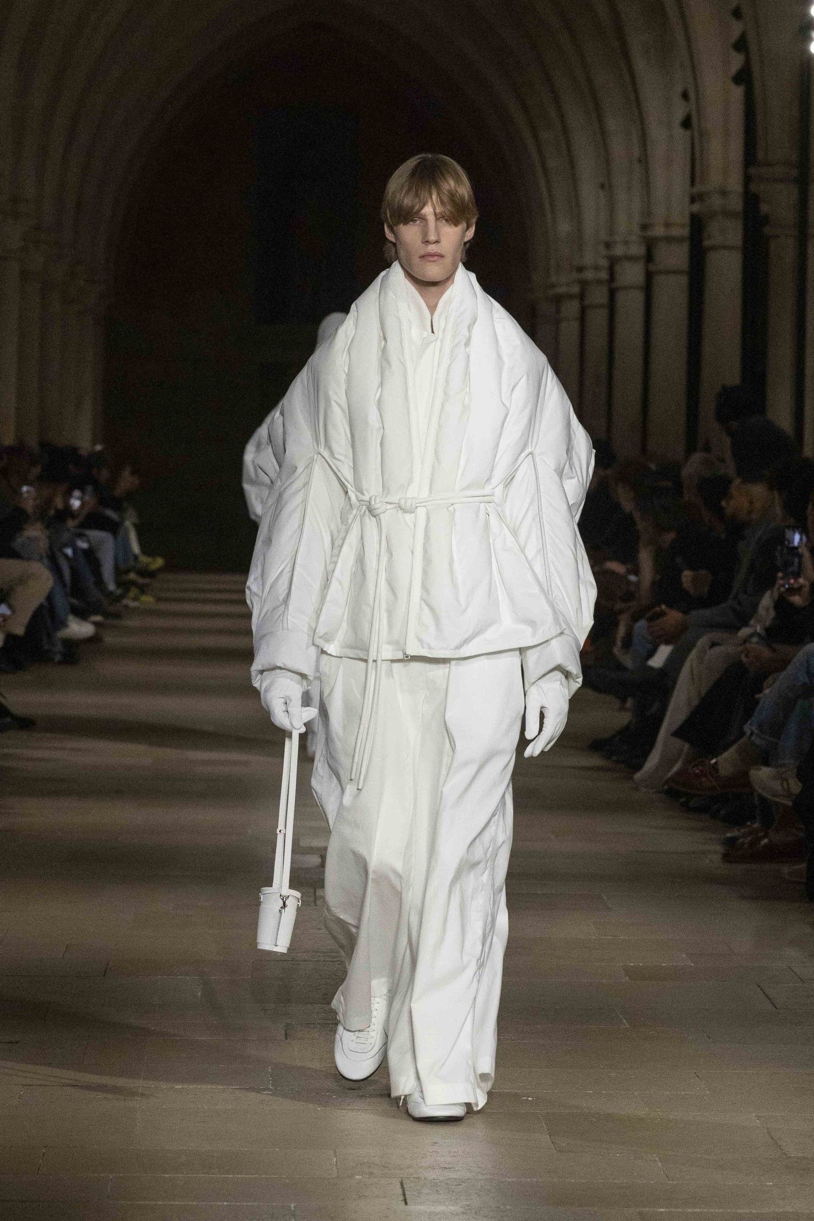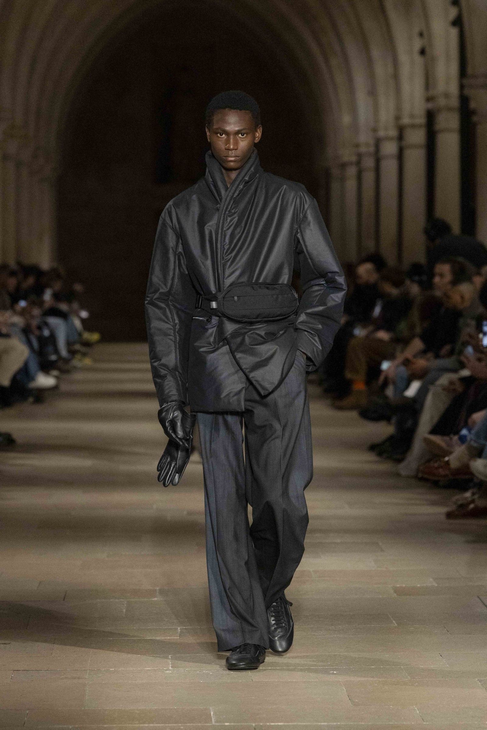 During the show, a sense emerged that formality is not imposed by rigid schemes, but springs from an inner essence, where the abstract beauty of the silhouettes translates into versatile and pragmatic garments, however conventionally elegant. Inspired by the shifting colors of the sky, ranging from the black of night to the violet of dawn and the blue and yellow of midday, the collection turns fabric into a medium for inner expression. The proposal, however, unlike the previous collection, opens a dialogue with traditional men's tailoring that at first glance is recognizable but in reality becomes increasingly experimental look after look.