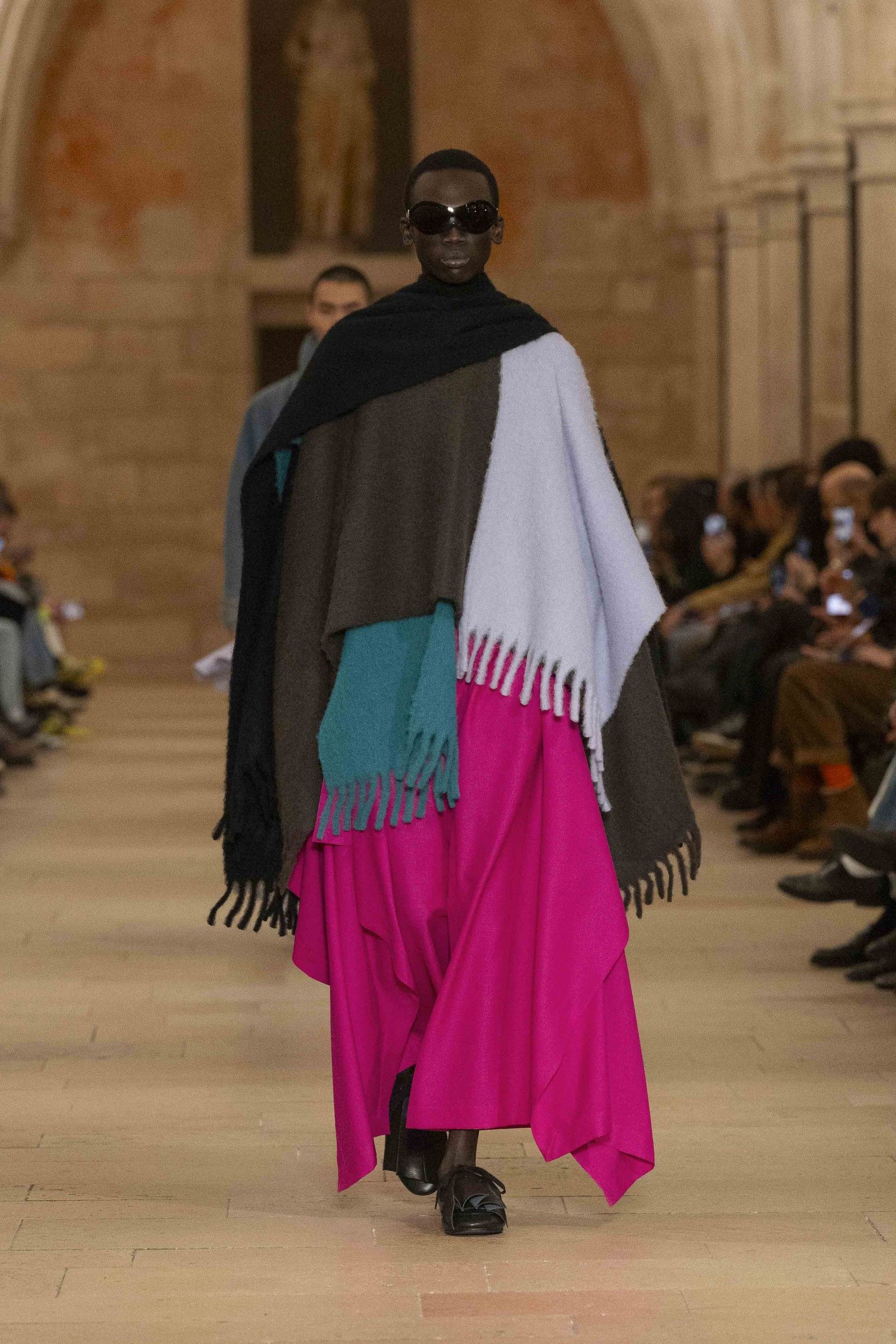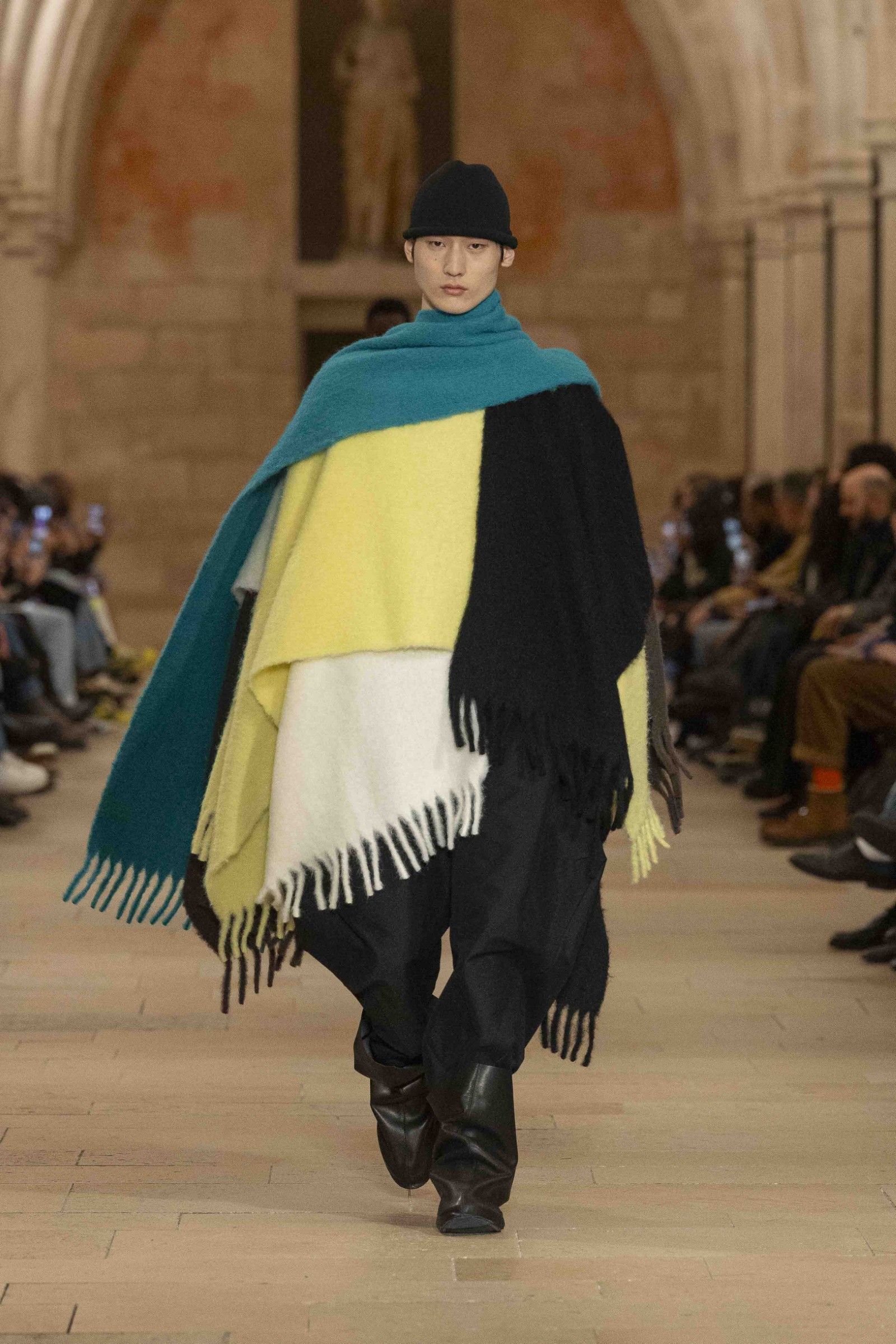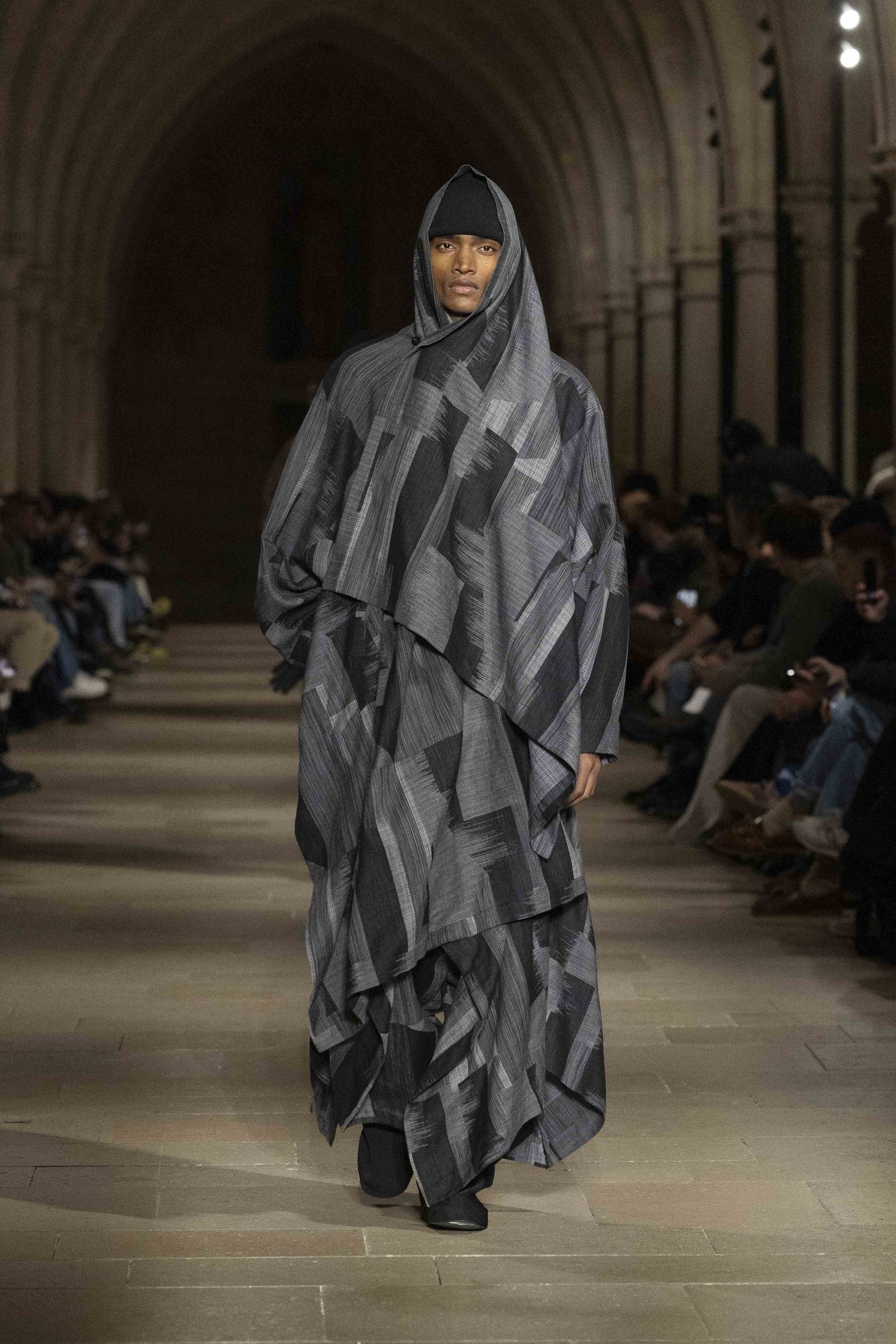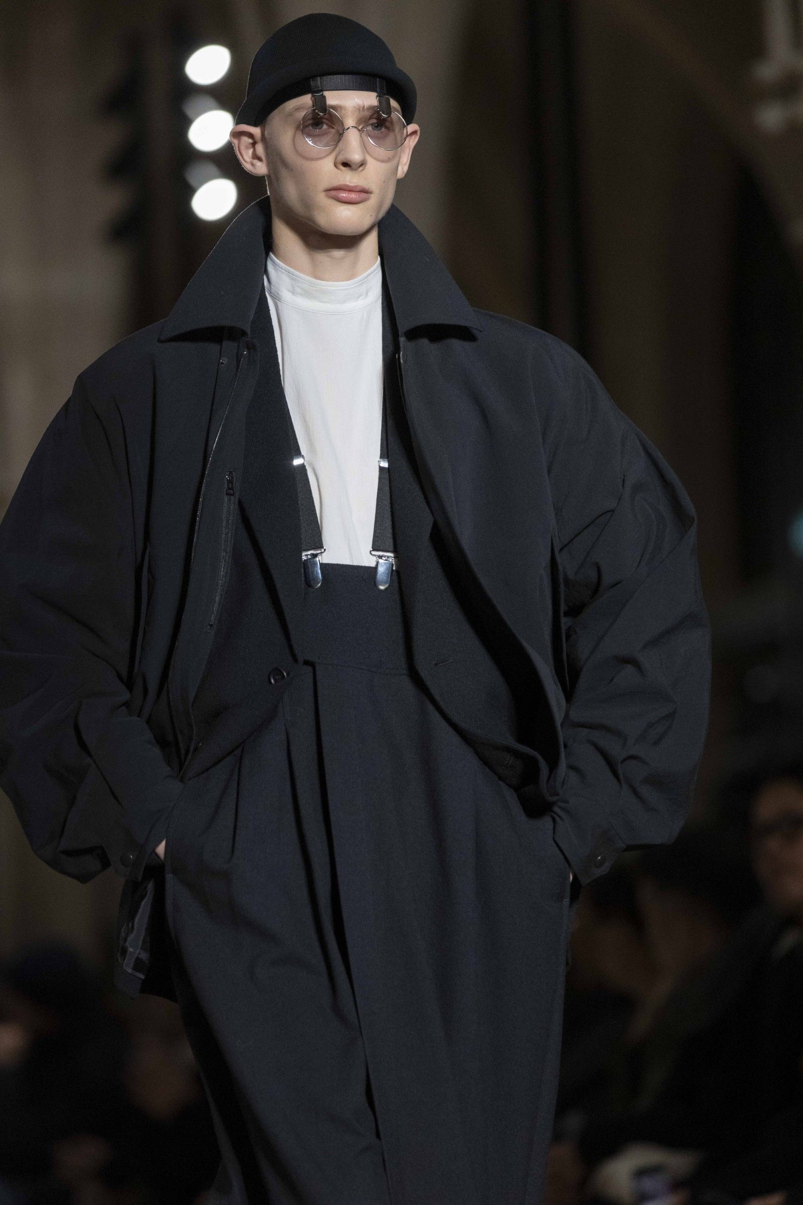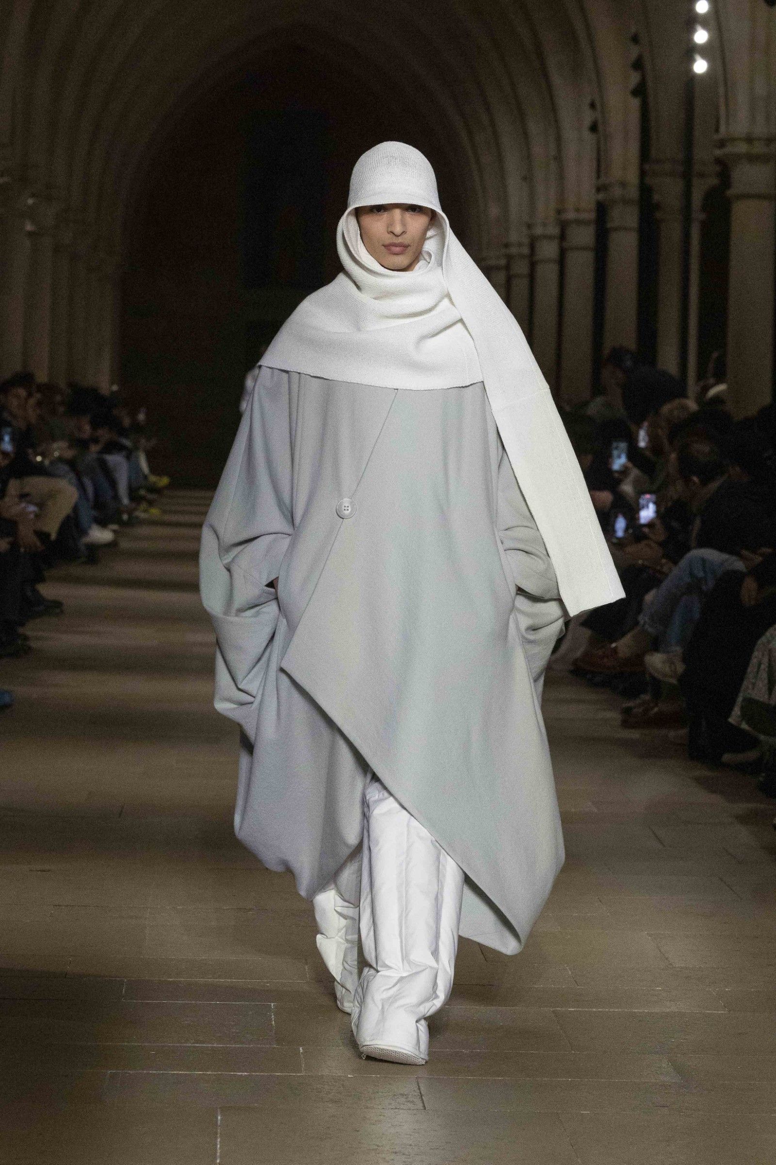 During the show, a sense emerged that formality is not imposed by rigid schemes, but springs from an inner essence, where the abstract beauty of the silhouettes translates into versatile and pragmatic garments, however conventionally elegant. Inspired by the shifting colors of the sky, ranging from the black of night to the violet of dawn and the blue and yellow of midday, the collection turns fabric into a medium for inner expression. The proposal, however, unlike the previous collection, opens a dialogue with traditional men's tailoring that at first glance is recognizable but in reality becomes increasingly experimental look after look.
