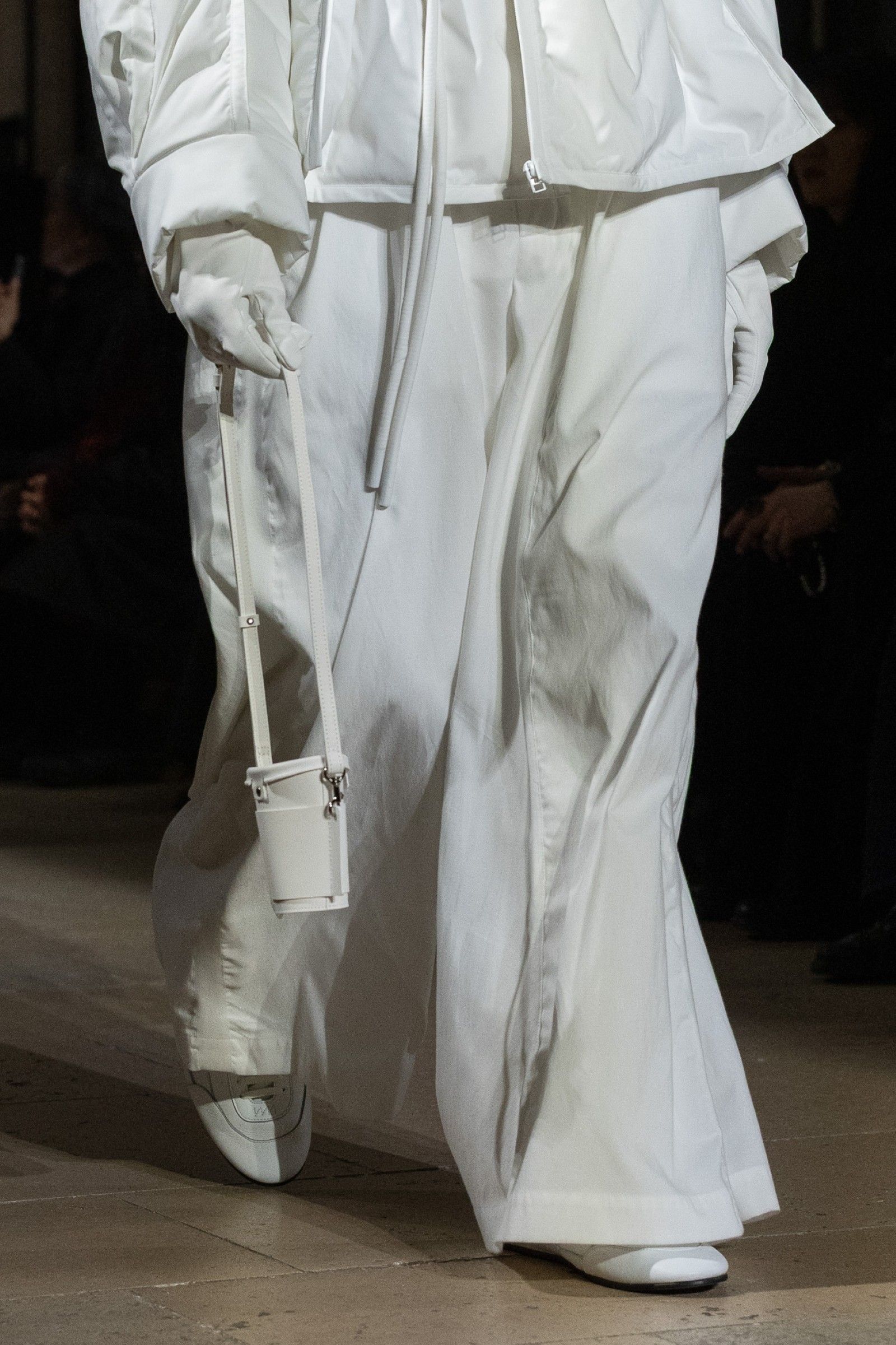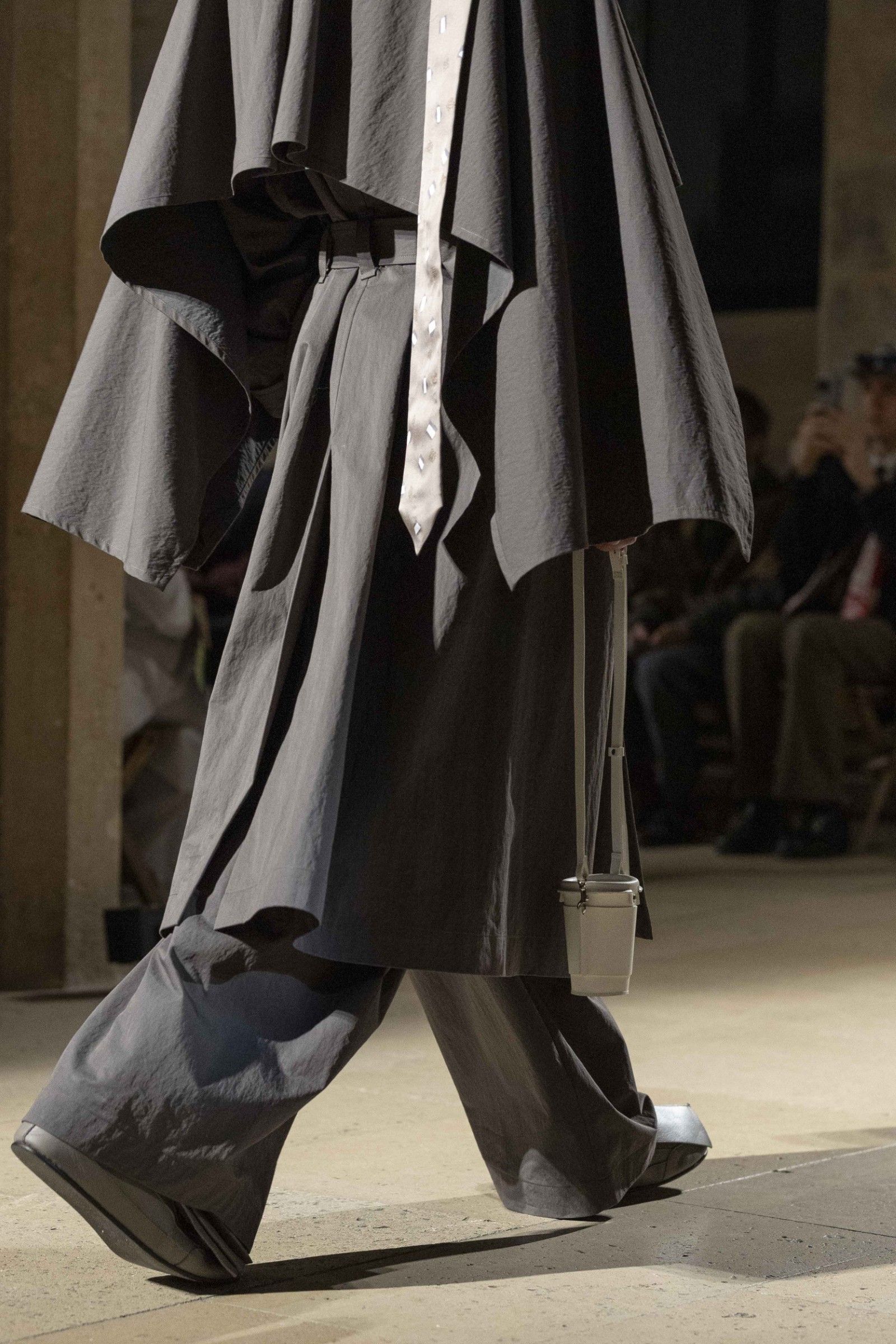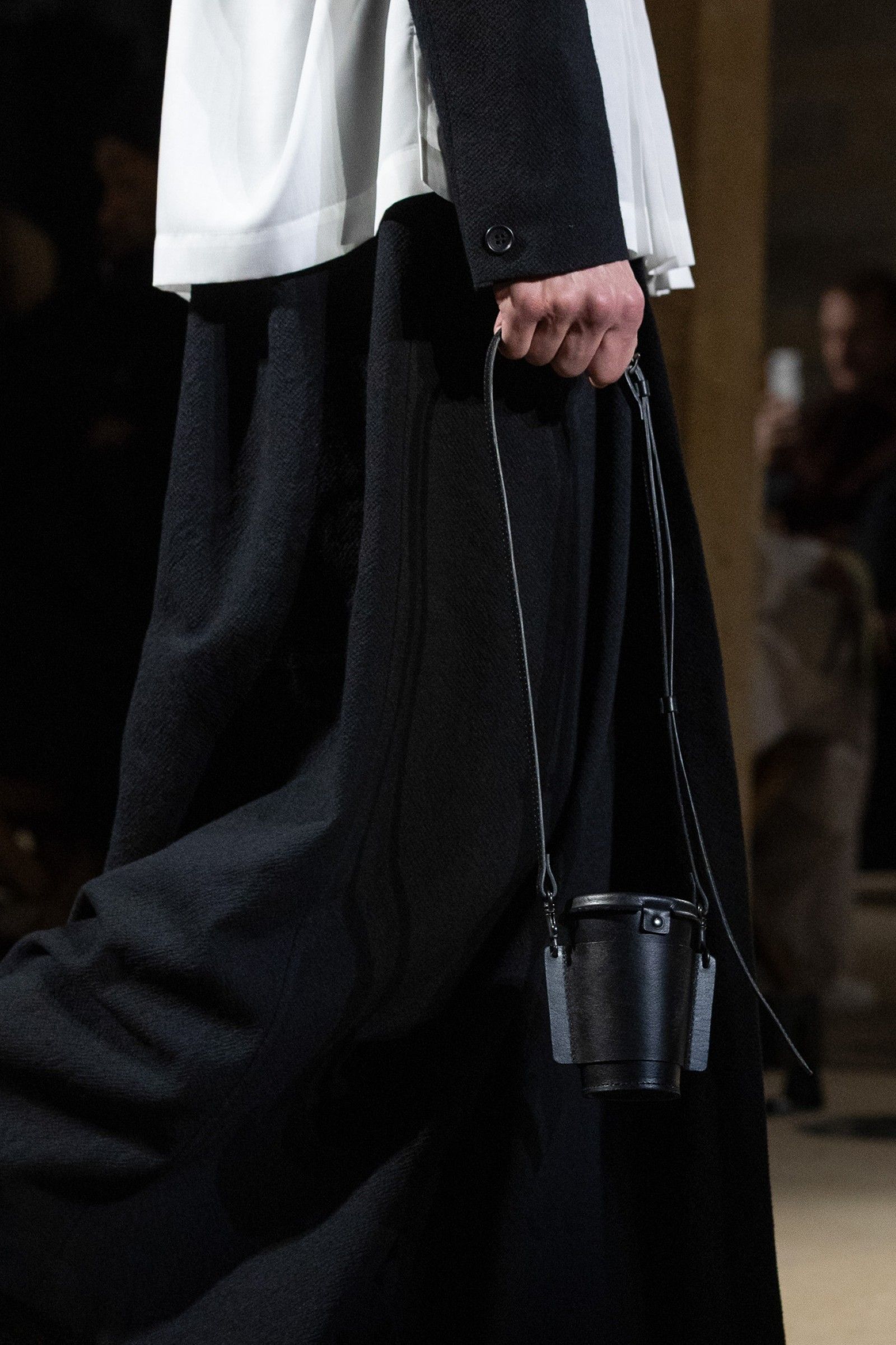 Always complementing the looks, the accessories extend the theme of essential form that dominated the show. There are natural leather bags from the LEATHER PLEATS series constructed in folded leather, soft to the touch and designed to develop a glossy patina over time. But there are also more fun pieces in the TO GO series that remake the shape of disposable coffee cups but in leather, implementing in a more pop way the collection's idea of discovering the hidden beauty of the everyday through garments that adapt to the wearer's life, without formal constraints.
