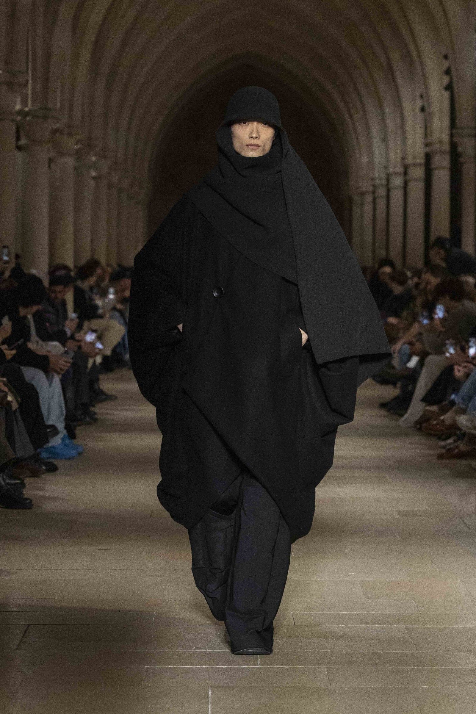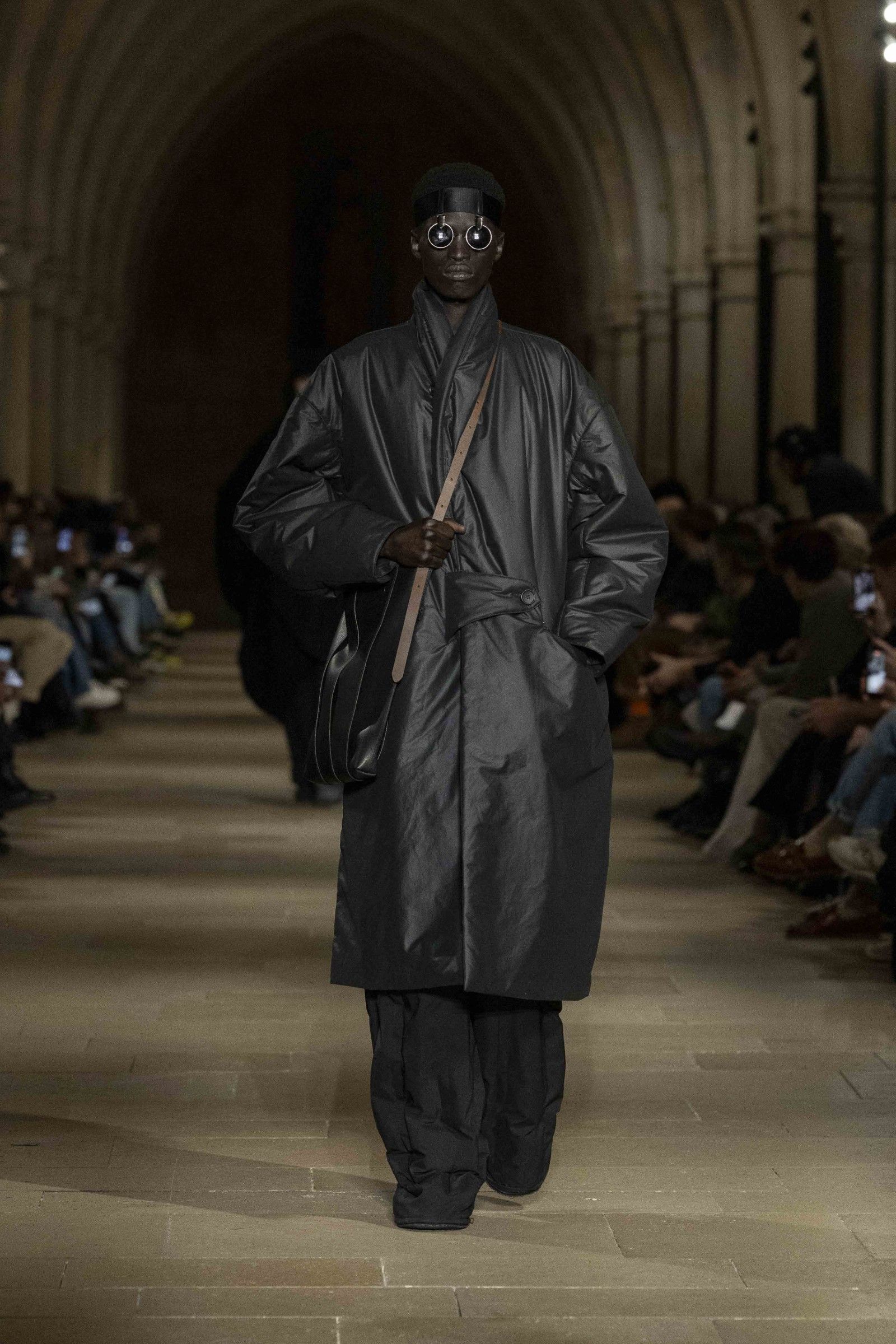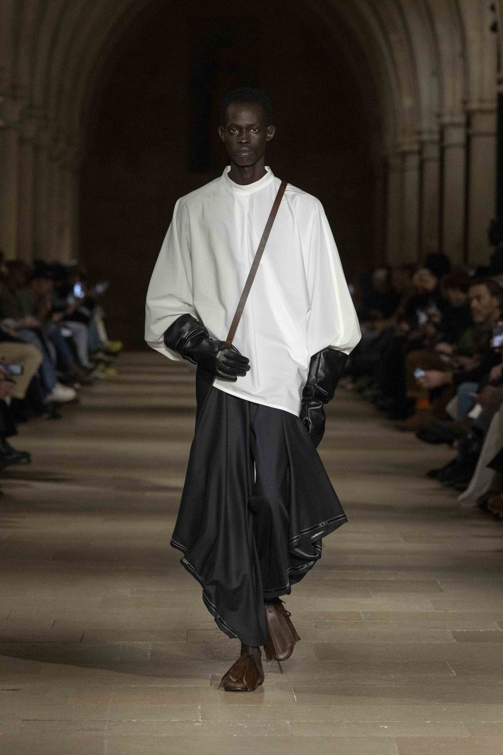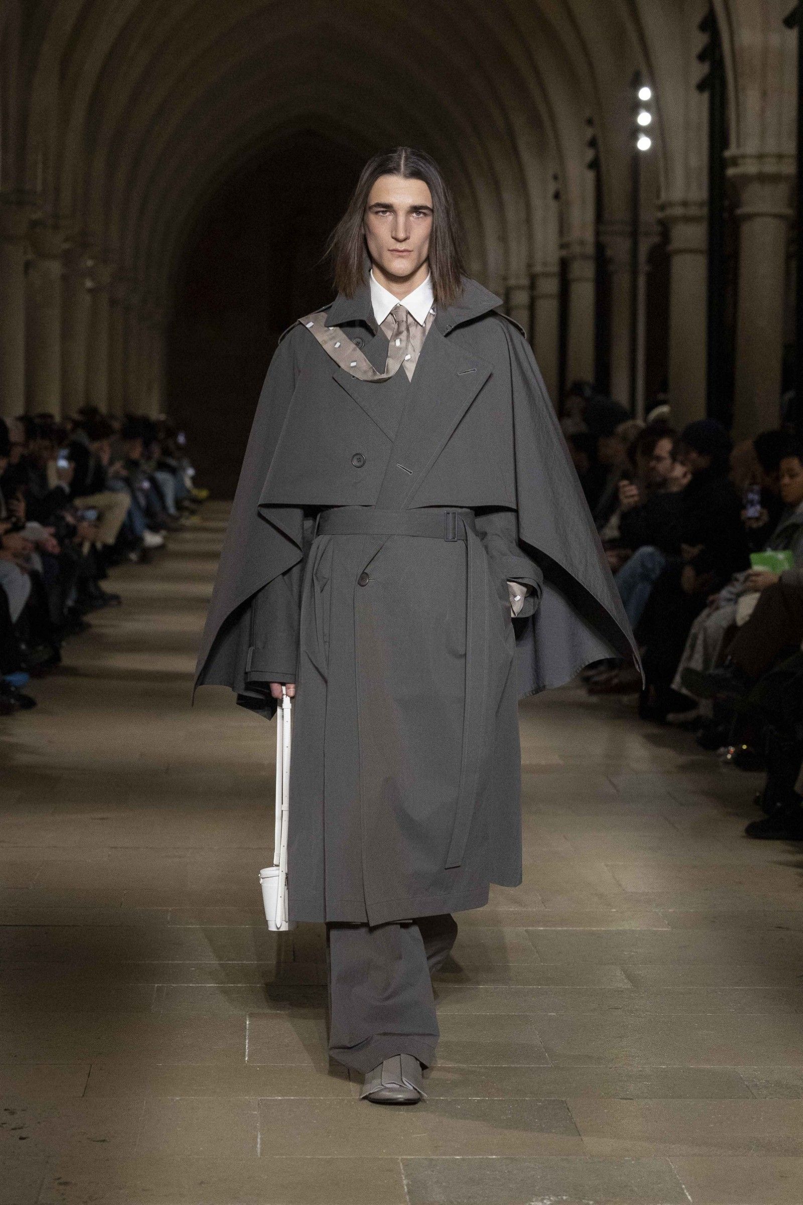 Always complementing the looks, the accessories extend the theme of essential form that dominated the show. There are natural leather bags from the LEATHER PLEATS series constructed in folded leather, soft to the touch and designed to develop a glossy patina over time. But there are also more fun pieces in the TO GO series that remake the shape of disposable coffee cups but in leather, implementing in a more pop way the collection's idea of discovering the hidden beauty of the everyday through garments that adapt to the wearer's life, without formal constraints.