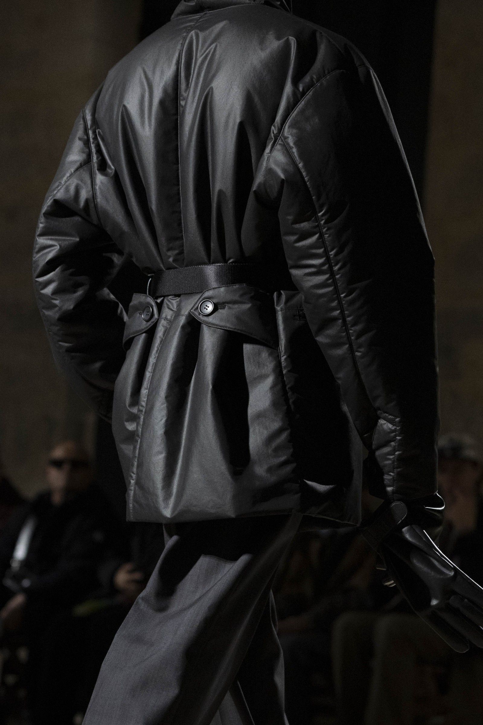 Another chapter of the collection was represented by jackets and blousons, all played on contrasts of materials and the use of historical techniques. A wool line from the FRONT BACK series features matte outer surfaces contrasted with glossy satin interiors. The movement of the sleeves when walking reveals the lining at the collar and cuffs; by removing the sleeves, the garment becomes a long vest, while they can be rolled up as a hood or stole.