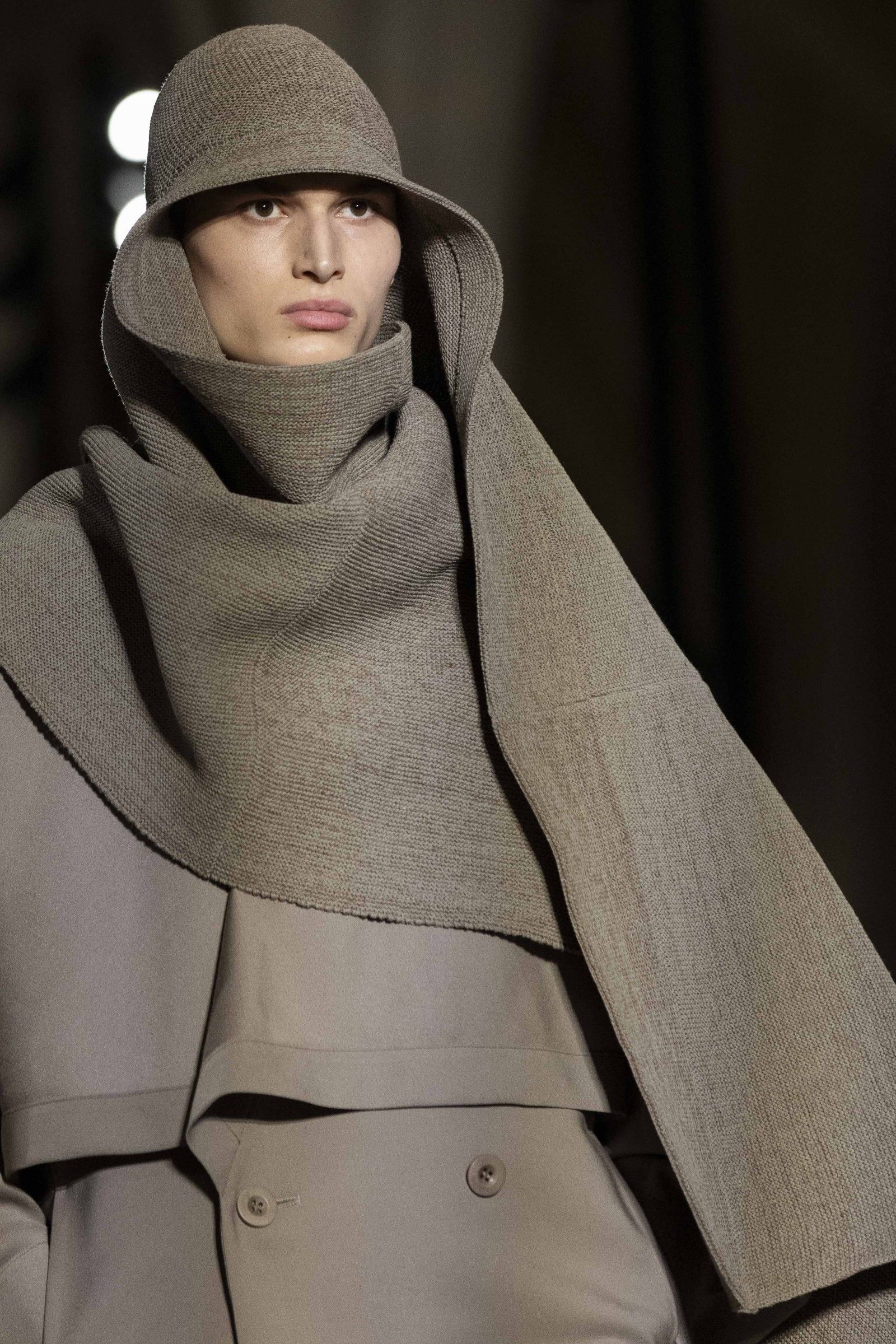 In a sculptural variant of the CLAY series, the fabric then combines flat structures with elastic ribbed sections that contract with heat, forming ever-different silhouettes. An additional cropped line from the GRADATION WOOL series uses individually dyed wool yarns each with its own color and, by opening the side zips, divides into separate ensembles.