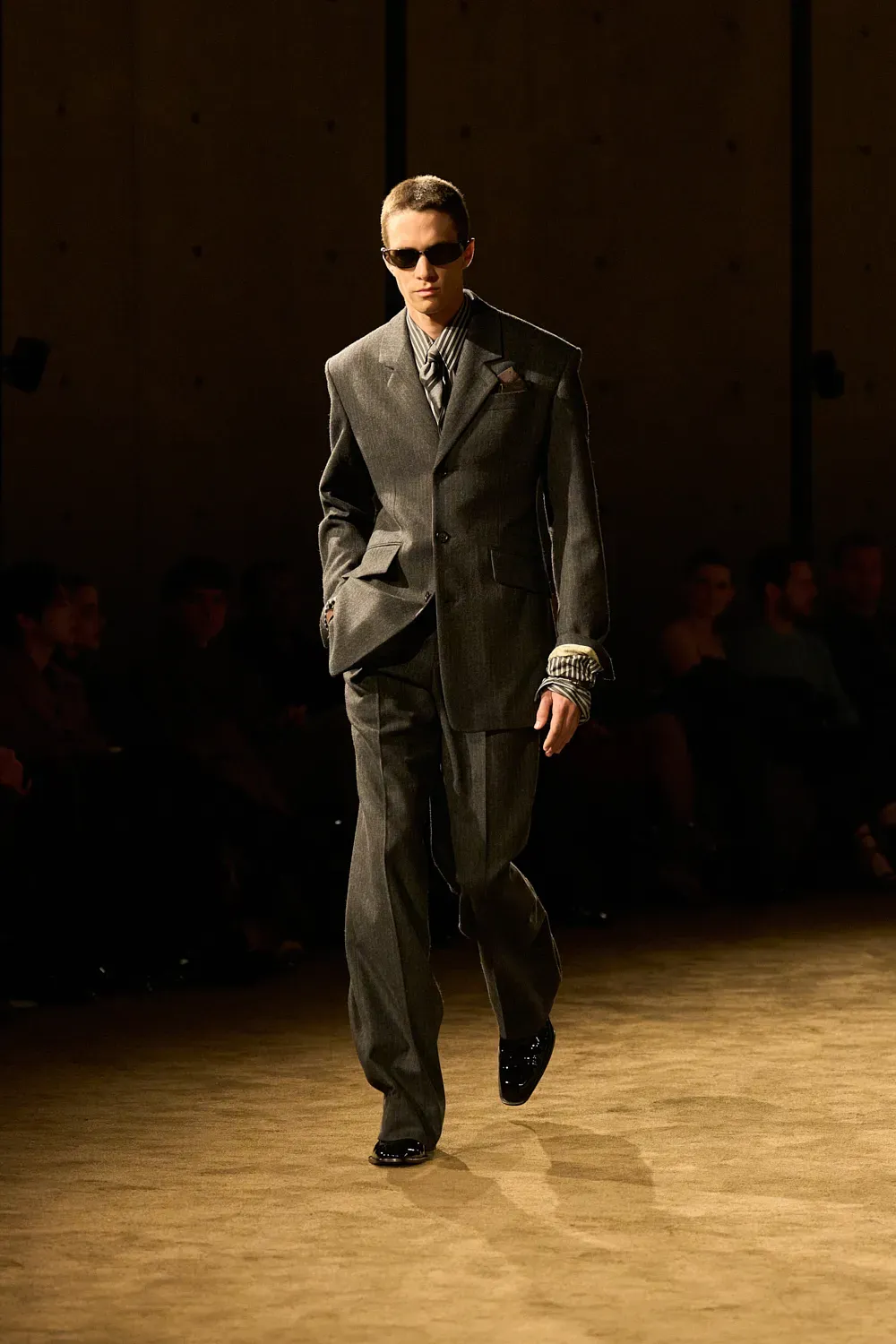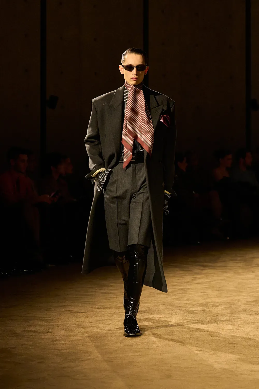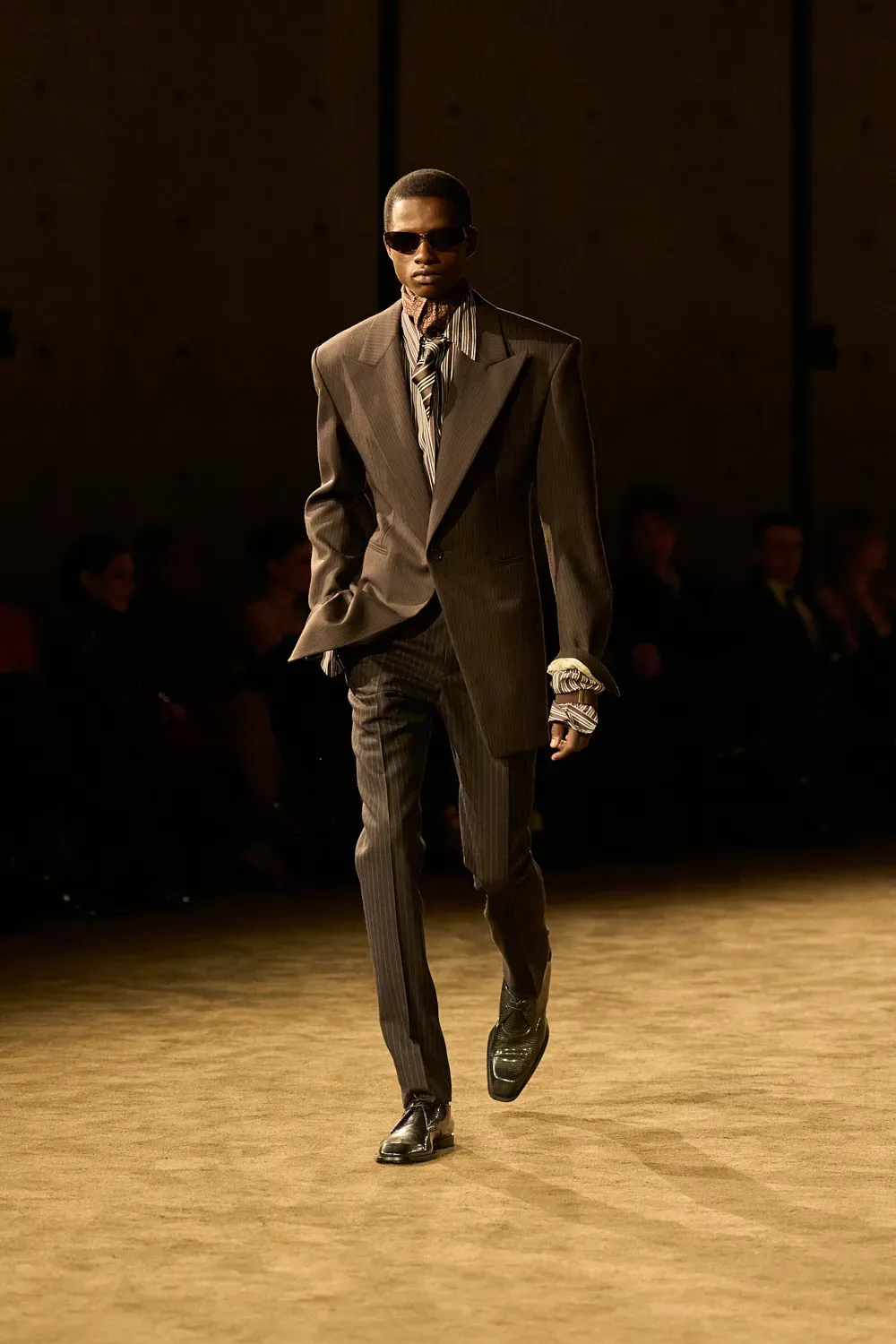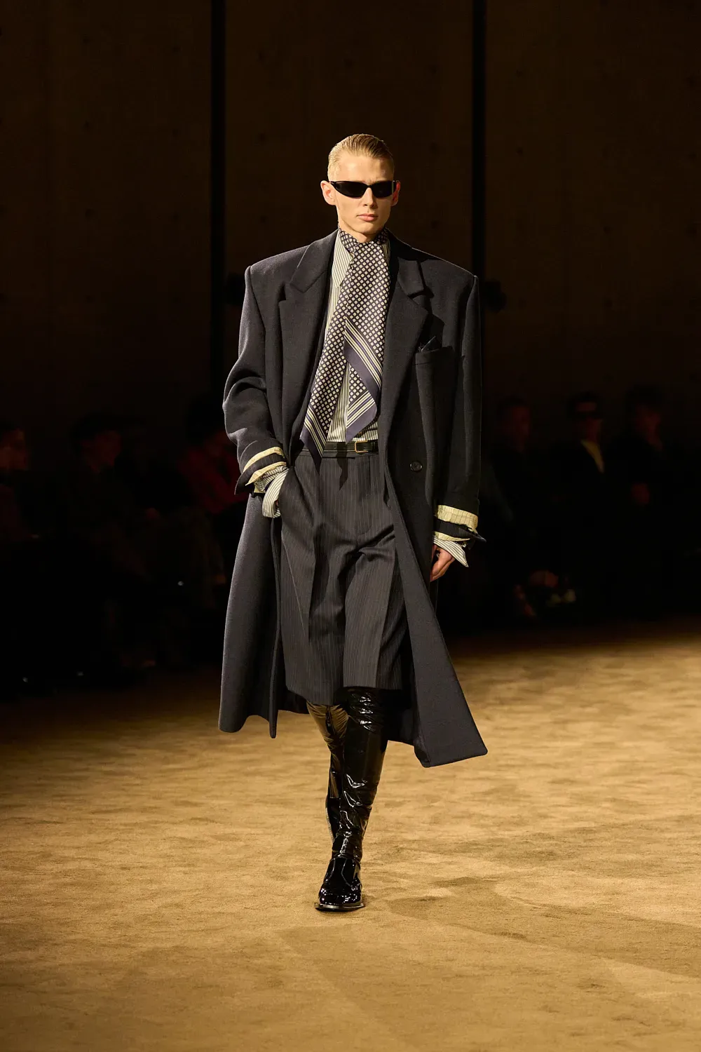 Almost ten years after the start of his creative direction, Vaccarello has finally established and consolidated the ideal look of his man. It is a look, as we said at the beginning, very precise yet open to many different options within its relative limitations. And yesterday it was all on display in the front row: the suits, the fur accents, the sunglasses, the ties and even a whole series of darkly vivid colors that can adapt to almost any personality. Making a suit not look boring is a real feat, which fashion observers often overlook.