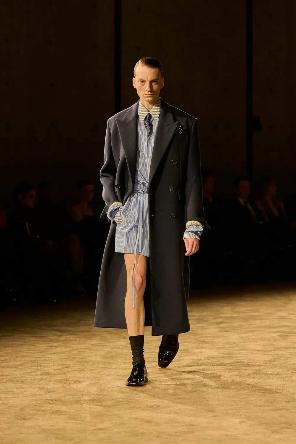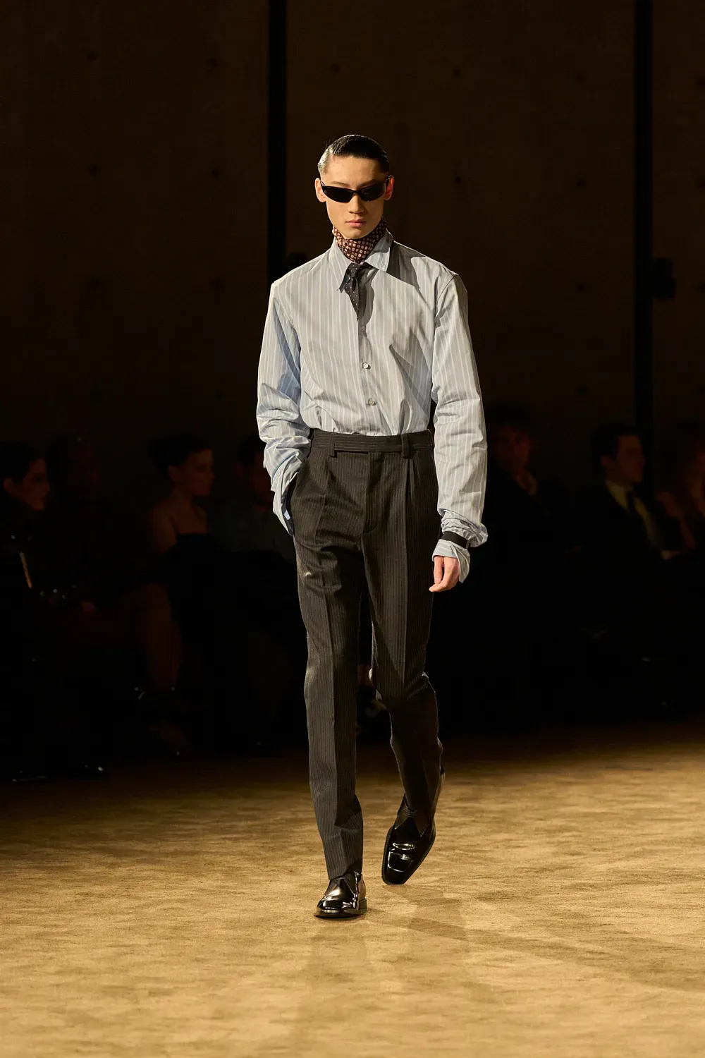 Specifically, the look with striped shirt, tie tucked between the buttons and sunglasses seems to have become a new paradigm for the brand's man, completely emancipated from past influences. It is a look that appears as the most sublimated and pure essence of all previous visions both of Pilati and Slimane, which in comparison seem almost too overloaded and commercial. Yet purity has become so much the hallmark of the brand that the styling flourishes almost seem alien, which during the show turned up blazer sleeves, mixed different pinstripe patterns, piled pocket squares on ties, exposed cuffs held by bracelets and left shirt collars half out and half in that appeared as an adherence to presentation trends more dominant in the industry.