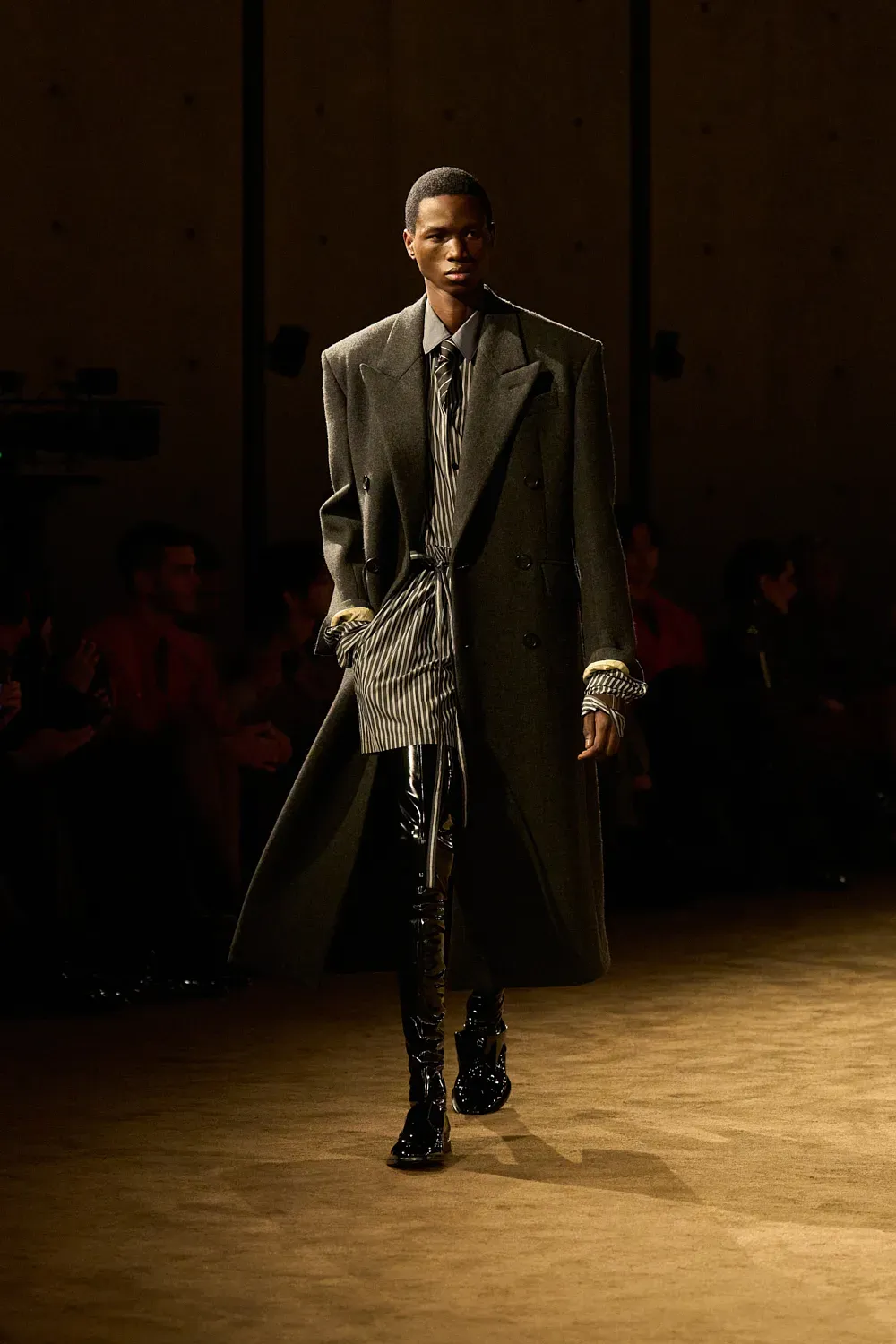Since around 2021, Saint Laurent's menswear collections have been presented as a continuous repetition of the same look subtly varied dozens of times with a seasonal theme ranging from androgyny to power dressing, up to certain ways of wearing a tie or pairing suits with extremely high black leather cuissards. An unusual choice but with clear logic: men go to Saint Laurent for sartorial pieces, leather jackets, boots and loafers – all classic pieces loaded with a nocturnal, androgynous aesthetic full of underground eroticism.